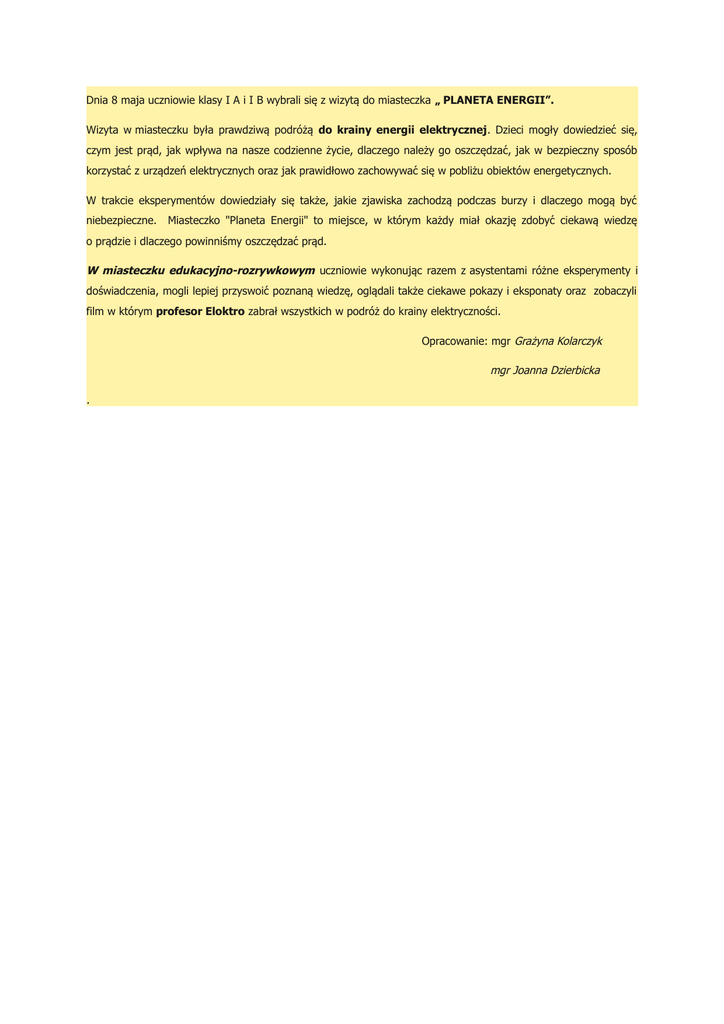Dnia 8 maja uczniowie klasy I A i I B wybrali się z wizytą do miasteczka „ PLANETA ENERGII”. Wizyta w miasteczku była prawdziwą podróżą do krainy energii elektrycznej. Dzieci mogły dowiedzieć się, czym jest prąd, jak wpływa na nasze codzienne życie, dlaczego należy go oszczędzać, jak w bezpieczny sposób korzystać z urządzeń elektrycznych oraz jak prawidłowo zachowywać się w pobliżu obiektów energetycznych. W trakcie eksperymentów dowiedziały się także, jakie zjawiska zachodzą podczas burzy i dlaczego mogą być niebezpieczne. Miasteczko "Planeta Energii" to miejsce, w którym każdy miał okazję zdobyć ciekawą wiedzę o prądzie i dlaczego powinniśmy oszczędzać prąd. W miasteczku edukacyjno-rozrywkowym uczniowie wykonując razem z asystentami różne eksperymenty i doświadczenia, mogli lepiej przyswoić poznaną wiedzę, oglądali także ciekawe pokazy i eksponaty oraz zobaczyli film w którym profesor Eloktro zabrał wszystkich w podróż do krainy elektryczności. Opracowanie: mgr Grażyna Kolarczyk mgr Joanna Dzierbicka .