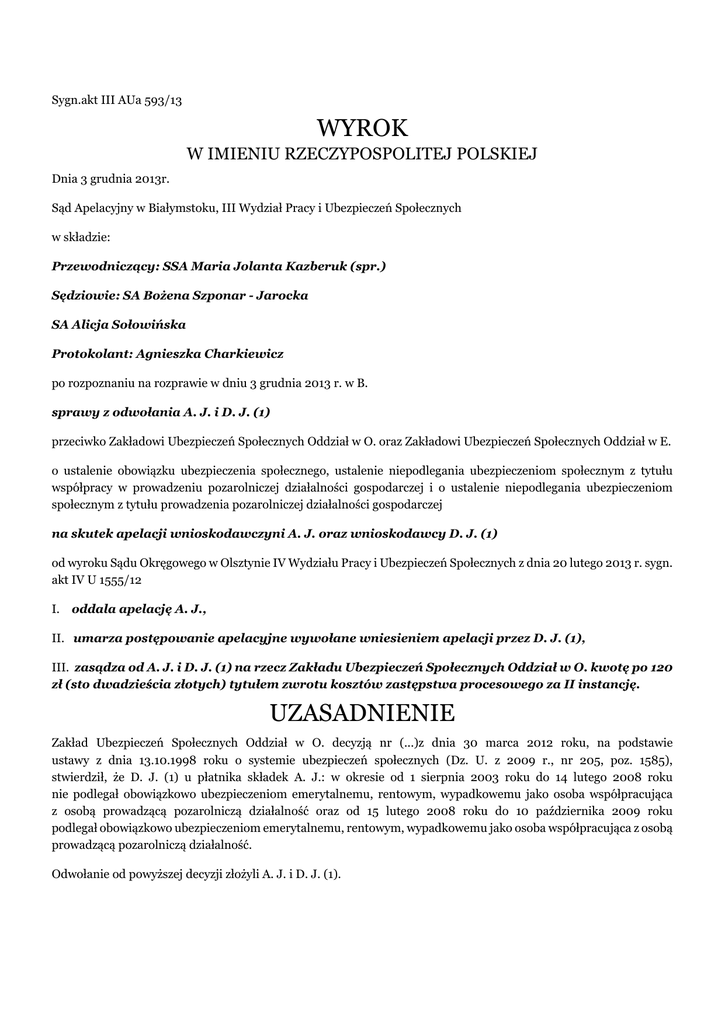 Sygn.akt III AUa 593/13 WYROK W IMIENIU RZECZYPOSPOLITEJ POLSKIEJ Dnia 3 grudnia 2013r. Sąd Apelacyjny w Białymstoku, III Wydział Pracy i Ubezpieczeń Społecznych w składzie: Przewodniczący: SSA Maria Jolanta Kazberuk (spr.) Sędziowie: SA Bożena Szponar - Jarocka SA Alicja Sołowińska Protokolant: Agnieszka Charkiewicz po rozpoznaniu na rozprawie w dniu 3 grudnia 2013 r. w B. sprawy z odwołania A. J. i D. J. (1) przeciwko Zakładowi Ubezpieczeń Społecznych Oddział w O. oraz Zakładowi Ubezpieczeń Społecznych Oddział w E. o ustalenie obowiązku ubezpieczenia społecznego, ustalenie niepodlegania ubezpieczeniom społecznym z tytułu współpracy w prowadzeniu pozarolniczej działalności gospodarczej i o ustalenie niepodlegania ubezpieczeniom społecznym z tytułu prowadzenia pozarolniczej działalności gospodarczej na skutek apelacji wnioskodawczyni A. J. oraz wnioskodawcy D. J. (1) od wyroku Sądu Okręgowego w Olsztynie IV Wydziału Pracy i Ubezpieczeń Społecznych z dnia 20 lutego 2013 r. sygn. akt IV U 1555/12 I. oddala apelację A. J., II. umarza postępowanie apelacyjne wywołane wniesieniem apelacji przez D. J. (1), III. zasądza od A. J. i D. J. (1) na rzecz Zakładu Ubezpieczeń Społecznych Oddział w O. kwotę po 120 zł (sto dwadzieścia złotych) tytułem zwrotu kosztów zastępstwa procesowego za II instancję. UZASADNIENIE Zakład Ubezpieczeń Społecznych Oddział w O. decyzją nr (...)z dnia 30 marca 2012 roku, na podstawie ustawy z dnia 13.10.1998 roku o systemie ubezpieczeń społecznych (Dz. U. z 2009 r., nr 205, poz. 1585), stwierdził, że D. J. (1) u płatnika składek A. J.: w okresie od 1 sierpnia 2003 roku do 14 lutego 2008 roku nie podlegał obowiązkowo ubezpieczeniom emerytalnemu, rentowym, wypadkowemu jako osoba współpracująca z osobą prowadzącą pozarolniczą działalność oraz od 15 lutego 2008 roku do 10 października 2009 roku podlegał obowiązkowo ubezpieczeniom emerytalnemu, rentowym, wypadkowemu jako osoba współpracująca z osobą prowadzącą pozarolniczą działalność. Odwołanie od powyższej decyzji złożyli A. J. i D. J. (1). A. J. wniosła o jej zmianę i uznanie, że D. J. (1) nie współpracował z nią jako osobą prowadzącą pozarolniczą działalność gospodarczą i wobec tego nie podlegał obowiązkowo ubezpieczeniom emerytalnemu, rentowym, wypadkowemu w okresie wskazanym w zaskarżonej decyzji. D. J. (1) wniósł o zmianę decyzji i uznanie, że: w okresie od 1 sierpnia 2003 roku do 8 października 2004 roku zawiesił działalność gospodarczą (...) Męska D. J. (1) i w związku z tym nie podlegał wówczas obowiązkowo ubezpieczeniom emerytalnemu, rentowym, wypadkowemu, a w okresie od 9 października 2004 roku do 14 lutego 2008 roku współpracował z osobą prowadzącą pozarolniczą działalność i podlegał z tego tytułu obowiązkowo ubezpieczeniom emerytalnemu, rentowym, wypadkowemu. Postanowieniem Sądu Okręgowego w Olsztynie z dnia 4 lipca 2012 roku, sygn. akt IV U 1696/12, sprawa z odwołania D. J. (1) została połączona do wspólnego rozpoznania i rozstrzygnięcia ze sprawą z odwołania A. J., sygn. akt IV U 1555/12. Z kolei (...) Oddział w E. decyzją nr (...) z dnia 15 marca 2012 roku stwierdził, że D. J. (1) w okresach od 1 października 2004 roku do 30 listopada 2006 roku oraz 1 października 2007 roku do 14 lutego 2008 roku podlegał obowiązkowo ubezpieczeniom emerytalnemu, rentowym, wypadkowemu jako osoba prowadząca pozarolniczą działalność gospodarczą, niemająca ustalonego prawa do renty z tytułu niezdolności do pracy, dla której podstawą wymiaru składek na ubezpieczenia społeczne stanowi zadeklarowana kwota nie niższa niż 60% kwoty przeciętnego miesięcznego wynagrodzenia. Odwołanie od powyższej decyzji złożył D. J. (1), wnosząc o jej zmianę i uznanie go za osobę współpracującą z osobą prowadzącą pozarolniczą działalność gospodarczą w okresach wskazanych w decyzji i stwierdzenie, że w tych okresach podlegał z tego tytułu obowiązkowo ubezpieczeniom emerytalnemu, rentowym, wypadkowemu. Sąd Okręgowy w Olsztynie IV Wydział Pracy i Ubezpieczeń Społecznych wyrokiem z dnia 20 lutego 2013r. zmienił zaskarżoną decyzję z dnia 30 marca 2012 roku nr (...) w ten sposób, że uznał, iż D. J. (1) podlegał obowiązkowo ubezpieczeniu emerytalnemu, rentowym, wypadkowemu u płatnika składek A. J. w okresie od 15 lutego 2008 roku do 13 kwietnia 2009 roku jako osoba współpracująca z osobą prowadzącą pozarolniczą działalność (pkt I), oddalił odwołanie A. J. w pozostałym zakresie (pkt II) oddalił odwołania D. J. (1) do decyzji (...) Oddział w O. z dnia 30 marca 2012r. nr (...) i decyzji ZUS w E. z dnia 15 marca 2012r. nr (...), zniósł wzajemnie pomiędzy stronami koszty procesu ZUS w O. (pkt IV) oraz zasądził od D. J. (1) na rzecz A. J. kwotę 120zł. tytułem zwrotu kosztów procesu (pkt V). Sąd Okręgowy ustalił, że D. J. (1) podlegał ubezpieczeniu społecznemu rolników w okresie od 7 listopada 1994 roku do 30 września 2004 roku. Następnie zarejestrował działalność gospodarczą w dniu 8 stycznia 1997 roku. W 2003 roku zbył pub (...) w O. oraz sklep z odzieżą w O.. W 2004 roku zbył lokal w L., w którym prowadził sklep z odzieżą. Lokal ten został wynajęty przez A. J. od nowego właściciela. W dniu 9 października 2004 roku A. J. i D. J. (1) zawarli związek małżeński. Z kolei rozwód uzyskali wyrokiem Sądu Okręgowego w Olsztynie z dnia 23 czerwca 2010 roku, sygn. akt VI RC 966/09. A. J. od lipca 2003 roku prowadziła działalność gospodarczą (sklepy z garniturami w O.), której pomysłodawcą był D. J. (1). Podjął on w związku z tą działalnością szereg czynności w latach 2004 – 2009. Zawarł też z A. J. umowy zlecenia na okres od 14 listopada 2005 roku do 11 maja 2006 roku. Z kolei od 1 grudnia 2006 roku do 30 września 2007 roku zawarł umowę o pracę z przedsiębiorstwem (...) s.c. na p