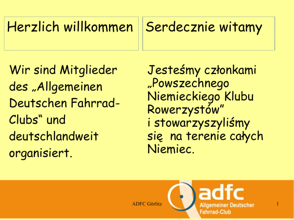 Herzlich willkommen Serdecznie witamy Wir sind Mitglieder des „Allgemeinen Deutschen FahrradClubs“ und deutschlandweit organisiert. Jesteśmy członkami „Powszechnego Niemieckiego Klubu Rowerzystów” i stowarzyszyliśmy się na terenie całych Niemiec. ADFC Görlitz 1 Verbandsgliederung Struktura związku Neben dem zentralen Verband gibt es in jedem Bundesland einen Landesverband. Wir gehören zu Sachsen. Oprócz związku centralnego w każdym Landzie istnieją związki krajowe. My należymy do Saksonii. ADFC Görlitz 2 Verbandsgliederung Struktura związku Innerhalb der einzelnen Bundesländer haben sich viele Ortsgruppen gebildet-wir sind die Ortsgruppe Görlitz. W obrębie poszczególnych Landów utworzyliśmy wiele grup miejscowych- my jesteśmy grupą miejscową Görlitz. ADFC Görlitz 3 Mitgliederzahlen Liczba członków BRD: ca. 150 000 Sachsen: ca. 4 100 Görlitz: ca. 60 RFN: ok. 150 000 Saksonia: ok. 4 100 Görlitz: ok. 60 ADFC Görlitz 4 Rückblick Görlitz Spojrzenie wstecz na grupę w Görlitz gegründet: 2012 Aktive: ca. 10 Touren/Jahr: ca. 20 Powstała w: 2012 aktywne: ok. 10 wycieczki rowerowe w roku: ok. 20 z tego 6 całodzienne często też do Polski davon ca. 6 ganztägig oft auch nach Polen ADFC Görlitz 5 Unsere Aktivitäten Nasze działania -Monatlicher Treff -Touren durchführen -spotkania miesięczne -przeprowadzanie wycieczek -wpływanie na politykę -wygłaszanie prelekcji -praca publiczna -Politik beeinflussen -Vorträge halten -Öffentlichkeitsarbeit ADFC Görlitz 6