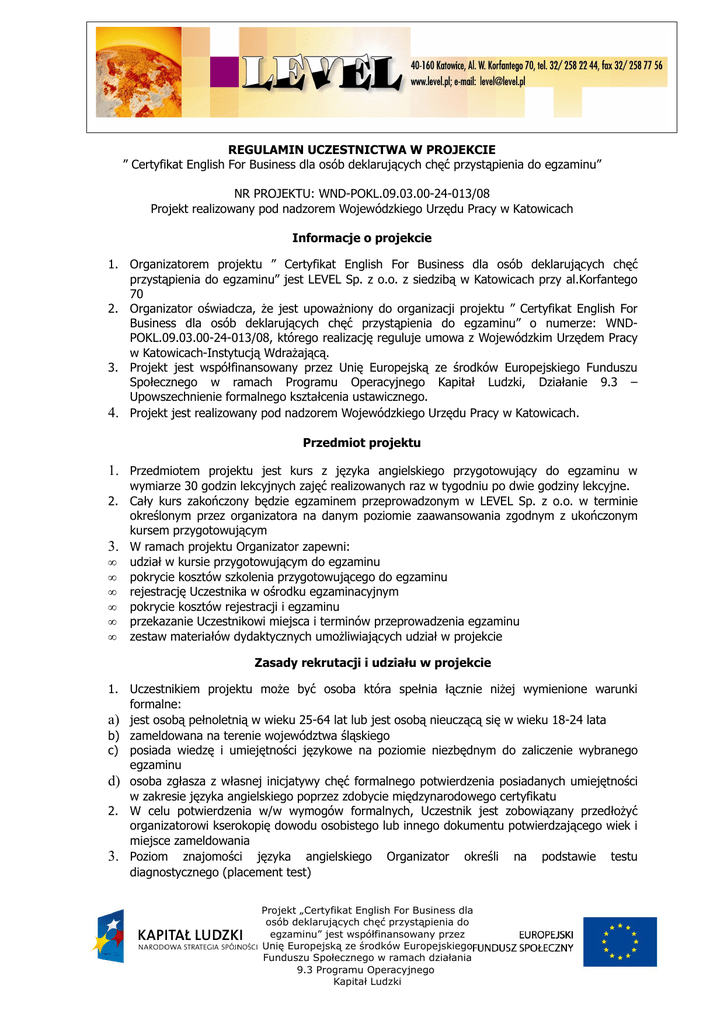 REGULAMIN UCZESTNICTWA W PROJEKCIE ” Certyfikat English For Business dla osób deklarujących chęć przystąpienia do egzaminu” NR PROJEKTU: WND-POKL.09.03.00-24-013/08 Projekt realizowany pod nadzorem Wojewódzkiego Urzędu Pracy w Katowicach Informacje o projekcie 1. Organizatorem projektu ” Certyfikat English For Business dla osób deklarujących chęć przystąpienia do egzaminu” jest LEVEL Sp. z o.o. z siedzibą w Katowicach przy al.Korfantego 70 2. Organizator oświadcza, że jest upoważniony do organizacji projektu ” Certyfikat English For Business dla osób deklarujących chęć przystąpienia do egzaminu” o numerze: WNDPOKL.09.03.00-24-013/08, którego realizację reguluje umowa z Wojewódzkim Urzędem Pracy w Katowicach-Instytucją Wdrażającą. 3. Projekt jest współfinansowany przez Unię Europejską ze środków Europejskiego Funduszu Społecznego w ramach Programu Operacyjnego Kapitał Ludzki, Działanie 9.3 – Upowszechnienie formalnego kształcenia ustawicznego. 4. Projekt jest realizowany pod nadzorem Wojewódzkiego Urzędu Pracy w Katowicach. Przedmiot projektu 1. Przedmiotem projektu jest kurs z języka angielskiego przygotowujący do egzaminu w wymiarze 30 godzin lekcyjnych zajęć realizowanych raz w tygodniu po dwie godziny lekcyjne. 2. Cały kurs zakończony będzie egzaminem przeprowadzonym w LEVEL Sp. z o.o. w terminie określonym przez organizatora na danym poziomie zaawansowania zgodnym z ukończonym kursem przygotowującym 3. W ramach projektu Organizator zapewni: • udział w kursie przygotowującym do egzaminu • pokrycie kosztów szkolenia przygotowującego do egzaminu • rejestrację Uczestnika w ośrodku egzaminacyjnym • pokrycie kosztów rejestracji i egzaminu • przekazanie Uczestnikowi miejsca i terminów przeprowadzenia egzaminu • zestaw materiałów dydaktycznych umożliwiających udział w projekcie Zasady rekrutacji i udziału w projekcie 1. Uczestnikiem projektu może być osoba która spełnia łącznie niżej wymienione warunki formalne: a) jest osobą pełnoletnią w wieku 25-64 lat lub jest osobą nieuczącą się w wieku 18-24 lata b) zameldowana na terenie województwa śląskiego c) posiada wiedzę i umiejętności językowe na poziomie niezbędnym do zaliczenie wybranego egzaminu d) osoba zgłasza z własnej inicjatywy chęć formalnego potwierdzenia posiadanych umiejętności w zakresie języka angielskiego poprzez zdobycie międzynarodowego certyfikatu 2. W celu potwierdzenia w/w wymogów formalnych, Uczestnik jest zobowiązany przedłożyć organizatorowi kserokopię dowodu osobistego lub innego dokumentu potwierdzającego wiek i miejsce zameldowania 3. Poziom znajomości języka angielskiego Organizator określi na podstawie testu diagnostycznego (placement test) Projekt „Certyfikat English For Business dla osób deklarujących chęć przystąpienia do egzaminu” jest współfinansowany przez Unię Europejską ze środków Europejskiego Funduszu Społecznego w ramach działania 9.3 Programu Operacyjnego Kapitał Ludzki 4. Nabór uczestników do projektu jest otwarty. O udziale w projekcie decyduje kolejność zgłoszeń czyli termin złożenia wszystkich Formularzy Rekrutacyjnych Projektu siedzibie organizatora. W dalszej części decydować będą czynniki przedstawione w punkcie 3. 5. Formularze Rekrutacyjne Projektu obejmują następujące dokumenty: a) Formularz zgłoszeniowy b) Regulamin uczestnictwa w projekcie c) Ankieta motywacyjna d) Kserokopia dowodu osobistego lub innego dokumentu potwierdzającego tożsamość, miejsce zameldowania, wiek e) Wypełniony test diagnostyczny 6. W sytuacjach spornych związanych z lista uczestników projektu, głos decydujący zastrzeżony jest dla Koordynatora Projektu ” Certyfikat English For Business dla osób deklarujących chęć przystąpienia do egzaminu” 7. Liczba uczestników projektu jest ograniczona i w sumie wynosi 150 osób. Organizator dopuszcza stworzenie listy rezerwowej uczestników. 8. Zgłoszenia uczestników będą przyjmowane w Biurze Organizatora począwszy od 01 października 2008 r. do 31 października 2008 r., od poniedziałku do piątku, w godz. od 9.00 do 18.00 lub drogą mailową [email protected], przy czym uczestnik musi w dniu rozpoczęcia zajęć dostarczyć do biura oryginały dokumentów. 9. W przypadku niedostatecznej liczby zgłoszeń beneficjentów, terminy postępowania rekrutacyjnego oraz pozostałe terminy realizacji Projektu mogą ulec przesunięciu. Obowiązki uczestników projektu 1. Uczestnik zobowiązuje się do udziału w projekcie zgodnie z ustalonym harmonogramem spotkań 2. Uczestnik zobowiązuje się ponadto do: a) Rzetelnego i zgodnego z prawdą wypełniania wszystkich przedstawionych mu przez organizatora dokumentów związanych z uczestnictwem w projekcie b) Poddania się badaniu ewaluacyjnemu po upływie 6 miesięcy od daty zakończenia szkolenia (zbadanie ankietowe losów zawodowych uczestników projektu) c) Zachowania dobrych obyczajów w trakcie uczestnictwa w zajęciach objętych projektem w szczególności do zachowania zgodnego z powszechnie przyjętymi zasadami i normami społecznymi i powstrzymywania się od zachowań mogących godzić w uczucia religijne i narodowe innych osób 3. Naruszenie któregokolwiek zobowiązań skutkować będzie skreśleniem z listy uczestników projektu i uważane będzie jako przerwanie udziału w projekcie z przyczyn zależnych od uczestnika. Warunki rezygnacji z udziału w projekcie 1. Każdy uczestnik może zrezygnować pisemnie z udziału w projekcie w terminie do dnia 2. 3. 30.11.2008, składając odpowiednie oświadczenie w biurze projektu. W przypadku rezygnacji w w/w terminie uczestnik nie ponosi żadnych dodatkowych opłat i kosztów. W przypadku rezygnacji uczestnika w projekcie organizator dopuszcza możliwość przystąpienia do projektu osoby z listy rezerwowej uczestników projektu. W przypadku rezygnacji uczestnika z udziału w egzaminie po dokonaniu rejestra