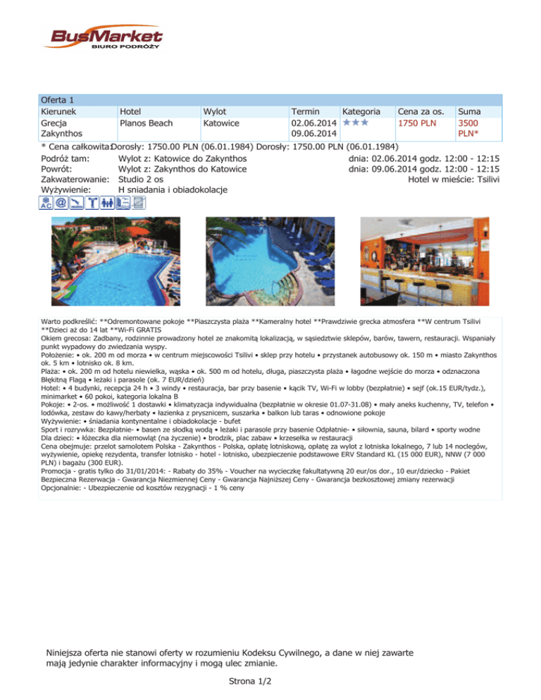 Oferta 1 Kierunek Grecja Zakynthos Hotel Planos Beach Wylot Katowice Termin Kategoria 02.06.2014 09.06.2014 Cena za os. 1750 PLN Suma 3500 PLN* * Cena całkowita:Dorosły: 1750.00 PLN (06.01.1984) Dorosły: 1750.00 PLN (06.01.1984) Podróż tam: Wylot z: Katowice do Zakynthos dnia: 02.06.2014 godz. 12:00 - 12:15 Powrót: Wylot z: Zakynthos do Katowice dnia: 09.06.2014 godz. 12:00 - 12:15 Zakwaterowanie: Studio 2 os Hotel w mieście: Tsilivi Wyżywienie: H sniadania i obiadokolacje Warto podkreślić: **Odremontowane pokoje **Piaszczysta plaża **Kameralny hotel **Prawdziwie grecka atmosfera **W centrum Tsilivi **Dzieci aż do 14 lat **Wi-Fi GRATIS Okiem grecosa: Zadbany, rodzinnie prowadzony hotel ze znakomitą lokalizacją, w sąsiedztwie sklepów, barów, tawern, restauracji. Wspaniały punkt wypadowy do zwiedzania wyspy. Położenie: • ok. 200 m od morza • w centrum miejscowości Tsilivi • sklep przy hotelu • przystanek autobusowy ok. 150 m • miasto Zakynthos ok. 5 km • lotnisko ok. 8 km. Plaża: • ok. 200 m od hotelu niewielka, wąska • ok. 500 m od hotelu, długa, piaszczysta plaża • łagodne wejście do morza • odznaczona Błękitną Flagą • leżaki i parasole (ok. 7 EUR/dzień) Hotel: • 4 budynki, recepcja 24 h • 3 windy • restauracja, bar przy basenie • kącik TV, Wi-Fi w lobby (bezpłatnie) • sejf (ok.15 EUR/tydz.), minimarket • 60 pokoi, kategoria lokalna B Pokoje: • 2-os. • możliwość 1 dostawki • klimatyzacja indywidualna (bezpłatnie w okresie 01.07-31.08) • mały aneks kuchenny, TV, telefon • lodówka, zestaw do kawy/herbaty • łazienka z prysznicem, suszarka • balkon lub taras • odnowione pokoje Wyżywienie: • śniadania kontynentalne i obiadokolacje - bufet Sport i rozrywka: Bezpłatnie- • basen ze słodką wodą • leżaki i parasole przy basenie Odpłatnie- • siłownia, sauna, bilard • sporty wodne Dla dzieci: • łóżeczka dla niemowląt (na życzenie) • brodzik, plac zabaw • krzesełka w restauracji Cena obejmuje: przelot samolotem Polska - Zakynthos - Polska, opłatę lotniskową, opłatę za wylot z lotniska lokalnego, 7 lub 14 noclegów, wyżywienie, opiekę rezydenta, transfer lotnisko - hotel - lotnisko, ubezpieczenie podstawowe ERV Standard KL (15 000 EUR), NNW (7 000 PLN) i bagażu (300 EUR). Promocja - gratis tylko do 31/01/2014: - Rabaty do 35% - Voucher na wycieczkę fakultatywną 20 eur/os dor., 10 eur/dziecko - Pakiet Bezpieczna Rezerwacja - Gwarancja Niezmiennej Ceny - Gwarancja Najniższej Ceny - Gwarancja bezkosztowej zmiany rezerwacji Opcjonalnie: - Ubezpieczenie od kosztów rezygnacji - 1 % ceny Niniejsza oferta nie stanowi oferty w rozumieniu Kodeksu Cywilnego, a dane w niej zawarte mają jedynie charakter informacyjny i mogą ulec zmianie. Strona 1/2 Legenda Wypożyczalnia sprzętu zimowego Sporty zimowe Życie nocne Klimatyzacja Żeglarstwo Ułatwienia dla niepełnosprawnych Nordic walking Jazda konna Sporty wodne Minigolf Tenis Sport Blisko lotniska Zjeżdzalnie wodne Basen kryty Basen odkryty Fitness / siłownia Hotel klubowy CityBreak Region nadmorski Bez paszportu Blisko stoku Niniejsza oferta nie stanowi oferty w rozumieniu Kodeksu Cywilnego, a dane w niej zawarte mają jedynie charakter informacyjny i mogą ulec zmianie. Strona 2/2