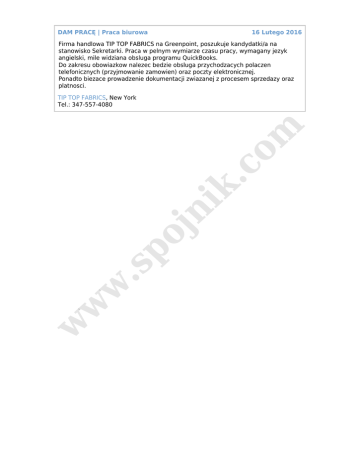 DAM PRACĘ | Praca biurowa 16 Lutego 2016 Firma handlowa TIP TOP FABRICS na Greenpoint, poszukuje kandydatki/a na stanowisko Sekretarki. Praca w pelnym wymiarze czasu pracy, wymagany jezyk angielski, mile widziana obsluga programu QuickBooks. Do zakresu obowiazkow nalezec bedzie obsluga przychodzacych polaczen telefonicznych (przyjmowanie zamowien) oraz poczty elektronicznej. Ponadto biezace prowadzenie dokumentacji zwiazanej z procesem sprzedazy oraz platnosci. w w w .s po jn ik .c o m TIP TOP FABRICS, New York Tel.: 347-557-4080