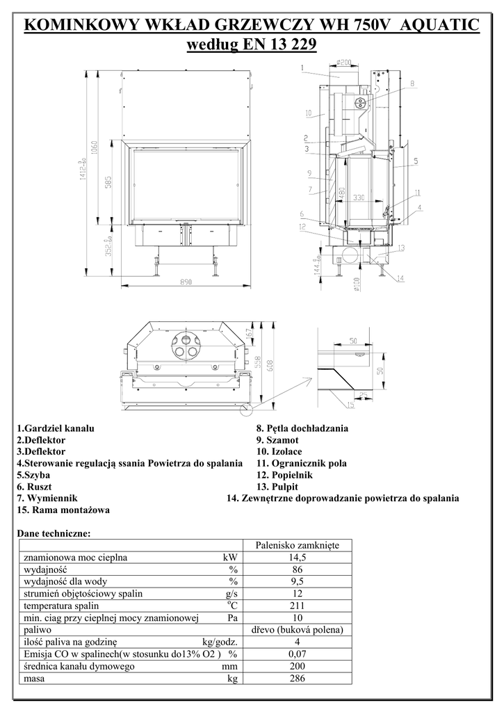 KOMINKOWY WKŁAD GRZEWCZY WH 750V AQUATIC według EN 13 229 1.Gardziel kanalu 8. Pętla dochładzania 2.Deflektor 9. Szamot 3.Deflektor 10. Izolace 4.Sterowanie regulacją ssania Powietrza do spalania 11. Ogranicznik pola 5.Szyba 12. Popielnik 6. Ruszt 13. Pulpit 7. Wymiennik 14. Zewnętrzne doprowadzanie powietrza do spalania 15. Rama montażowa Dane techniczne: znamionowa moc cieplna kW wydajność % wydajność dla wody % strumień objętościowy spalin g/s o temperatura spalin C min. ciag przy cieplnej mocy znamionowej Pa paliwo ilość paliva na godzinę kg/godz. Emisja CO w spalinech(w stosunku do13% O2 ) % średnica kanału dymowego mm masa kg Palenisko zamknięte 14,5 86 9,5 12 211 10 dřevo (buková polena) 4 0,07 200 286 1 – Dopływ zimnej wody do wymiennika (przewód poziomy), gwint zewnętrzny 1'' 2 – Odpływ ciepłej wody z wymiennika (przewód pionowy), gwint zewnętrzny 1'' 3 – Doprowadzenie zimej wody do pętli chłodzącej, gwint zewnętrzny 1/2'' 4 – Odpływ ogrzanej wody z pętli chłodzącej, gwint zewnętrzny 1/2'' 5 – Zawór odpowietrzający, gwint wewnętrzny 1/2'' 6 – Ciśnieniowy zawór bezpieczeństwa, gwint wewnętrzny 1/2'' 7 - Czujnik zabezpieczenia termicznego, gwint zewnętrzny 1'' BeF Home, s.r.o. Kotvrdovice 277 679 07 Kotvrdovice IČO: 25524682 10 EN 13 229:2001 a A1:2004 Kominkowy wkład grzewczy EN 13 229 – W na paliwa stałe do ogrzewania pomieszczeń Typ WH 750, WH 750 V, WH 750 VCL, WH 750 VCP, WH 750 CP, WH 750 CL 1) Odległość od przyległych materiałów palnych : 7 + 10 cm izolaci cieplnej Emisja CO w spalinach (w stotunku do 13% O2 ): 0,07 % Temperatura spalin za gardzielą : 211 °C Moc cieplna : 14,5 kW mocy do ogrzewania Wydajność energetyczna: 86 % Rodzaje paliwa: drewno (szczapki bukowe) Należy przeczytać i przestrzegać instrukcji obsługi! Urządzenie z krótkooresowym procesem spalania! 1) Szczegółowe informace znajdują się w instrukci Montanu i obsługi. 1 - Deflektor 2 – Deflektor 3 – Kształtka szamotowa