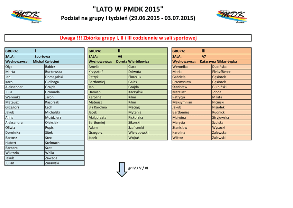 "LATO W PMDK 2015" Podział na grupy I tydzień (29.06.2015 - 03.07.2015) Uwaga !!! Zbiórka grupy I, II i III codziennie w sali sportowej GRUPA: SALA: Wychowawca: Olga Marta Jan Karol Aleksander Julia Weronika Mateusz Grzegorz Jakub Anna Aleksandra Oliwia Dominika Bartosz Hubert Barbara Wiktoria Jakub Julian I Sportowa Michał Kwiecień Babicz Burkowska Domagalski Giełbaga Grajda Gromada Jaroń Kasprzak Lech Michalski Moździerz Oleksiak Popis Sitek Stec Stelmach Szot Walia Zawada Żurawski GRUPA: SALA: Wychowawca: Amelia Krzysztof Patryk Bartłomiej Jan Damian Karolina Mateusz Iga Karolina Jacek Małgorzata Bartłomiej Adam Grzegorz Jacek II A6 Dorota Wierbiłowicz Ciara Dziwota Florczuk Galas Grajda Kaczyński Kilim Kilim Maciąg Mytenia Piskorska Sikorski Szafrański Wierzbowski Wojtaś gr IV / V / VI GRUPA: SALA: Wychowawca: Weronika Maria Gabriela Przemysław Stanisław Mateusz Patrycja Maksymilian Jakub Bartłomiej Malwina Marysia Stanisław Karolina Wiktor III A7 Katarzyna Niklas-Łypka Dubińska FleiszfReser Gąsiorek Gąsiorek Gulbiński Jobda Mikita Niciński Niziołek Rudnicki Stryjewska Szulska Wysocki Zalewska Zalewski "LATO W PMDK 2015" Podział na grupy I tydzień (29.06.2015 - 03.07.2015) Uwaga !!! Zbiórka grupy IV, V i VI codziennie w kawiarni GRUPA: SALA: Wychowawca: Weronika Nikola Jakub Julia Róża Wiktoria Ula Julia Aleksandra Patryk Maja Mateusz Adam Krzysztof Magda IV Kawiarnia Beata Koc Bąk Biernacka Ciszkowski Drewicz Falak Hajdul Janiga Kałęcka Kotowska Kraszewski Płużańska Rumsicki Staszewski Sutkowski Zatorska GRUPA: SALA: Wychowawca: Damian Wiktoria Damian Konrad Jagoda Kamil Mateusz Patryk Michał Dominik Natalia Hanna Piotr Julianna Agata V Kawiarnia Angelika Kubicka Biernacki Gawin Gruchal Gruchal Kalata Marczuk Marszałek Marszałek Moździerz Rencławowicz Stec Szewczyk Świeżak Urbaniak Żelazko gr VII / VIII / IX GRUPA: SALA: Wychowawca: Łukasz Alicja Michał Oskar Julia Milena Alan Bartosz Aleksandra Jakub Marika Mateusz Kinga Maciej Gabriela VI Sala prób Joanna Rosłaniec Antoszewski Ciszewska Frąk Kurant Napiórkowska Napiórkowska Neukirch Nowak Orzechowska Orzechowski Sielska Skolimowski Stopa Walkiewicz Zapała "LATO W PMDK 2015" Podział na grupy I tydzień (29.06.2015 - 03.07.2015) Uwaga !!! Zbiórka grupy VII, VIII i IX codziennie w sali B9 GRUPA: SALA: Wychowawca: Miłosz Natalia Oliwia Franciszek Jakub Patryk Kinga Aleksandra Jan Julia Aleksander Jakub Maja Karolina Daniel VII B9 Elżbieta Wójcik Adam Ćwiklińska Ćwiklińska Fila Gabryś Kościanek Kryńska Książek Napiórkowski Nawrocka Piórczyński Piórczyński Pudzyńska Staręga Winter GRUPA: SALA: Wychowawca: Filip Aleksandra Oliwia Maksymilian Zofia Alan Antoni Bartosz Juliusz Szymon Julia Wiktor Oliwia Wiktoria Julianna VIII B6 Agnieszka Dubińska Cichecki Cichocka Cichocka Cichocki Gołębiewska Jaworski Jaworski Kalinowski Rokicki Rokicki Sierakowska Sierakowski Włodarczyk Wróbel Żołądek GRUPA: SALA: Wychowawca: Maja Zofia Krzysztof Martyna Natalia Zuzia Julia Marta Bartosz Karolina Krzysztof Maria Weronika Alicja Pola IX Lustrzana Anna Duszczyk Bombińska Bucka Bucki Cymerman Frąk Garbolińska Kwiatek Latuszek Mikołajczyk Mucha Olejarczyk Olejarczyk Proch Urbaniak Wysocka