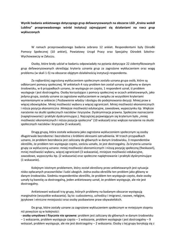 Wyniki badania ankietowego dotyczącego grup defaworyzowanych na obszarze LGD „Kraina wokół Lublina” przeprowadzonego wśród instytucji zajmującymi się działaniami na rzecz grup wykluczonych W ramach przeprowadzonego badania zebrano 12 ankiet. Respondentami były Ośrodki Pomocy Społecznej (10 ankiet), Powiatowy Urząd Pracy oraz Specjalny Ośrodek SzkolnoWychowawczy w Załuczu. Osoby, które brały udział w badaniu odpowiadały na pytania dotyczące 22 zidentyfikowanych grup defaworyzowanych określając kryteria uznania grup za zagrożone wykluczeniem oraz wagę problemu (w skali 1-5) na obszarze objętym działalnością instytucji-respondenta. Za najbardziej zagrożoną wykluczeniem społecznym została uznana grupa osób, które są odbiorcami pomocy społecznej. W ankietach 4 razy problem ten został uznany za główny w danym środowisku, w 6 przypadkach uznano, że występuje on często, 1 respondent uznał, iż problem występuje i jest dostrzegalny. Osoby korzystające z pomocy społecznej w oczach ankietowanych, jako jedyna grupa, zostały uznane za zagrożone wykluczeniem w związku ze wszystkimi kryteriami wymienionymi w ankiecie ( Pozbawienie władzy i dostępu do podejmowania decyzji. Mniej praw a więcej obowiązków. Mniej możliwości wyboru a więcej ograniczeń. Mniej możliwości ekonomicznych i niższa pozycja ekonomiczna .Mniejsze możliwości edukacyjne, zawodowe, wypoczynku itp. Większe narażenie na skutki społecznych nacisków i kryzysów. Dyskryminacja prawna. Społeczne naznaczanie (napiętnowanie) i praktyki dyskryminujące.). Najczęściej pojawiającym się kryterium było „mniej możliwości ekonomicznych i niższa pozycja społeczna” (10 wskazań) oraz większe narażenie na skutki społecznych nacisków i kryzysów (5 wskazań). Drugą grupą, która została wskazana jako zagrożona wykluczeniem społecznym są osoby długotrwale bezrobotne i bezrobotne z krótkimi okresami zatrudnienia. W trzech przypadkach uznano, że problem bezrobocia jest zaliczany do głównych w danym środowisku, 3 respondentów określiło, że problem ten występuje często, sześciu uznało, że jest dostrzegalny. Za kryteria uznania grupy za wykluczoną uznano: mniej możliwości ekonomicznych i niższą pozycję społeczną (9wskazań), mniej możliwości wyboru, więcej ograniczeń (3 wskazania), mniejsze możliwości edukacyjne, zawodowe, wypoczynku itp. (2 wskazania) oraz społeczne napiętnowanie i praktyki dyskryminujące (1 wskazanie). Kolejnym istotnym problemem, który został określony przez ankietowanych jest sytuacja nisko opłacanych pracowników i ludzi ubogich. Jedna osoba określiła ten problem jako główny w danym środowisku. Siedmiu respondentów określiło, że problem ten występuje często, dwie osoby uznały tą kwestię za dostrzegalną, jeden ankietowany uznał, że problem występuje, ale nie jest dostrzegalny. Ankietowani wskazali trzy grupy, których problemy na badanym obszarze występują marginalnie (wszystkie wskazania). Są to: cudzoziemcy, uchodźcy i imigranci, rasowe, religijne, językowe i etniczne mniejszości oraz osoby pozbawione praw obywatelskich. Do grup, które zostały uznane za zagrożone wykluczeniem społecznym w mniejszym stopniu niż powyższe są w kolejności: - osoby umysłowo i fizycznie nie sprawne: problem jest zaliczany do głównych w danym środowisku – 1 wskazanie, problem występuje często – 1 wskazanie, problem występuje i jest dostrzegalny – 9 wskazań, problem występuje, ale nie jest dostrzegalny – 2 wskazania. Osoby z tej grupy borykają się z dużą liczbą ograniczeń. Są to: Dyskryminacja prawna – 5 wskazań, Pozbawienie władzy i dostępu do podejmowania decyzji – 4 wskazania, Mniej możliwości wyboru a więcej ograniczeń oraz Większe narażenie na skutki społecznych nacisków i kryzysów – po 3 wskazania, Mniejsze możliwości edukacyjne, zawodowe- 2 wskazania oraz Mniej możliwości ekonomicznych i niższa pozycja ekonomiczna- 1 wskazanie. - samotni rodzice-problem występuje często – 3 wskazania, problem występuje i jest dostrzegalny – 7 wskazań, problem występuje marginalnie – 2 wskazania. - potrzebujący, ale nie uprawnieni do pomocy - problem jest zaliczany do głównych w danym środowisku – 1 wskazanie, problem występuje często – 2 wskazania, problem występuje i jest dostrzegalny – 6 wskazań, problem występuje, ale nie jest dostrzegalny – 1 wskazanie, problem występuje marginalnie – 2 wskazania. - osoby bez kwalifikacji, analfabeci, osoby przerywające naukę w szkole- problem jest zaliczany do głównych w danym środowisku – 1 wskazanie, problem występuje często – 2 wskazania, problem występuje i jest dostrzegalny – 5 wskazań, problem występuje, ale nie jest dostrzegalny – 2 wskazania, problem występuje marginalnie – 2 wskazania. Ankietowani wskazali trzy grupy, których problemy na badanym obszarze występują marginalnie (wszystkie wskazania). Są to: cudzoziemcy, uchodźcy i imigranci, rasowe, religijne, językowe i etniczne mniejszości oraz osoby pozbawione praw obywatelskich. 50 45 40 35 30 25 20 15 10 5 0 Opracowała P.Drążyk