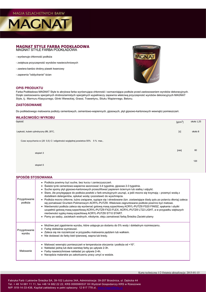 MAGNAT STYLE FARBA PODKŁADOWA MAGNAT STYLE FARBA PODKŁADOWA wyrównuje chłonność podłoża zwiększa przyczepność wyrobów nawierzchniowych - zawiera bardzo drobny piasek kwarcowy zapewnia "oddychanie" ścian OPIS PRODUKTU Farba Podkładowa MAGNAT Style to akrylowa farba wyrównująca chłonność i wzmacniająca podłoże przed zastosowaniem wyrobów dekoracyjnych. Dzięki zastosowaniu specjalnych drobnoziarnistych specjalnych wypełniaczy zapewnia właściwą przyczepność wyrobów dekoracyjnych MAGNAT Style, tj.: Marmuru Klasycznego, Glinki Weneckiej, Grassi, Trawertynu, Stiuku Wapiennego, Betonu. ZASTOSOWANIE Do podkładowego malowania podłoży cementowych, cementowowapiennych, gipsowych, płyt gipsowokartonowych wewnątrz pomieszczeń. WŁAŚCIWOŚCI WYROBU Gęstość Lepkość, kubek cylindryczny Ø6, 20°C, [g/cm3] około 1,55 [s] około 8 [min] 60 Czas wysychania w (20 0,5) C i wilgotności względnej powietrza 55% 5 % max., stopień 3 120 stopień 5 SPOSÓB STOSOWANIA Przygotowanie podłoża Przygotowanie wyrobu Malowanie Podłoża powinny być suche, bez kurzu i zanieczyszczeń. Świeże tynki cementowowapienne sezonować 34 tygodnie, gipsowe 23 tygodnie. Suche spoiny płyt gipsowokartonowych przeszlifować papierem ściernym lub siatką i odpylić. Stare, źle przylegające do podłoża powłoki z farb emulsyjnych usunąć, a jeśli mocno się trzymają – przemyć wodą z dodatkiem detergentów, spłukać wodą i pozostawić do wyschnięcia. Podłoża mocno chłonne, luźno związane, sypiące się i skredowane (tzn. zostawiające ślady pyłu po potarciu dłonią) zaleca się pomalować Gruntem Polimerowym ACRYLPUTZ®. Właściwie zagruntowane podłoże powinno być matowe. Nierówności podłoża zaleca się wyrównać gotową masą szpachlową ACRYLPUTZ® FS20 FINISZ, spękania i ubytki uzupełnić gotową masą szpachlową ACRYLPUTZ® FX23 FLEX, ACRYLPUTZ® LT22 LIGHT, a w przypadku większych nierówności sypką masą szpachlową ACRYLPUTZ® ST10 START. Pamy po sadzy, zaciekach wodnych, nikotynie, oleju zamalować farbą Śnieżka Zaciekiplamy Możliwe jest zgęstnienie wyrobu, które ustępuje po dodaniu do 5% wody i dokładnym rozmieszaniu. Farbę dokładnie wymieszać. Zaleca się nie rozcieńczać w przypadku malowania pędzlem lub wałkiem. Nie dodawać do farby bieli tytanowej, wapna lub kredy. Malować wewnątrz pomieszczeń w temperaturze otoczenia i podłoża od +10°. Nakładać jedną lub dwie warstwę farby po upływie 23h. Farby nawierzchniowe nakładać po upływie 24h. Narzędzia malarskie po zakończeniu pracy umyć w wodzie. Karta techniczna 1/2 Ostatnia aktualizacja: 2015-01-15 Fabryka Farb i Lakierów Śnieżka SA, 39102 Lubzina 34A, Administracja: 39207 Brzeźnica, ul. Dębicka 44 Tel. + 48 14 681 11 11, fax +48 14 682 22 22, KRS 0000060537 XII Wydział Gospodarczy KRS w Rzeszowie NIP: 8181433438, Kapitał zakładowy w pełni opłacony: 12 617 778 zł, www.magnatfarby.pl PARAMETRY MALOWANIA DLA POSZCZEGÓLNYCH METOD PARAMETRY MALOWANIA METODY lepkość farby dodatek rozcieńczalnika średnica dyszy pistoletu ciśnienie natrysku [s] [%] [mm] [MPa] postać handlowa - - - zalecana ilość warstw MALOWANIA Pędzel, wałek 1-2 * natrysk wykonany na urządzeniach firmy Graco, model 395 ST PRO OKRES PRZYDATNOŚCI 48 miesięcy od daty produkcji OPAKOWANIA 1L, 5L WYDAJNOŚĆ do 6 m²/L przy jednokrotnym malowaniu KOLORYSTYKA biały LZO Limit zawartości LZO (kat. A/g/FW); 30 g/l (2010); produkt zawiera max. 30 g/l. NORMY I ATESTY PN-C-81906:2003, rodzaj II WSKAZÓWKI BHP I PPOŻ BEZPIECZEŃSTWO: : Zawiera mieszaninę 5chloro2metylo4izotiazol3onu [WE 2475007] i 2metylo2H izotiazol3onu [WE 2202396] (3:1). Może powodować wystąpienie reakcji alergicznej. W razie konieczności zasięgnięcia porady lekarza należy pokazać pojemnik lub etykietę. Chronić przed dziećmi. Przed użyciem przeczytać etykietę. Zawartość/pojemnik usuwać zgodnie z obowiązującymi przepisami. PRZECHOWYWANIE: Produkt przechowywać i magazynować w szczelnie zamkniętym oryginalnym opakowaniu w temperaturze od +5ºC do +25ºC. Chronić przed mrozem i nasłonecznieniem. UWAGA! Informacje zawarte w karcie technicznej mają na celu zapewnienie optymalnego wykorzystania produktu, jednak nie są podstawą do odpowiedzialności prawnej Producenta, gdyż warunki wykonawstwa pozostają poza jego kontrolą. Wszelka ingerencja w skład produktu jest niedopuszczalna i może w znaczny sposób obniżyć jakość stosowanego materiału. W przypadku połączenia z wyrobami innych Producentów nie ponosimy żadnej odpowiedzialności. Przedstawione powyżej informacje podane zostały w dobrej wierze, według aktualnego stanu wiedzy i doświadczenia praktycznego. Producent zastrzega sobie prawo do zmiany treści w kolejnych edycjach bez wcześniejszego informowania o tym fakcie odbiorców. Karta techniczna 2/2 Ostatnia aktualizacja: 2015-01-15 Fabryka Farb i Lakierów Śnieżka SA, 39102 Lubzina 34A, Administracja: 39207 Brzeźnica, ul. Dębicka 44 Tel. + 48 14 681 11 11, fax +48 14 682 22 22, KRS 0000060537 XII Wydział Gospodarczy KRS w Rzeszowie NIP: 8181433438, Kapitał zakładowy w pełni opłacony: 12 617 778 zł, www.magnatfarby.pl