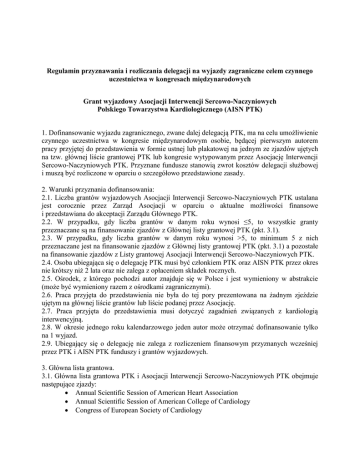 Regulamin przyznawania i rozliczania delegacji na wyjazdy zagraniczne celem czynnego uczestnictwa w kongresach międzynarodowych Grant wyjazdowy Asocjacji Interwencji Sercowo-Naczyniowych Polskiego Towarzystwa Kardiologicznego (AISN PTK) 1. Dofinansowanie wyjazdu zagranicznego, zwane dalej delegacją PTK, ma na celu umożliwienie czynnego uczestnictwa w kongresie międzynarodowym osobie, będącej pierwszym autorem pracy przyjętej do przedstawienia w formie ustnej lub plakatowej na jednym ze zjazdów ujętych na tzw. głównej liście grantowej PTK lub kongresie wytypowanym przez Asocjację Interwencji Sercowo-Naczyniowych PTK. Przyznane fundusze stanowią zwrot kosztów delegacji służbowej i muszą być rozliczone w oparciu o szczegółowo przedstawione zasady. 2. Warunki przyznania dofinansowania: 2.1. Liczba grantów wyjazdowych Asocjacji Interwencji Sercowo-Naczyniowych PTK ustalana jest corocznie przez Zarząd Asocjacji w oparciu o aktualne możliwości finansowe i przedstawiana do akceptacji Zarządu Głównego PTK. 2.2. W przypadku, gdy liczba grantów w danym roku wynosi ≤5, to wszystkie granty przeznaczane są na finansowanie zjazdów z Głównej listy grantowej PTK (pkt. 3.1). 2.3. W przypadku, gdy liczba grantów w danym roku wynosi >5, to minimum 5 z nich przeznaczane jest na finansowanie zjazdów z Głównej listy grantowej PTK (pkt. 3.1) a pozostałe na finansowanie zjazdów z Listy grantowej Asocjacji Interwencji Sercowo-Naczyniowych PTK. 2.4. Osoba ubiegająca się o delegację PTK musi być członkiem PTK oraz AISN PTK przez okres nie krótszy niż 2 lata oraz nie zalega z opłaceniem składek rocznych. 2.5. Ośrodek, z którego pochodzi autor znajduje się w Polsce i jest wymieniony w abstrakcie (może być wymieniony razem z ośrodkami zagranicznymi). 2.6. Praca przyjęta do przedstawienia nie była do tej pory prezentowana na żadnym zjeździe ujętym na głównej liście grantów lub liście podanej przez Asocjację. 2.7. Praca przyjęta do przedstawienia musi dotyczyć zagadnień związanych z kardiologią interwencyjną. 2.8. W okresie jednego roku kalendarzowego jeden autor może otrzymać dofinansowanie tylko na 1 wyjazd. 2.9. Ubiegający się o delegację nie zalega z rozliczeniem finansowym przyznanych wcześniej przez PTK i AISN PTK funduszy i grantów wyjazdowych. 3. Główna lista grantowa. 3.1. Główna lista grantowa PTK i Asocjacji Interwencji Sercowo-Naczyniowych PTK obejmuje następujące zjazdy: Annual Scientific Session of American Heart Association Annual Scientific Session of American College of Cardiology Congress of European Society of Cardiology 3.2. W jednym roku kandydat może ubiegać się o sponsorowanie udziału w jednym zjeździe europejskim lub jednym odbywającym się w Stanach Zjednoczonych. 3.3. Wyjazd na zjazd objęty główną listą grantową finansowany jest z funduszy Asocjacji Interwencji Sercowo-Naczyniowych PTK. 3.4. Zaliczka przyznawana jest po złożeniu podania do Komisji Grantów PTK i zatwierdzeniu przez Zarząd Asocjacji Interwencji Sercowo-Naczyniowych PTK, a następnie przez Zarząd Główny PTK. 3.5. Akceptacja Zarządu Asocjacji Interwencji Sercowo-Naczyniowych PTK oznacza uzyskanie 3 pozytywnych głosów Członków Zarządu, w tym Przewodniczącego(ej) Asocjacji. 3.6. Wysokość zaliczki na poszczególne zjazdy określana jest corocznie przez ZG PTK. 4. Lista grantowa Asocjacji Interwencji Sercowo-Naczyniowych PTK. 4.1. Lista grantowa Asocjacji Interwencji Sercowo-Naczyniowych obejmuje następujące zjazdy: EuroPCR TCT Kongres kardiologii pediatrycznej 4.2. Wyjazdy na zjazdy objęte listą grantową Asocjacji Interwencji Sercowo-Naczyniowych PTK finansowane są z funduszy zgromadzonych przez Asocjację na własnym koncie lub subkoncie PTK. 4.4. Zaliczka przyznawana jest wówczas po złożeniu podania do Zarządu Asocjacji Interwencji Sercowo-Naczyniowych PTK i rozliczana jest wg ogólnych zasad podanych wyżej (patrz punkt 2. Warunki przyznania dofinansowania) oraz niżej (patrz punkt 5. Zasady składania podań o przyznanie zaliczki). 4.5. Skarbnik Asocjacji Interwencji Sercowo-Naczyniowych PTK przekazuje corocznie informacje o liczbie i wysokości przyznanych grantów do Komisji Grantów PTK. 5.1. Celem otrzymania zaliczki należy złożyć podanie do Komisji Grantów PTK (w przypadku zjazdów z Głównej listy grantowej) lub Zarządu Asocjacji (w przypadku zjazdów z listy grantowej Asocjacji), uzupełnione o następujące dokumenty (kopia przyjętej pracy, kopia potwierdzająca przyjęcie pracy do przedstawienia na zjeździe, aktualne zaświadczenie o członkostwie PTK i AISN PTK, prośba o finansowanie wyjazdu zagranicznego ze środków Asocjacji Interwencji Sercowo-Naczyniowych PTK). 6. Przyznanie zaliczki przez Komisję Grantów PTK. 6.1. Przyznanie zaliczki na zjazd z głównej listy grantowej następuje po stwierdzeniu przez Komisję Grantów spełnienia wszystkich wymaganych kryteriów oraz po zaakceptowaniu kandydatury przez Zarząd Asocjacji Interwencji Sercowo-Naczyniowych PTK. 6.2. Przyznane fundusze (zaliczka na poczet wydatków związanych z wyjazdem służbowym) są przelewane na konto podane przez wnioskodawcę. 7. Przyznanie zaliczki przez Zarząd Asocjacji Interwencji Sercowo-Naczyniowych PTK. 7.1. Przyznanie zaliczki na zjazd z Listy grantowej Asocjacji następuje po stwierdzeniu przez Zarząd Asocjacji spełnienia wszystkich wymaganych kryteriów. 7.2. Przyznane fundusze (zaliczka na poczet wydatków związanych z wyjazdem służbowym) są przelewane na konto podane przez wnioskodawcę. 8. Rozliczenie zaliczki, jako zwrotu kosztów delegacji służbowej. 8.1. Przyznane fundusze rozliczane są na podstawie przedstawionych oryginalnych rachunków związanych bezpośrednio z udziałem w zjeździe. Przedstawienie rachunków na kwotę przewyższającą wielkość przyznanego grantu nie upoważnia do ubiegania się o zwrot dodatkowych kosztów. 8.2. W rozliczeniu uwzględniane będą: - koszty pod