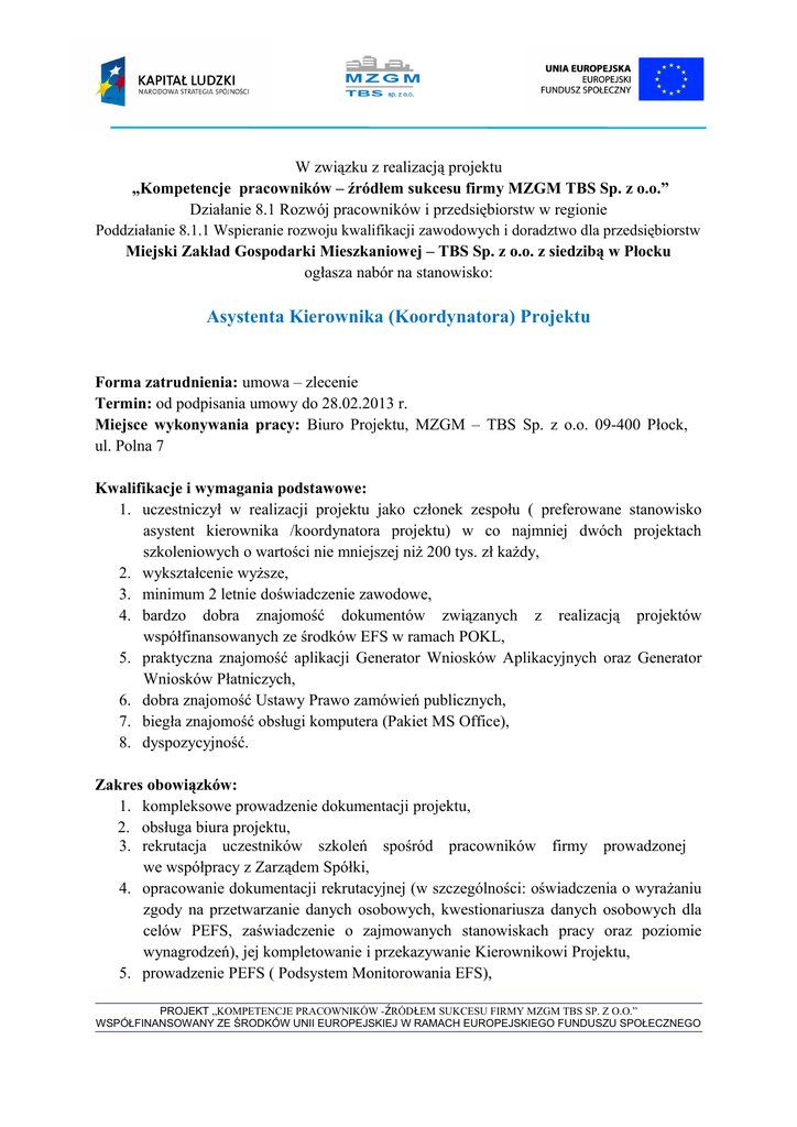 W związku z realizacją projektu „Kompetencje pracowników – źródłem sukcesu firmy MZGM TBS Sp. z o.o.” Działanie 8.1 Rozwój pracowników i przedsiębiorstw w regionie Poddziałanie 8.1.1 Wspieranie rozwoju kwalifikacji zawodowych i doradztwo dla przedsiębiorstw Miejski Zakład Gospodarki Mieszkaniowej – TBS Sp. z o.o. z siedzibą w Płocku ogłasza nabór na stanowisko: Asystenta Kierownika (Koordynatora) Projektu Forma zatrudnienia: umowa – zlecenie Termin: od podpisania umowy do 28.02.2013 r. Miejsce wykonywania pracy: Biuro Projektu, MZGM – TBS Sp. z o.o. 09-400 Płock, ul. Polna 7 Kwalifikacje i wymagania podstawowe: 1. uczestniczył w realizacji projektu jako członek zespołu ( preferowane stanowisko asystent kierownika /koordynatora projektu) w co najmniej dwóch projektach szkoleniowych o wartości nie mniejszej niż 200 tys. zł każdy, 2. wykształcenie wyższe, 3. minimum 2 letnie doświadczenie zawodowe, 4. bardzo dobra znajomość dokumentów związanych z realizacją projektów współfinansowanych ze środków EFS w ramach POKL, 5. praktyczna znajomość aplikacji Generator Wniosków Aplikacyjnych oraz Generator Wniosków Płatniczych, 6. dobra znajomość Ustawy Prawo zamówień publicznych, 7. biegła znajomość obsługi komputera (Pakiet MS Office), 8. dyspozycyjność. Zakres obowiązków: 1. kompleksowe prowadzenie dokumentacji projektu, 2. obsługa biura projektu, 3. rekrutacja uczestników szkoleń spośród pracowników firmy prowadzonej we współpracy z Zarządem Spółki, 4. opracowanie dokumentacji rekrutacyjnej (w szczególności: oświadczenia o wyrażaniu zgody na przetwarzanie danych osobowych, kwestionariusza danych osobowych dla celów PEFS, zaświadczenie o zajmowanych stanowiskach pracy oraz poziomie wynagrodzeń), jej kompletowanie i przekazywanie Kierownikowi Projektu, 5. prowadzenie PEFS ( Podsystem Monitorowania EFS), PROJEKT „KOMPETENCJE PRACOWNIKÓW -ŹRÓD ŁEM SUKCESU FIRMY MZGM TBS SP. Z O.O.” WSPÓŁFINANSOWANY ZE ŚRODKÓW UNII EUROPEJSKIEJ W RAMACH EUROPEJSKIEGO FUNDUSZU SPOŁECZNEGO 6. składanie zapotrzebowania, za pośrednictwem Kierownika Projektu, do Zarządu Spółki na dokonanie zakupu dostaw i usług niezbędnych do realizacji Projektu, 7. bieżące utrzymywanie kontaktów z wykonawcami usług szkoleniowych, hotelowych i gastronomicznych oraz monitoring ich usług, 8. przygotowanie sprawozdań z realizacji projektu w tym sporządzanie wniosków o płatność (część opisowa), aktualizacja wniosków o dofinansowanie, 9. prowadzenie promocji projektu zgodnie z wnioskiem o dofinansowanie i na zasadach określonych przez Kierownika Projektu, 10. wykonywanie innych zadań zleconych przez Kierownika Projektu, związanych z jego realizacją. Wymagane dokumenty: 1. curriculum vitae, 2. kserokopie świadectw oraz innych dokumentów potwierdzających doświadczenie na stanowisku asystenta kierownika projektu (referencje), 3. kserokopie dyplomów potwierdzających wykształcenie, 4. oświadczenie kandydata o niekaralności za przestępstwa popełnione umyślnie, 5. oświadczenie kandydata o pełnej zdolności do czynności prawnych oraz korzystaniu z pełni praw publicznych. Aplikacje należy składać do dnia 9 marca 2012 r. w sekretariacie Spółki w Płocku przy ul. Polnej 7 w godz. 7.30 – 15.30, w kopercie z dopiskiem: „Dotyczy naboru na stanowisko (nazwa stanowiska) projektu POKL „Kompetencje pracowników – źródłem sukcesu firmy MZGM TBS Sp. z o.o.” Dokumenty, które wpłyną do Sekretariatu Spółki po upływie wyżej określonego terminu nie będą rozpatrywane. Nabór odbędzie się 2 – etapowo: weryfikacja złożonych dokumentów, a następnie rozmowa kwalifikacyjna. Dodatkowych informacji na temat rekrutacji udzielać będzie p. Renata Bartkowska pod numerem tel. 24 364-03-10 Wymagane dokumenty powinny być opatrzone klauzulą: „Wyrażam zgodę na przetwarzanie moich danych osobowych zawartych w ofercie pracy dla potrzeb niezbędnych do realizacji procesu rekrutacji zgodnie z ustawą z dnia 29 sierpnia 1997 r. o ochronie danych osobowych (Dz.U. z 2002 r. Nr 133, poz. 883 z późn. zm.) PROJEKT „KOMPETENCJE PRACOWNIKÓW -ŹRÓD ŁEM SUKCESU FIRMY MZGM TBS SP. Z O.O.” WSPÓŁFINANSOWANY ZE ŚRODKÓW UNII EUROPEJSKIEJ W RAMACH EUROPEJSKIEGO FUNDUSZU SPOŁECZNEGO
