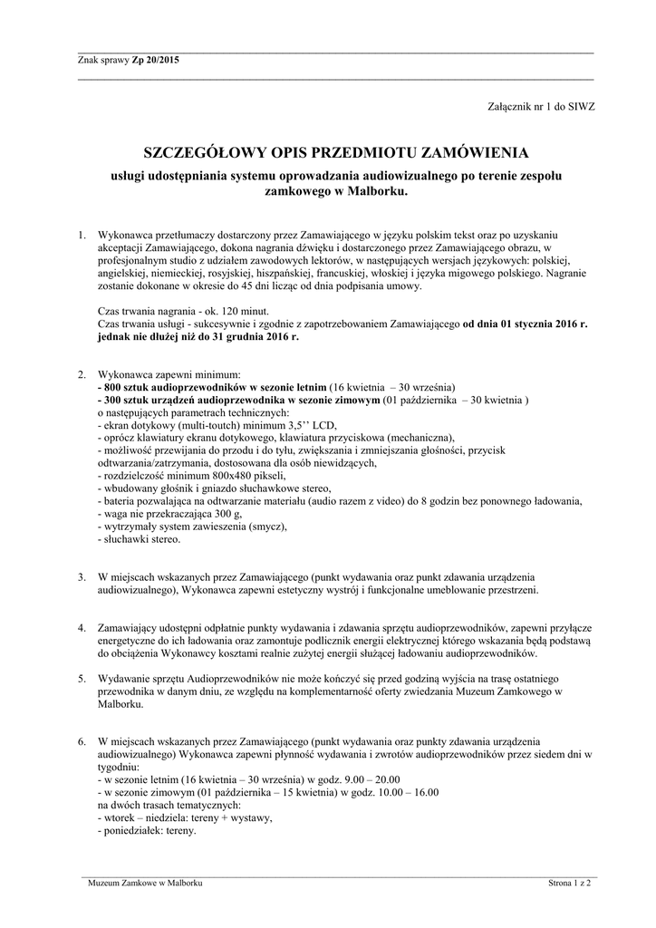 ______________________________________________________________________________ Znak sprawy Zp 20/2015 ______________________________________________________________________________ Załącznik nr 1 do SIWZ SZCZEGÓŁOWY OPIS PRZEDMIOTU ZAMÓWIENIA usługi udostępniania systemu oprowadzania audiowizualnego po terenie zespołu zamkowego w Malborku. 1. Wykonawca przetłumaczy dostarczony przez Zamawiającego w języku polskim tekst oraz po uzyskaniu akceptacji Zamawiającego, dokona nagrania dźwięku i dostarczonego przez Zamawiającego obrazu, w profesjonalnym studio z udziałem zawodowych lektorów, w następujących wersjach językowych: polskiej, angielskiej, niemieckiej, rosyjskiej, hiszpańskiej, francuskiej, włoskiej i języka migowego polskiego. Nagranie zostanie dokonane w okresie do 45 dni licząc od dnia podpisania umowy. Czas trwania nagrania - ok. 120 minut. Czas trwania usługi - sukcesywnie i zgodnie z zapotrzebowaniem Zamawiającego od dnia 01 stycznia 2016 r. jednak nie dłużej niż do 31 grudnia 2016 r. 2. Wykonawca zapewni minimum: - 800 sztuk audioprzewodników w sezonie letnim (16 kwietnia – 30 września) - 300 sztuk urządzeń audioprzewodnika w sezonie zimowym (01 października – 30 kwietnia ) o następujących parametrach technicznych: - ekran dotykowy (multi-toutch) minimum 3,5’’ LCD, - oprócz klawiatury ekranu dotykowego, klawiatura przyciskowa (mechaniczna), - możliwość przewijania do przodu i do tyłu, zwiększania i zmniejszania głośności, przycisk odtwarzania/zatrzymania, dostosowana dla osób niewidzących, - rozdzielczość minimum 800x480 pikseli, - wbudowany głośnik i gniazdo słuchawkowe stereo, - bateria pozwalająca na odtwarzanie materiału (audio razem z video) do 8 godzin bez ponownego ładowania, - waga nie przekraczająca 300 g, - wytrzymały system zawieszenia (smycz), - słuchawki stereo. 3. W miejscach wskazanych przez Zamawiającego (punkt wydawania oraz punkt zdawania urządzenia audiowizualnego), Wykonawca zapewni estetyczny wystrój i funkcjonalne umeblowanie przestrzeni. 4. Zamawiający udostępni odpłatnie punkty wydawania i zdawania sprzętu audioprzewodników, zapewni przyłącze energetyczne do ich ładowania oraz zamontuje podlicznik energii elektrycznej którego wskazania będą podstawą do obciążenia Wykonawcy kosztami realnie zużytej energii służącej ładowaniu audioprzewodników. 5. Wydawanie sprzętu Audioprzewodników nie może kończyć się przed godziną wyjścia na trasę ostatniego przewodnika w danym dniu, ze względu na komplementarność oferty zwiedzania Muzeum Zamkowego w Malborku. 6. W miejscach wskazanych przez Zamawiającego (punkt wydawania oraz punkty zdawania urządzenia audiowizualnego) Wykonawca zapewni płynność wydawania i zwrotów audioprzewodników przez siedem dni w tygodniu: - w sezonie letnim (16 kwietnia – 30 września) w godz. 9.00 – 20.00 - w sezonie zimowym (01 października – 15 kwietnia) w godz. 10.00 – 16.00 na dwóch trasach tematycznych: - wtorek – niedziela: tereny + wystawy, - poniedziałek: tereny. _____________________________________________________________________________________________________________________ Muzeum Zamkowe w Malborku Strona 1 z 2 ______________________________________________________________________________ Znak sprawy Zp 20/2015 ______________________________________________________________________________ 7. Wykonawca zapewni sprzęt z przynależnymi treściami (teksty, obrazy, odgłosy, muzyka) oraz organizację punktu wydawania i odbioru urządzeń. Osoby obsługujące punkt wydawania urządzeń winny znać język polski, angielski, niemiecki i rosyjski, w stopniu umożliwiającym swobodną komunikację. 8. Właścicielem użytkowanych na terenie Zamawiającego urządzeń jest Wykonawca i do niego należy serwisowanie oraz odpowiedzialność materialna za użytkowany przez turystów sprzęt. 9. Dostarczone przez Wykonawcę urządzenia, powinny posiadać stosowne atesty bezpieczeństwa i spełniać wymogi aktualnie obowiązujących przepisów bezpieczeństwa i higieny. 10. W ścisłym porozumieniu z Zamawiającym, Wykonawca zaprojektuje, wyprodukuje i umieści na trasie zwiedzania znaki informacyjne służące identyfikacji kierunku zwiedzania oraz dołączy do każdego wydanego audioprzewodnika plan zamku na którym umieszczone będą wyraźnie owe punkty orientacyjne. 11. W przypadku zaistnienia braków, potrzeb estetyzacji bądź konieczności wprowadzenia korekt w oznakowaniu trasy audioprzewodników, Wykonawca zobowiązany jest do ich niezwłocznego (najpóźniej w okresie 24 godzin licząc od godziny zgłoszenia) wykonania bądź uzupełnienia. 12. W przypadku wprowadzenia nowych wystaw do trasy zwiedzania, Wykonawca po otrzymaniu od Zamawiającego treści w języku polskim, przetłumaczy (w wersji językowej: angielskiej, niemieckiej, rosyjskiej, hiszpańskiej, francuskiej, włoskiej oraz języka migowego polskiego) i umieści w audioprzewodniku pliki audio wraz z otrzymanymi od Zamawiającego zdjęciami, w określonym w umowie terminie liczonym od daty otrzymania materiałów. 13. Dotrzymywanie terminów wprowadzania korekt w oznakowaniu trasy audioprzewodników oraz wprowadzania zmian w treściach umieszczonych w audioprzewodniku, jak również zapewnienie określonej minimalnej ilości audioprzewodników w sezonie letnim i zimowym, stanowią istotny element w ocenie należytego wykonania usługi. 14. Wykonawca zapewni informacje o sposobie użytkowania audioprzewodnika, które turysta będzie mógł uzyskać w punkcie ich wydawania a także w czasie zwiedzania, korzystając z zakładki POMOC, której wywołanie będzie możliwe w każdym momencie wędrówki przez zamek. 15. Wykonawca zobowiązany jest do codziennej weryfikacji stanu oznakowania trasy turystycznej w ten sposób, że niezwłocznie po otwarciu wystaw, dokona obchodu całej trasy, uzupełniając powstałe ubytki bądź estetyzując stan oznakowania. 16. Pu