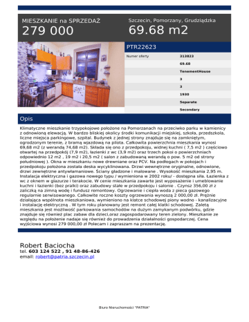 MIESZKANIE na SPRZEDAŻ 279 000 Szczecin, Pomorzany, Grudziądzka 69.68 m2 PTR22623 Numer oferty 313823 69.68 TenementHouse 3 3 1930 Separate Secondary Opis Klimatyczne mieszkanie trzypokojowe położone na Pomorzanach na przeciwko parku w kamienicy z odnowioną elewacją. W bardzo bliskiej okolicy środki komunikacji miejskiej, szkoła, przedszkola, liczne miejsca parkingowe, szpital. Budynek z jednej strony znajduje się na zamkniętym, ogrodzonym terenie, z bramą wjazdową na pilota. Całkowita powierzchnia mieszkania wynosi 69,68 m2 (z werandą 74,68 m2). Składa się ono z przedpokoju, widnej kuchni ( 7,5 m2 ) częściowo otwartej na przedpokój (7,9 m2), łazienki z wc (3,9 m2) oraz trzech pokoi o powierzchniach odpowiednio 12 m2 , 19 m2 i 20,5 m2 ( salon z zabudowaną werandą o pow. 5 m2 od strony południowej ). Okna w mieszkaniu nowe drewniane oraz PCV. Na podłogach w pokojach i przedpokoju położona została deska wycyklinowana. Drzwi wewnętrzne oryginalne, odnowione, drzwi zewnętrzne antywłamaniowe. Ściany gładzone i malowane . Wysokość mieszkania 2,95 m. Instalacja elektryczna i gazowa nowego typu / wymieniona w 2002 roku/ - dostępna siła. Łazienka z wc z oknem w glazurze i terakocie. W cenie mieszkania zawarte jest wyposażenie i umeblowanie kuchni i łazienki (bez pralki) oraz zabudowy stałe w przedpokoju i salonie . Czynsz 356,00 zł z zaliczką na zimną wodę i fundusz remontowy. Ogrzewanie i ciepła woda z pieca gazowego regularnie serwisowanego. Całkowite roczne koszty ogrzewania wynoszą 2 000,00 zł. Prężnie działająca wspólnota mieszkaniowa, wymieniono na klatce schodowej piony wodno - kanalizacyjne i instalację elektryczną . W tym roku planowany jest remont całej klatki schodowej. Zaletą mieszkania jest możliwość parkowania samochodów na dużym zamykanym podwórku, gdzie znajduje się również plac zabaw dla dzieci,oraz zagospodarowany teren zielony. Mieszkanie ze względu na położenie nadaje się również do prowadzenia działalności gospodarczej. Cena wyjściowa wynosi 279 000,00 zł Polecam i zapraszam na prezentację. Robert Baciocha tel. 603 124 522 , 91 48-86-426 email: [email protected] Biuro Nieruchomości "PATRIA" Powered by TCPDF (www.tcpdf.org)