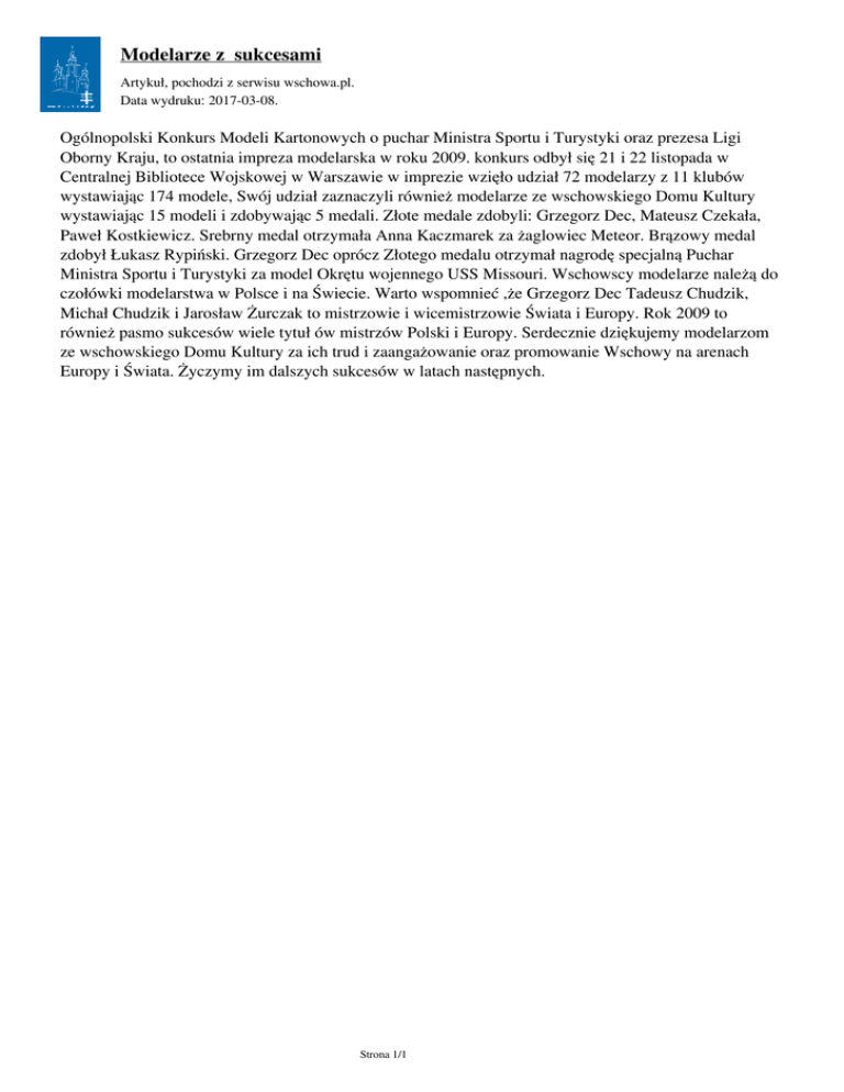 Modelarze z sukcesami Artykuł‚ pochodzi z serwisu wschowa.pl. Data wydruku: 2017-03-08. Ogólnopolski Konkurs Modeli Kartonowych o puchar Ministra Sportu i Turystyki oraz prezesa Ligi Oborny Kraju, to ostatnia impreza modelarska w roku 2009. konkurs odbył się 21 i 22 listopada w Centralnej Bibliotece Wojskowej w Warszawie w imprezie wzięło udział 72 modelarzy z 11 klubów wystawiając 174 modele, Swój udział zaznaczyli również modelarze ze wschowskiego Domu Kultury wystawiając 15 modeli i zdobywając 5 medali. Złote medale zdobyli: Grzegorz Dec, Mateusz Czekała, Paweł Kostkiewicz. Srebrny medal otrzymała Anna Kaczmarek za żaglowiec Meteor. Brązowy medal zdobył Łukasz Rypiński. Grzegorz Dec oprócz Złotego medalu otrzymał nagrodę specjalną Puchar Ministra Sportu i Turystyki za model Okrętu wojennego USS Missouri. Wschowscy modelarze należą do czołówki modelarstwa w Polsce i na Świecie. Warto wspomnieć ,że Grzegorz Dec Tadeusz Chudzik, Michał Chudzik i Jarosław Żurczak to mistrzowie i wicemistrzowie Świata i Europy. Rok 2009 to również pasmo sukcesów wiele tytuł ów mistrzów Polski i Europy. Serdecznie dziękujemy modelarzom ze wschowskiego Domu Kultury za ich trud i zaangażowanie oraz promowanie Wschowy na arenach Europy i Świata. Życzymy im dalszych sukcesów w latach następnych. Strona 1/1 Powered by TCPDF (www.tcpdf.org)