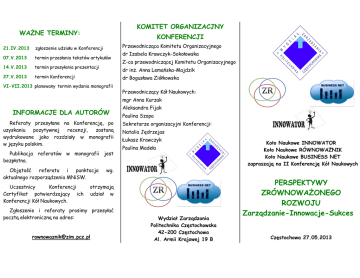 KOMITET ORGANIZACJNY WAŻNE TERMINY: KONFERENCJI Przewodnicząca Komitetu Organizacyjnego 21.IV.2013 zgłoszenie udziału w Konferencji 07.V.2013 termin przesłania tekstów artykułów 14.V.2013 termin przesyłania prezentacji 27.V.2013 termin Konferencji dr Izabela Krawczyk-Sokołowska Z-ca przewodniczącej Komitetu Organizacyjnego dr inż. Anna Lemańska-Majdzik dr Bogusława Ziółkowska VI-VII.2013 planowany termin wydania monografii Przewodniczący Kół Naukowych: mgr Anna Kurzak INFORMACJE DLA AUTORÓW Referaty przesyłane na Konferencję, po uzyskaniu pozytywnej recenzji, zostaną wydrukowane jako rozdziały w monografii w języku polskim. Publikacja referatów w monografii jest bezpłatna. Objętość referatu i punktacja aktualnego rozporządzenia MNiSW. Uczestnicy Konferencji Certyfikat potwierdzający ich Konferencji Kół Naukowych. Aleksandra Fijak Paulina Szopa Sekretarze organizacyjni Konferencji: Natalia Jędrzejas Łukasz Krawczyk Paulina Madeła wg. otrzymają udział w Zgłoszenie i referaty prosimy przesyłać pocztą elektroniczną na adres: [email protected] Wydział Zarządzania Politechnika Częstochowska 42-200 Częstochowa Al. Armii Krajowej 19 B Koło Naukowe INNOWATOR Koło Naukowe RÓWNOWAŻNIK Koło Naukowe BUSINESS NET zapraszają na II Konferencję Kół Naukowych PERSPEKTYWY ZRÓWNOWAŻONEGO ROZWOJU Zarządzanie-Innowacje-Sukces Częstochowa 27.05.2013 CEL KONFERENCJI GŁÓWNE PROBLEMY TEMATYCZNE Celem konferencji jest podkreślenie roli zrównoważonego społeczno-ekonomicznego rozwoju w biznesie i współczesnym społeczeństwie. Teoretyczne aspekty zrównoważonego rozwoju Kluczowym przesłaniem konferencji jest wskazanie szans oraz zagrożeń związanych ze społecznymi, ekologicznymi i ekonomicznymi obszarami zrównoważonego rozwoju. Metody ilościowe a zrównoważony rozwój Wyzwania i determinanty zrównoważonego rozwoju Zrównoważone zarządzanie przedsiębiorstwem Relacje człowiek- środowisko Zielone technologie Zrównoważony rozwój a innowacje Tematyka konferencji obejmuje zagadnienia z zakresu zarządzania, innowacji oraz szeroko rozumianego sukcesu przedsiębiorstwa w aspekcie zrównoważonego rozwoju. Wykorzystanie Technologii Informatycznych w biznesie Uwarunkowania sukcesu przedsiębiorstwa Sukces a zrównoważony rozwój HONOROWA RADA NAUKOWA Przewodniczący Rady Naukowej: Prof. dr hab. Alfreda Zachorowska (Politechnika Częstochowska) Prof. PCz. dr hab. Eugeniusz Sitek (Politechnika Częstochowska) Członkowie Rady: Prof. dr hab. Maria Nowicka-Skowron (J. M . Rektor Politechniki Częstochowskiej) Prof. dr hab. Arnold Pabian (Dziekan Wydziału Zarządzania Politechniki Częstochowskiej) Prof. dr hab. Krzysztof Marecki (S G H w Warszawie)