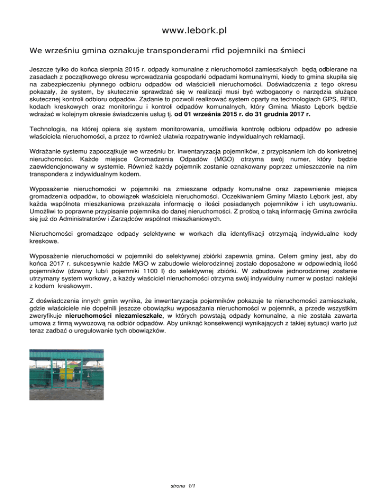www.lebork.pl We wrześniu gmina oznakuje transponderami rfid pojemniki na śmieci Jeszcze tylko do końca sierpnia 2015 r. odpady komunalne z nieruchomości zamieszkałych będą odbierane na zasadach z początkowego okresu wprowadzania gospodarki odpadami komunalnymi, kiedy to gmina skupiła się na zabezpieczeniu płynnego odbioru odpadów od właścicieli nieruchomości. Doświadczenia z tego okresu pokazały, że system, by skutecznie sprawdzać się w realizacji musi być wzbogacony o narzędzia służące skutecznej kontroli odbioru odpadów. Zadanie to pozwoli realizować system oparty na technologiach GPS, RFID, kodach kreskowych oraz monitoringu i kontroli odpadów komunalnych, który Gmina Miasto Lębork będzie wdrażać w kolejnym okresie świadczenia usług tj. od 01 września 2015 r. do 31 grudnia 2017 r. Technologia, na której opiera się system monitorowania, umożliwia kontrolę odbioru odpadów po adresie właściciela nieruchomości, a przez to również ułatwia rozpatrywanie indywidualnych reklamacji. Wdrażanie systemu zapoczątkuje we wrześniu br. inwentaryzacja pojemników, z przypisaniem ich do konkretnej nieruchomości. Każde miejsce Gromadzenia Odpadów (MGO) otrzyma swój numer, który będzie zaewidencjonowany w systemie. Również każdy pojemnik zostanie oznakowany poprzez umieszczenie na nim transpondera z indywidualnym kodem. Wyposażenie nieruchomości w pojemniki na zmieszane odpady komunalne oraz zapewnienie miejsca gromadzenia odpadów, to obowiązek właściciela nieruchomości. Oczekiwaniem Gminy Miasto Lębork jest, aby każda wspólnota mieszkaniowa przekazała informację o ilości posiadanych pojemników i ich usytuowaniu. Umożliwi to poprawne przypisanie pojemnika do danej nieruchomości. Z prośbą o taką informację Gmina zwróciła się już do Administratorów i Zarządców wspólnot mieszkaniowych. Nieruchomości gromadzące odpady selektywne w workach dla identyfikacji otrzymają indywidualne kody kreskowe. Wyposażenie nieruchomości w pojemniki do selektywnej zbiórki zapewnia gmina. Celem gminy jest, aby do końca 2017 r. sukcesywnie każde MGO w zabudowie wielorodzinnej zostało doposażone w odpowiednią ilość pojemników (dzwony lub/i pojemniki 1100 l) do selektywnej zbiórki. W zabudowie jednorodzinnej zostanie utrzymany system workowy, a każdy właściciel nieruchomości otrzyma swój indywidulny numer w postaci naklejki z kodem kreskowym. Z doświadczenia innych gmin wynika, że inwentaryzacja pojemników pokazuje te nieruchomości zamieszkałe, gdzie właściciele nie dopełnili jeszcze obowiązku wyposażania nieruchomości w pojemnik, a przede wszystkim zweryfikuje nieruchomości niezamieszkałe, w których powstają odpady komunalne, a nie została zawarta umowa z firmą wywozową na odbiór odpadów. Aby uniknąć konsekwencji wynikających z takiej sytuacji warto już teraz zadbać o uregulowanie tych obowiązków. strona 1/1 Powered by TCPDF (www.tcpdf.org)
