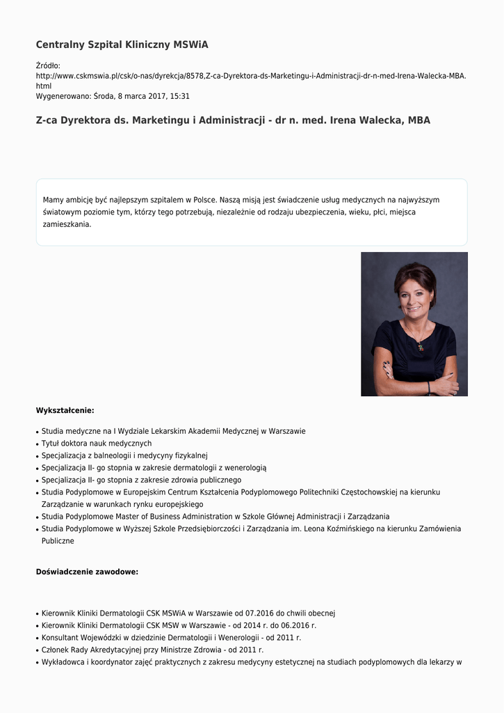 Centralny Szpital Kliniczny MSWiA Źródło: http://www.cskmswia.pl/csk/o-nas/dyrekcja/8578,Z-ca-Dyrektora-ds-Marketingu-i-Administracji-dr-n-med-Irena-Walecka-MBA. html Wygenerowano: Środa, 8 marca 2017, 15:31 Z-ca Dyrektora ds. Marketingu i Administracji - dr n. med. Irena Walecka, MBA Mamy ambicję być najlepszym szpitalem w Polsce. Naszą misją jest świadczenie usług medycznych na najwyższym światowym poziomie tym, którzy tego potrzebują, niezależnie od rodzaju ubezpieczenia, wieku, płci, miejsca zamieszkania. Wykształcenie: ● Studia medyczne na I Wydziale Lekarskim Akademii Medycznej w Warszawie ● Tytuł doktora nauk medycznych ● Specjalizacja z balneologii i medycyny fizykalnej ● Specjalizacja II- go stopnia w zakresie dermatologii z wenerologią ● Specjalizacja II- go stopnia z zakresie zdrowia publicznego ● Studia Podyplomowe w Europejskim Centrum Kształcenia Podyplomowego Politechniki Częstochowskiej na kierunku Zarządzanie w warunkach rynku europejskiego ● Studia Podyplomowe Master of Business Administration w Szkole Głównej Administracji i Zarządzania ● Studia Podyplomowe w Wyższej Szkole Przedsiębiorczości i Zarządzania im. Leona Koźmińskiego na kierunku Zamówienia Publiczne Doświadczenie zawodowe: ● Kierownik Kliniki Dermatologii CSK MSWiA w Warszawie od 07.2016 do chwili obecnej ● Kierownik Kliniki Dermatologii CSK MSW w Warszawie - od 2014 r. do 06.2016 r. ● Konsultant Wojewódzki w dziedzinie Dermatologii i Wenerologii - od 2011 r. ● Członek Rady Akredytacyjnej przy Ministrze Zdrowia - od 2011 r. ● Wykładowca i koordynator zajęć praktycznych z zakresu medycyny estetycznej na studiach podyplomowych dla lekarzy w ramach Warszawskiego Uniwersytetu Medycznego - od 2011 r. ● Dyrektor/Wicedyrektor Departamentu Zdrowia MSW w latach 2008 – 2013 ● Z-ca Dyrektora ds. Marketingu i Administracji CSK MSWiA - od 2003 r. ● Z-ca Dyrektora ds. Marketingu i Zamówień Publicznych CSK MSWiA - 2001-2003 r. ● Kierownik Działu Marketingu i Zamówień Publicznych - w latach 1998 - 2001 ● Naczelnik Wydziału Profilaktyki i Lecznictwa Centralnego Zarządu Służby Zdrowia MSWiA - w latach 1998 - 1999 ● Starszy asystent Kliniki Dermatologii CSK MSWiA - w latach 1994 - 2014 Kontakt: Telefon: (22) 508 18 13 Faks: (22) 508 18 24 e-mail: [email protected] Drukuj Generuj PDF Powiadom znajomego Wstecz