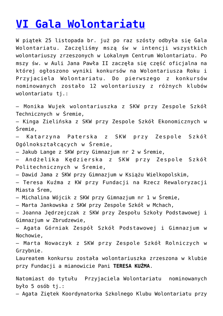VI Gala Wolontariatu W piątek 25 listopada br. już po raz szósty odbyła się Gala Wolontariatu. Zaczęliśmy mszą św w intencji wszystkich wolontariuszy zrzeszonych w Lokalnym Centrum Wolontariatu. Po mszy św. w Auli Jana Pawła II zaczęła się część oficjalna na której ogłoszono wyniki konkursów na Wolontariusza Roku i Przyjaciela Wolontariatu. Do pierwszego z konkursów nominowanych zostało wolontariatu tj.: 12 wolontariuszy z różnych klubów – Monika Wujek wolontariuszka z SKW przy Zespole Szkół Technicznych w Śremie, – Kinga Zielińska z SKW przy Zespole Szkół Ekonomicznych w Śremie, – Katarzyna Paterska z SKW przy Zespole Szkół Ogólnokształcących w Śremie, – Jakub Lange z SKW przy Gimnazjum nr 2 w Śremie, – Andżelika Kędzierska z SKW przy Zespole Szkół Politechnicznych w Śremie, – Dawid Jama z SKW przy Gimnazjum w Książu Wielkopolskim, – Teresa Kuźma z KW przy Fundacji na Rzecz Rewaloryzacji Miasta Śrem, – Michalina Wójcik z SKW przy Gimnazjum nr 1 w Śremie, – Marta Jankowska z SKW przy Zespole Szkół w Mchach, – Joanna Jędrzejczak z SKW przy Zespołu Szkoły Podstawowej i Gimnazjum w Zbrudzewie, – Agata Górniak Zespół Szkół Podstawowej i Gimnazjum w Nochowie, – Marta Nowaczyk z SKW przy Zespole Szkół Rolniczych w Grzybnie. Laureatem konkursu została wolontariuszka zrzeszona w klubie przy Fundacji a mianowicie Pani TERESA KUŹMA. Natomiast do tytułu Przyjaciela Wolontariatu nominowanych było 5 osób tj.: – Agata Ziętek Koordynatorka Szkolnego Klubu Wolontariatu przy Zespole Szkół Podstawowej i Gimnazjum w Nochowie, – Magdalena Wojciechowska Koordynatorka pracy wolontariuszy w Domu Pomocy Społecznej w Śremie, – Beata Szczepaniak Kierownik Rejonu Usług Opiekuńczych Polskiego Komitetu Pomocy w Śremie, – Grażyna Tokarek Dyrektor Zespołu Szkół Rolniczych w Grzybnie, – Anna Sobieraj pracownik Fundacji na Rzecz Rewaloryzacji Miasta Śrem. Tytuł Przyjaciela Wolontariatu 2011 otrzymała Pani AGATA ZIĘTEK. Oprawę muzyczną podczas Gali zabezpieczyli wolontariusze z Mchów Andżelika i Kacper. Wykonali oni dwa utwory muzyczne na flecie poprzecznym i organach oraz zespół rockowy który zaprezentował nam „czadowo” 3 utwory. Natomiast dyskotekę dla uczestników jak co roku zabezpieczają nam wolontariusze Marcin Wojta i Damian Grabny którzy bawią nas do ostatniego tchu. Obsługę gastronomiczną jak co roku zabezpieczają wolontariusze z Zespołu Szkół Politechnicznych w Śremie. Dziękujemy wszystkim uczestnikom za udział w Gali. Piątkowa impreza nie odbyłaby się gdyby nie wsparcie finansowe z Gminy Śrem, Starostwa Śremskiego i Województwa Wielkopolskiego. http://www.youtube.com/watch?v=cE0I5nUaMJs Przygotawania Wolontariatu do VI Gali Trwają przygotowania do mającej się odbyć w Piątek 25 Listopada 2011r. 6 Gali Wolontariatu. Na którą zapraszamy wolontariuszy zrzeszonych w Lokalnym Centrum Wolontariatu. Program Imprezy: 17-00 Msza Święta w kościele dolnym pod wezwaniem NSJ w Śremie. 18-00 Cześć artystyczna w Auli Jana Pawła II, ogłoszenie wyników konkursów na Wolontariusza Roku 2011 i Przyjaciela Wolontariatu 2011. 20-00 Dyskoteka dla wolontariuszy. 22-00 Zakończenie Gali. Szkolenia dla wolontariuszy Serdecznie zapraszamy następujące szkolenia: zainteresowanych wolontariuszy na Pierwsza pomoc 17,18,19 Listopad 2011r. Asystent wychowawcy w placówce opiekuńczo wychowawczej 16 i 18 Listopad 2011r. Bliższe informacje w Biurze Fundacji lub pod numerem: 61 28-30-798 Szkolenia są finansowane z budżetu Gminy Śrem, Wojewody Wielkopolskiego oraz środków własnych Fundacji