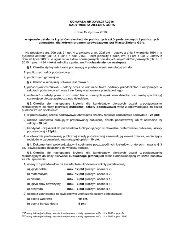 UCHWAŁA NR XXVII.277.2016 RADY MIASTA ZIELONA GÓRA z dnia 15 stycznia 2016 r. w sprawie ustalenia kryteriów rekrutacji do publicznych szkół podstawowych i publicznych gimnazjów, dla których organem prowadzącym jest Miasto Zielona Góra. Na podstawie art. 20e ust. 3 i ust. 4 w związku z art. 20zf pkt 1 ustawy z dnia 7 września 1991 r. o systemie oświaty (Dz. U. z 2015 r. poz. 2156 – tekst jednolity z późn. zm.1)) i art. 4 ust. 2 ustawy z dnia 20 lipca 2000 r. o ogłaszaniu aktów normatywnych i niektórych innych aktów prawnych (Dz. U. z 2015 r. poz. 1484 – tekst jednolity z późn. zm.2)) uchwala się, co następuje: § 1. Określa się kryteria brane pod uwagę w postępowaniu rekrutacyjnym do: 1) publicznych szkół podstawowych; 2) publicznych gimnazjów. § 2. Ilekroć w niniejszej uchwale jest mowa o: 1) publicznymprzedszkolu - należy przez to rozumieć także oddziały przedszkolne funkcjonujące w szkołach podstawowych oraz inne formy wychowania przedszkolnego; 2) rodzicach - należy przez to rozumieć także prawnych opiekunów dziecka oraz osoby (podmioty) sprawujące pieczę zastępczą nad dzieckiem. § 3. Określa się następujące kryteria dla kandydatów biorących udział w postępowaniu rekrutacyjnym do klasy pierwszej publicznej szkoły podstawowej wraz z odpowiadającą im liczbą punktów za ich spełnienie: 1) w preferowanej szkole podstawowej obowiązek szkolny realizuje rodzeństwo kandydata - 25 pkt; 2) rodzice kandydata pracują w preferowanej publicznej szkole podstawowej lub w obwodzie tej szkoły - 20 pkt; 3) kandydat uczęszczał do przedszkola funkcjonującego w obwodzie preferowanej publicznej szkoły podstawowej - 15pkt; 4) w obwodzie preferowanej publicznej szkoły podstawowej zamieszkują krewni dziecka, wspierający rodziców w zapewnieniu mu należytej opieki - 10 pkt. § 4. Dokumentami potwierdzającymi spełnianie poszczególnych kryteriów, o których mowa w § 3 są, oświadczenia dołączone do wniosku rodzica. § 5. Określa się następujące kryteria dla kandydatów biorących udział w postępowaniu rekrutacyjnym do klasy pierwszej publicznego gimnazjum wraz z odpowiadającą im liczbą punktów za ich spełnienie: 1) oceny z 5 przedmiotów na świadectwie ukończenia szkoły podstawowej: a) język polski max. 12 pkt (iloczyn: ocena x 2), b) matematyka max. 12 pkt (iloczyn: ocena x 2), c) historia max. 6 pkt (iloczyn: ocena x 1), d) język obcy nowożytny max. 6 pkt (iloczyn: ocena x 1), e) przyroda max. 6 pkt (iloczyn: ocena x 1); 2) ocena z zachowania na świadectwie ukończenia szkoły podstawowej: a) ocena wzorowa 10 pkt, b) ocena bardzo dobra 8 pkt, 1) Zmiany 2) Zmiany tekstu jednolitego wymienionej ustawy zostały ogłoszone w Dz. U. z 2016 r. poz. 64. tekstu jednolitego wymienionej ustawy zostały ogłoszone w Dz. U. z 2015 r. poz. 1890. c) ocena dobra 6 pkt; 3) świadectwo ukończenia szkoły podstawowej z wyróżnieniem - 8 pkt; 4) inne osiągnięcia wymienione na świadectwie ukończenia szkoły podstawowej (max. 20 pkt): a) aktywna i systematyczna praca na rzecz społeczności w formie wolontariatu lub działalności w samorządnie uczniowskim, trwająca co najmniej 1 rok szkolny - 5 pkt, b) inne: - zajęcie I, II lub III miejsca w zawodach wiedzy, artystycznych i sportowych, organizowanych przez kuratora oświaty na szczeblu wojewódzkim – 10 pkt, - zajęcie I, II lub III miejsca w zawodach wiedzy, artystycznych i sportowych, organizowanych przez kuratora oświaty na szczeblu powiatowym – 5 pkt, - uzyskanie tytułu finalisty w konkursach przedmiotowych na ostatnim organizowanych i współorganizowanych przez kuratorów oświaty – 10 pkt; szczeblu 5) rodzeństwo kandydata uczęszcza do publicznego gimnazjum, do którego o przyjęcie stara się kandydat - 10 pkt. § 6. Dokumentami niezbędnymi do potwierdzenia kryteriów określonych w § 5 jest potwierdzona za zgodność z oryginałem przez dyrektora szkoły podstawowej kopia świadectwa ukończenia szkoły podstawowej lub zaświadczenie z publicznego gimnazjum, o którym mowa § 5 pkt 5. § 7. Kryteria określone w § 3 i § 5 niniejszej uchwały wraz z odpowiadającą im liczbą punktów oraz dokumentami potwierdzającymi ich spełnianie mają zastosowanie w postępowaniach rekrutacyjnych do publicznych szkół podstawowych oraz publicznych gimnazjów dysponujących wolnymi miejscami, począwszy od roku szkolnego 2016/2017. § 8. Wykonanie uchwały powierza się Prezydentowi Miasta Zielona Góra. § 9. Uchwała wchodzi w życie z dniem ogłoszenia w Dzienniku Urzędowym Województwa Lubuskiego. Wiceprzewodniczący Rady Marcin Bogusław Pabierowski