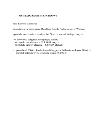 OŚWIADCZENIE MAJĄTKOWE Pani ElŜbieta Ziemecka Zatrudniona na stanowisku Dyrektora Szkoły Podstawowej w Wabczu - posiada mieszkanie o powierzchni 50 m ² o wartości 65 tyś. złotych - w 2009 roku osiągnęła następujący dochód : a) z tytułu zatrudnienia – 61.150,88 złotych b) z tytułu umowy zlecenia – 5.578,29 złotych − posiada od 2006 r. kredyt konsolidacyjny w Polbanku na kwotę 70 tyś. zł i kredyt gotówkowy w Deutsche Banku 48,500 zł