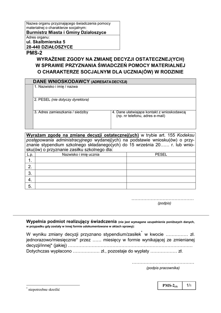 Załącznik Nr 3 do zarządzenia Nr 47/2010 Burmistrza Miasta i Gminy w Działoszycach z dnia 24 sierpnia 2010 r. Nazwa organu przyznającego świadczenia pomocy materialnej o charakterze socjalnym: Burmistrz Miasta i Gminy Działoszyce Adres organu: ul. Skalbmierska 5 28-440 DZIAŁOSZYCE PMS-2 WYRAŻENIE ZGODY NA ZMIANĘ DECYZJI OSTATECZNEJ(YCH) W SPRAWIE PRZYZNANIA ŚWIADCZEŃ POMOCY MATERIALNEJ O CHARAKTERZE SOCJALNYM DLA UCZNIA(ÓW) W RODZINIE DANE WNIOSKODAWCY (ADRESATA DECYZJI) 1. Nazwisko i imię / nazwa 2. PESEL (nie dotyczy dyrektora) 3. Adres zamieszkania / siedziby 4. Dane ułatwiające kontakt z wnioskodawcą (np. nr telefonu, adres e-mail) Wyrażam zgodę na zmianę decyzji ostatecznej(ych) w trybie art. 155 Kodeksu postępowania administracyjnego wydanej(ych) na podstawie wniosku(ów) o przyznanie stypendium szkolnego składanego(ych) do 15 września 20…… r. lub wniosku(ów) o przyznanie zasiłku szkolnego dla: L.p. Nazwisko i imię ucznia PESEL 1. 2. 3. 4. 5. …………………………………… (podpis) Wypełnia podmiot realizujący świadczenia (nie jest wymagane uzupełnienie poniższych danych, w przypadku gdy zostały w innej formie udokumentowane w aktach sprawy): * W wyniku zmiany decyzji przyznano stypendium/zasiłek w kwocie …………… zł. jednorazowo/miesięcznie* przez …… miesięcy w formie wynikającej ze zmienianej decyzji/innej* (jakiej) ………………………………………………………………………… Dotychczas wypłacono ……………… zł., pozostaje do wypłaty ……………… zł. …………………………………… (podpis pracownika) * PMS-2(4) niepotrzebne skreślić 1/1