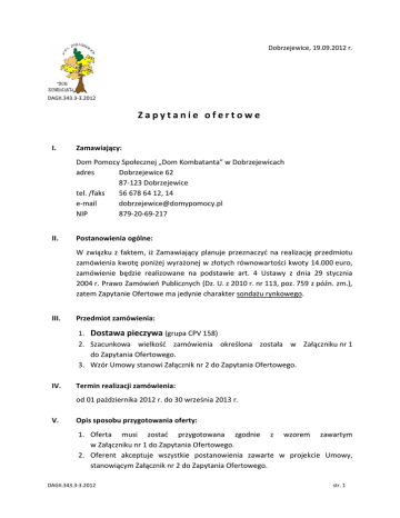 Dobrzejewice, 19.09.2012 r. DAGII.343.3-3.2012 Zapytanie ofertowe I. Zamawiający: Dom Pomocy Społecznej „Dom Kombatanta” w Dobrzejewicach adres Dobrzejewice 62 87-123 Dobrzejewice tel. /faks 56 678 64 12, 14 e-mail [email protected] NIP 879-20-69-217 II. Postanowienia ogólne: W związku z faktem, iż Zamawiający planuje przeznaczyć na realizację przedmiotu zamówienia kwotę poniżej wyrażonej w złotych równowartości kwoty 14.000 euro, zamówienie będzie realizowane na podstawie art. 4 Ustawy z dnia 29 stycznia 2004 r. Prawo Zamówień Publicznych (Dz. U. z 2010 r. nr 113, poz. 759 z późn. zm.), zatem Zapytanie Ofertowe ma jedynie charakter sondażu rynkowego. III. Przedmiot zamówienia: 1. Dostawa pieczywa (grupa CPV 158) 2. Szacunkowa wielkość zamówienia określona została w Załączniku nr 1 do Zapytania Ofertowego. 3. Wzór Umowy stanowi Załącznik nr 2 do Zapytania Ofertowego. IV. Termin realizacji zamówienia: od 01 października 2012 r. do 30 września 2013 r. V. Opis sposobu przygotowania oferty: 1. Oferta musi zostać przygotowana zgodnie z wzorem zawartym w Załączniku nr 1 do Zapytania Ofertowego. 2. Oferent akceptuje wszystkie postanowienia zawarte w projekcie Umowy, stanowiącym Załącznik nr 2 do Zapytania Ofertowego. DAGII.343.3-3.2012 str. 1 VI. Miejsce i termin składania ofert: 1. Ofertę należy złożyć do dnia 25 września 2012 r. do godziny 900 w Sekretariacie Zamawiającego w Dobrzejewicach lub drogą elektroniczną na adres [email protected] 2. Ocena złożonych ofert odbędzie się w siedzibie Zamawiającego w dniu 25 września 2012 r. 3. Zamawiający zastrzega sobie prawo do żądania od Oferentów wyjaśnień dotyczących treści złożonych przez nich ofert oraz korekty błędów arytmetycznych. VII. Kryterium wyboru oferty: Najniższa zaoferowana cena (waga kryterium- 100%) VIII. Informacje dotyczące wyboru najkorzystniejszej oferty: O wyborze najkorzystniejszej oferty Zamawiający zawiadomi niezwłocznie wszystkie podmioty, które przesłały oferty w ustalonym terminie. Jeżeli firma, której oferta została uznana za najkorzystniejszą uchyla się od zawarcia umowy, Zamawiający może wybrać ofertę najkorzystniejszą spośród pozostałych ofert. IX. Załączniki: 1. Załącznik nr 1- Formularz Ofertowy 2. Załącznik nr 2- Wzór Umowy X. Osoba uprawniona do udzielania informacji: starszy inspektor Wojciech Lassota tel. 56 678 64 12 w. 31 w dni powszednie w godzinach 830-1500 ………………………………………………….. DAGII.343.3-3.2012 str. 2 Pieczęć wykonawcy ………………………………………………………… dnia ……………………………… r. FORMULARZ OFERTOWY na dostawę pieczywa (CPV 158) o wartości szacunkowej poniżej 14 000 € dla Domu Pomocy Społecznej „Dom Kombatanta” w Dobrzejewicach w okresie 01.10.2012 r.-30.09.2013 r. 1. Nazwa i adres wykonawcy: ………………………………………………………………………………………………………………………………………………………………………………………………………… ………………………………………………………………………………………………………………………………………………………………………………………………………… ………………………………………………………………………………………………………………………………………………………………………………………………………… tel./faks ……………………………………………………………………………… NIP ………………………………………………………………………………… 2. Oferuję wykonanie zamówienia, którego szczegóły przedstawione są na kolejnej stronie Formularza Ofertowego za łączną kwotę: cena (brutto): …………………………………………………………… zł. słownie: ………………………………………………………………………………………………………………………………………………………………………………………………………… 3. Akceptuję postanowienia zawarte w projekcie Umowy. ………………………………………………………………………………………………………………………………………………………………………………………………………… (Podpisy osoby/osób upoważnionych do reprezentowania podmiotu składającego ofertę) DAGII.343.3-4.2012 ZAŁ.1- Formularz Ofertowy Formularz Ofertowy Lp. Artykuł Potrzeby roczne Proponowana gramatura (kg) 1 2 3 4 Ilość (potrzeby roczne/gramatura) 5 3/4 JM Cena jedn. (zł) brutto Wartość brutto (zł) 6 7 8 1 Bułka tarta 84 kg 84 kg 2 Bułka kajzerka 83 szt 83 szt 3 Bułka wrocławska krojona 5 1479,15 kg szt Chleb graham krojony 679 kg szt 6 Chleb razowy krojony 679 kg szt 7 Chleb zwykły krojony 3165 kg szt 8 Drożdże 17 kg 17 kg Razem: Pieczęć firmy DAGII.343.3-4.2012 - Data, podpis(-y) ZAŁ.1 zł ZAŁĄCZNIK NR 2 UMOWA nr _______________ zawarta w dniu _ _ _ _ _ _ _ _ _ _ 2012 r. w Dobrzejewicach pomiędzy Domem Pomocy Społecznej „Dom Kombatanta” w Dobrzejewicach, 87-123 Dobrzejewice, zwanym dalej "Nabywcą", reprezentowanym przez __________ __________, a _________________________________, __________________________________________________________ z siedzibą w _ _ _ _ _ _ _ _ _ _ _ _ _ _ pod numerem _ _ _ _ _ _ , 00-000 Miejscowość, #NIP _ _ _ - _ _ - _ _ - _ _ _ , zwanym dalej "Sprzedawcą". 1. 2. 3. 4. 5. 6. 7. 1. 2. 3. § 1. Sprzedawca zobowiązuje się sprzedawać a Nabywca kupować następujące artykuły będące wyrobami Sprzedawcy: - chleb krojony …. gr w cenie … zł za sztukę, - chleb razowy krojony … gr w cenie …. zł za sztukę, - chleb graham krojony …. gr w cenie …. zł 