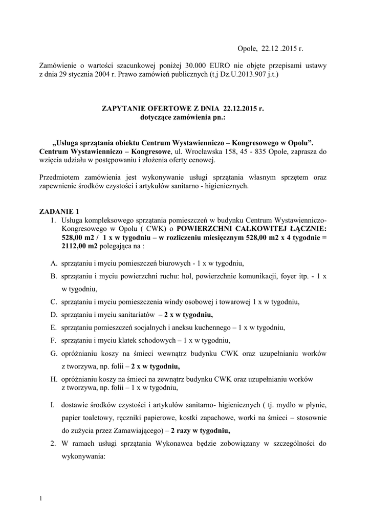 Opole, 22.12 .2015 r. Zamówienie o wartości szacunkowej poniżej 30.000 EURO nie objęte przepisami ustawy z dnia 29 stycznia 2004 r. Prawo zamówień publicznych (t.j Dz.U.2013.907 j.t.) ZAPYTANIE OFERTOWE Z DNIA 22.12.2015 r. dotyczące zamówienia pn.: „Usługa sprzątania obiektu Centrum Wystawienniczo – Kongresowego w Opolu”. Centrum Wystawienniczo – Kongresowe, ul. Wrocławska 158, 45 - 835 Opole, zaprasza do wzięcia udziału w postępowaniu i złożenia oferty cenowej. Przedmiotem zamówienia jest wykonywanie usługi sprzątania własnym sprzętem oraz zapewnienie środków czystości i artykułów sanitarno - higienicznych. ZADANIE 1 1. Usługa kompleksowego sprzątania pomieszczeń w budynku Centrum WystawienniczoKongresowego w Opolu ( CWK) o POWIERZCHNI CAŁKOWITEJ ŁĄCZNIE: 528,00 m2 / 1 x w tygodniu – w rozliczeniu miesięcznym 528,00 m2 x 4 tygodnie = 2112,00 m2 polegająca na : A. sprzątaniu i myciu pomieszczeń biurowych - 1 x w tygodniu, B. sprzątaniu i myciu powierzchni ruchu: hol, powierzchnie komunikacji, foyer itp. - 1 x w tygodniu, C. sprzątaniu i myciu pomieszczenia windy osobowej i towarowej 1 x w tygodniu, D. sprzątaniu i myciu sanitariatów – 2 x w tygodniu, E. sprzątaniu pomieszczeń socjalnych i aneksu kuchennego – 1 x w tygodniu, F. sprzątaniu i myciu klatek schodowych – 1 x w tygodniu, G. opróżnianiu koszy na śmieci wewnątrz budynku CWK oraz uzupełnianiu worków z tworzywa, np. folii – 2 x w tygodniu, H. opróżnianiu koszy na śmieci na zewnątrz budynku CWK oraz uzupełnianiu worków z tworzywa, np. folii – 1 x w tygodniu, I. dostawie środków czystości i artykułów sanitarno- higienicznych ( tj. mydło w płynie, papier toaletowy, ręczniki papierowe, kostki zapachowe, worki na śmieci – stosownie do zużycia przez Zamawiającego) – 2 razy w tygodniu, 2. W ramach usługi sprzątania Wykonawca będzie zobowiązany w szczególności do wykonywania: 1 a) zamiatania i mycia powierzchni pokrytych żywicą epoksydową , błyszczącą oraz płytkami ceramicznymi, wycierania kurzu z biurek, stolików, mebli, parapetów, półek, telefonów, grzejników elementów dekoracyjnych, luster, lady recepcyjnej, tablic informacyjnych, szafek instalacyjnych, itp., zbierania i wynoszenia śmieci z koszy oraz wkładanie do nich worków z tworzywa, np. z foli; segregowanie odpadków w pojemnikach – kontenerach CWK odbieranych przez firmę wywozową czyszczenia klamek, szyldów, czyszczenia drzwi, czyszczenia kontaktów i włączników oświetlenia, usuwania plam i zabrudzeń ze wszystkich mebli oraz urządzeń, czyszczenia koszy na śmieci, czyszczenia luster w sanitariatach, czyszczenia dozowników mydła, podajników papieru toaletowego i ręczników papierowych w sanitariatach, mycia i dezynfekowania misek ustępowych, pisuarów, desek sedesowych, płytek przycisku, umywalek, baterii łazienkowych, brodzika prysznicowego, zlewów ze stali nierdzewnej i wnętrza szafek pod nimi, zaworów i rur we wnętrzach pomieszczeń, pojemników ze szczotkami wc, mycia płytek ceramicznych w sanitariatach i pomieszczeniach kuchennych, zakładania kostek zapachowych w sanitariatach i rozkładanie odświeżaczy powietrza w toaletach, zakładania ręczników papierowych i uzupełniania mydła w pojemnikach – w miarę ich zużycia, zakładania papieru toaletowego w toaletach – w miarę ich zużycia, opróżniania i mycia wiaderek na odpady, b) usuwania w sanitariatach i pomieszczeniach socjalnych i kuchennych kamienia z misek ustępowych, pisuarów, umywalek, brodzika, zlewozmywaków, baterii łazienkowych i kuchennych oraz płytek – według potrzeb (kamień nie może się pojawić). 2 czyszczenia ścian pokrytych farbą żywiczną (do wys. 2 m) w łazienkach i pomieszczeniach socjalnych/kuchennych, szatniach. 3. Czynności określone w ust. 2 b) Wykonawca zobowiązany jest wykonywać wg potrzeb lecz nie rzadziej niż raz w miesiącu. 4. Wykonawca w ramach zlecenia zapewnia osoby do wykonania zamówienia oraz sprzęt i środki czystości tj. detergenty do mycia i czyszczenia powierzchni, urządzeń, sanitariatów, mydło w płynie toaletowe, kostki zapachowe, papier toaletowy, worki na śmieci, ręczniki papierowe, itp. (wszystkie wymienione produkty muszą spełniać przewidziane prawem normy i posiadać stosowne atesty oraz spełniać warunki przewidziane przez dostawców urządzeń)_Środki czystości i sanitarne będą uzupełniane przez Wykonawcę wg. zużycia. 5. Czynności sprzątania zostaną uznane za wykonane po dokonaniu ich odbioru przez Zamawiającego. Odbiór czynności nastąpi w formie protokołu zdawczo – odbiorczego podpisanego przez obie strony. Prawidłowo przekazany odbiór czynności będzie podstawą do wystawienia przez Wykonawcę faktury. 6. Wykonawca ustali godziny wykonywania usługi z Zamawiającym. 7. Wykaz pomieszczeń do wykonania usługi w ramach Zadania nr 1 stanowi - załącznik nr 1 do zapytania ofertowego - mapa (parter, piętro I). ZADANIE 2 1.Usługa sprzątania poszczególnych pomieszczeń Centrum Wystawienniczo – Kongresowego w Opolu wraz z ich wyposażeniem (tj. krzesła, stoły, podesty, lady) wykorzystywanych podczas imprez organizowanych w Centrum Wystawienniczo-Kongresowym w Opolu wg wskazań Zamawiającego. Usługa będzie wykonywana przed i po imprezach organizowanych w Centrum Wystawienniczo – Kongresowym w Opolu na podstawie każdorazowego pisemnego zlecenia Wykonawcy przez Zamawiającego. W ramach ZADANIA 2 Wykonawca będzie zobowiązany do wykonywania sprzątania pomieszczeń budynku CWK wskazanych przez Zamawiającego wg zasad określonych w opisie ZADANIA 1 ust. 2, 4, 5 przed i po imprezie wraz z zapewnieniem sprzętu oraz dostawą artykułów i środków czystości oraz ZAPEWNIENIEM PODCZAS IMPREZY DYŻURU OSOBY SPRZĄTAJĄCEJ/ SPRZĄTAJĄCYCH. 2. Wykluczone jest liczenie powierzchni dwa razy, czyli przed i po imprezie. 3. Pomieszczenia oraz elementy wyposażenia do sprzątania będ