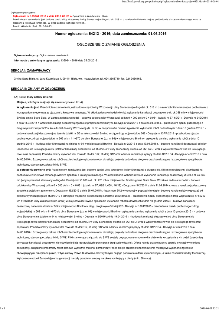 http://bzp0.portal.uzp.gov.pl/index.php?ogloszenie=show&pozycja=64213&rok=2016-06-01 Ogłoszenie powiązane: Ogłoszenie nr 135064-2016 z dnia 2016-05-25 r. Ogłoszenie o zamówieniu - Biała Przedmiotem zamówienia jest budowa części ulicy Wrzosowej i ulicy Słonecznej o długości ok. 518 m o nawierzchni bitumicznej na podbudowie z kruszywa łamanego wraz ze zjazdami z kruszywa łamanego. W skład zadania wchodzi również... Termin składania ofert: 2016-06-13 Numer ogłoszenia: 64213 - 2016; data zamieszczenia: 01.06.2016 OGŁOSZENIE O ZMIANIE OGŁOSZENIA Ogłoszenie dotyczy: Ogłoszenia o zamówieniu. Informacje o zmienianym ogłoszeniu: 135064 - 2016 data 25.05.2016 r. SEKCJA I: ZAMAWIAJĄCY Gmina Stara Biała, ul. Jana Kazimierza 1, 09-411 Biała, woj. mazowieckie, tel. 024 3668710, fax. 024 3656165. SEKCJA II: ZMIANY W OGŁOSZENIU II.1) Tekst, który należy zmienić: Miejsce, w którym znajduje się zmieniany tekst: II.1.4). W ogłoszeniu jest: Przedmiotem zamówienia jest budowa części ulicy Wrzosowej i ulicy Słonecznej o długości ok. 518 m o nawierzchni bitumicznej na podbudowie z kruszywa łamanego wraz ze zjazdami z kruszywa łamanego. W skład zadania wchodzi również wykonanie kanalizacji deszczowej o dł. ok 358 mb w miejscowości Brwilno gmina Stara Biała. W zakres zadania wchodzi: - budowa odcinka ulicy Wrzosowej od km 0 + 000 do km 0 + 0,081, (działki nr 67, 69/21) - Decyzja nr 342/2014 z dnia 11.04.2014 r. wraz z kanalizacją deszczową zgodnie z projektem zamiennym, Decyzja nr 362/2015 z dnia 28.04.2015 r. - przebudowa zjazdu publicznego z drogi wojewódzkiej nr 562 w km 41+670 do ulicy Wrzosowej (dz. nr 67) w miejscowości Brwilno zgłoszenie wykonania robót budowlanych z dnia 10 grudnia 2015 r. budowa kanalizacji deszczowej na terenie działki nr 5/5 w miejscowości Brwilno w ciągu drogi wojewódzkiej 562 - Decyzja nr 137/P/2015 - przebudowa zjazdu publicznego z drogi wojewódzkiej nr 562 w km 41 +670 do ulicy Słonecznej (dz. nr 94) w miejscowości Brwilno - zgłoszenie zamiaru wykonania robót z dnia 10 grudnia 2015 r. - budowa ulicy Słonecznej na działce nr 94 w miejscowości Brwilno - Decyzja nr 2/2016 z dnia 19.04.2016 r. - budowa kanalizacji deszczowej od ulicy Słonecznej do istniejącego rowu (kolektor kanalizacji deszczowej od studni D4 w ulicy Słonecznej, studnie od DVI do DI wraz z wprowadzeniem wód do istniejącego rowu oraz separator). Ponadto należy wykonać wlot rowu do studni D12, studnię D12 oraz odcinek kanalizacji łączący studnie D12 z D4 - Decyzja nr 467/2016 z dnia 24.05.2016 r. Szczegółowy zakres robót oraz technologię wykonania robót określają: projekty budowlane drogowe oraz kanalizacyjne i szczegółowe specyfikacje techniczne, stanowiące załączniki do SIWZ. W ogłoszeniu powinno być: Przedmiotem zamówienia jest budowa części ulicy Wrzosowej i ulicy Słonecznej o długości ok. 518 m o nawierzchni bitumicznej na podbudowie z kruszywa łamanego wraz ze zjazdami z kruszywa łamanego. W skład zadania wchodzi również wykonanie kanalizacji deszczowej Ø 500 o dł. ok 335 mb (w tym przewiert sterowany o długości 23 mb) oraz Ø 800 o dł. ok. 220 mb w miejscowości Brwilno gmina Stara Biała. W zakres zadania wchodzi: - budowa odcinka ulicy Wrzosowej od km 0 + 000 do km 0 + 0,081, (działki nr 67, 69/21, 46/4, 46/12) - Decyzja nr 342/2014 z dnia 11.04.2014 r. wraz z kanalizacją deszczową zgodnie z projektem zamiennym, Decyzja nr 362/2015 z dnia 28.04.2015 r. (bez studni D12 wykonanej w poprzednim etapie, budowę kanału należy rozpocząć od odcinka wychodzącego ze studni D12 a istniejące włączenie do kanalizacji sanitarnej zlikwidować). - przebudowa zjazdu publicznego z drogi wojewódzkiej nr 562 w km 41+670 do ulicy Wrzosowej (dz. nr 67) w miejscowości Brwilno zgłoszenie wykonania robót budowlanych z dnia 10 grudnia 2015 r. - budowa kanalizacji deszczowej na terenie działki nr 5/5 w miejscowości Brwilno w ciągu drogi wojewódzkiej 562 - Decyzja nr 137/P/2015 - przebudowa zjazdu publicznego z drogi wojewódzkiej nr 562 w km 41+670 do ulicy Słonecznej (dz. nr 94) w miejscowości Brwilno - zgłoszenie zamiaru wykonania robót z dnia 10 grudnia 2015 r. - budowa ulicy Słonecznej na działce nr 94 w miejscowości Brwilno - Decyzja nr 2/2016 z dnia 19.04.2016 r. - budowa kanalizacji deszczowej od ulicy Słonecznej do istniejącego rowu (kolektor kanalizacji deszczowej od studni D4 w ulicy Słonecznej, studnie od DVI do DI wraz z wprowadzeniem wód do istniejącego rowu oraz separator). Ponadto należy wykonać wlot rowu do studni D12, studnię D12 oraz odcinek kanalizacji łączący studnie D12 z D4 - Decyzja nr 467/2016 z dnia 24.05.2016 r. Szczegółowy zakres robót oraz technologię wykonania robót określają: projekty budowlane drogowe oraz kanalizacyjne i szczegółowe specyfikacje techniczne, stanowiące załączniki do SIWZ. Pliki stanowiące załączniki do SIWZ zostały pogrupowane umownie dla ułatwienia korzystania z ich treści (przedmiary dotyczące kanalizacji deszczowej nie odzwierciedlają rzeczywistych granic pasa drogi wojewódzkiej). Ofertę należy przygotować w oparciu o wyżej wymienione dokumenty. Załączone przedmiary robót stanową wyłącznie materiał pomocniczy Prace objęte przedmiotem zamówienia muszą być wykonane zgodnie z obowiązującymi przepisami prawa, w tym ustawy Prawo Budowlane oraz wydanymi na jego podstawie aktami wykonawczymi, a także zasadami wiedzy technicznej. Wykonawca udzieli Zamawiającemu gwarancji na cały przedmiot umowy na okres wynikający z oferty (min. 36 m-cy). 1z1 2016-06-01 13:21