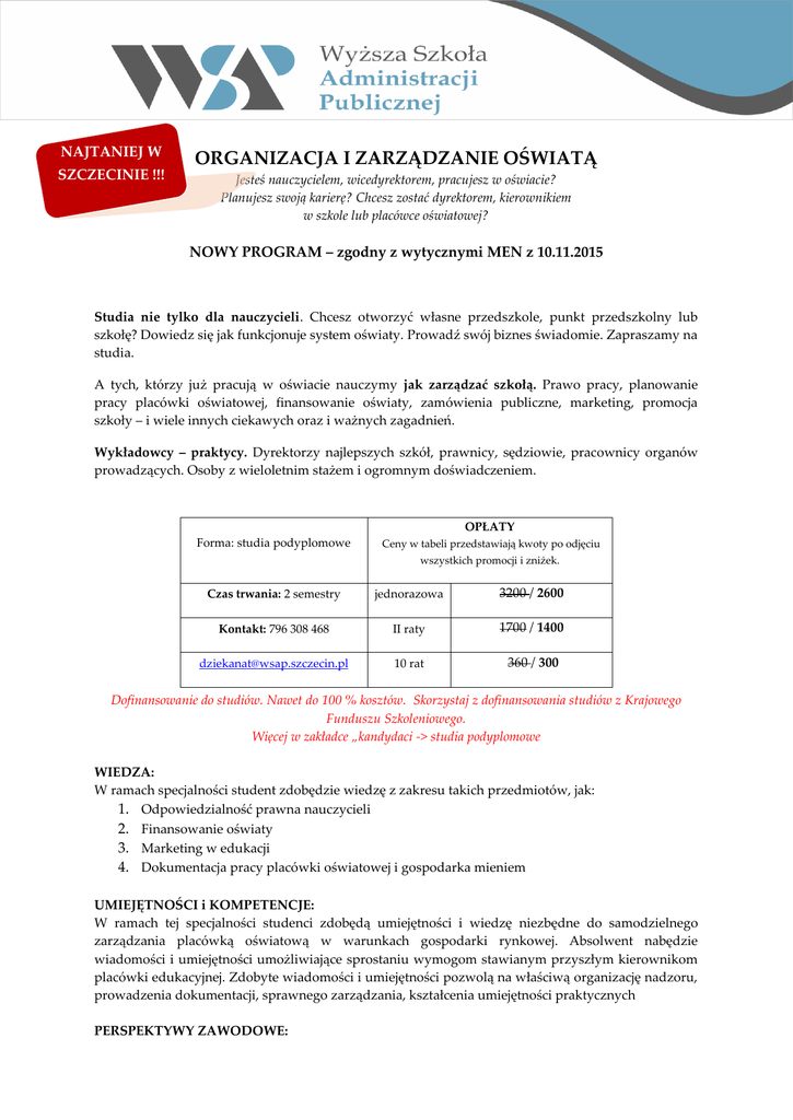 NAJTANIEJ W SZCZECINIE !!! ORGANIZACJA I ZARZĄDZANIE OŚWIATĄ Jesteś nauczycielem, wicedyrektorem, pracujesz w oświacie? Planujesz swoją karierę? Chcesz zostać dyrektorem, kierownikiem w szkole lub placówce oświatowej? NOWY PROGRAM – zgodny z wytycznymi MEN z 10.11.2015 Studia nie tylko dla nauczycieli. Chcesz otworzyć własne przedszkole, punkt przedszkolny lub szkołę? Dowiedz się jak funkcjonuje system oświaty. Prowadź swój biznes świadomie. Zapraszamy na studia. A tych, którzy już pracują w oświacie nauczymy jak zarządzać szkołą. Prawo pracy, planowanie pracy placówki oświatowej, finansowanie oświaty, zamówienia publiczne, marketing, promocja szkoły – i wiele innych ciekawych oraz i ważnych zagadnień. Wykładowcy – praktycy. Dyrektorzy najlepszych szkół, prawnicy, sędziowie, pracownicy organów prowadzących. Osoby z wieloletnim stażem i ogromnym doświadczeniem. OPŁATY Forma: studia podyplomowe Ceny w tabeli przedstawiają kwoty po odjęciu wszystkich promocji i zniżek. Czas trwania: 2 semestry jednorazowa 3200 / 2600 Kontakt: 796 308 468 II raty 1700 / 1400 [email protected] 10 rat 360 / 300 Dofinansowanie do studiów. Nawet do 100 % kosztów. Skorzystaj z dofinansowania studiów z Krajowego Funduszu Szkoleniowego. Więcej w zakładce „kandydaci -> studia podyplomowe WIEDZA: W ramach specjalności student zdobędzie wiedzę z zakresu takich przedmiotów, jak: 1. Odpowiedzialność prawna nauczycieli 2. Finansowanie oświaty 3. Marketing w edukacji 4. Dokumentacja pracy placówki oświatowej i gospodarka mieniem UMIEJĘTNOŚCI i KOMPETENCJE: W ramach tej specjalności studenci zdobędą umiejętności i wiedzę niezbędne do samodzielnego zarządzania placówką oświatową w warunkach gospodarki rynkowej. Absolwent nabędzie wiadomości i umiejętności umożliwiające sprostaniu wymogom stawianym przyszłym kierownikom placówki edukacyjnej. Zdobyte wiadomości i umiejętności pozwolą na właściwą organizację nadzoru, prowadzenia dokumentacji, sprawnego zarządzania, kształcenia umiejętności praktycznych PERSPEKTYWY ZAWODOWE: Absolwenci studiów podyplomowych Organizacja i Zarządzanie Oświatą mogą z powodzeniem starać się o objęcie stanowisk kierowniczych w placówkach oświatowych, albo samodzielnie – prowadząc sowie prywatne szkoły, przedszkola zarządzać nimi w sposób świadomy. PROGRAM STUDIÓW, według wytycznych MEN z 10.11.2015. Lp. Nazwa przedmiotu 1. 2. 1. 1Przywództwo edukacyjne w szkole Przywództwo organizacyjne. Style przywództwa a etapy rozwoju zespołu i organizacji. 3. Wartości w życiu jednostki, zespołu, organizacji. 4. Ustalanie hierarchii wartości w szkole. 5. Partycypacja i współpraca w szkole 6. Budowanie zespołu. 7. Cechy efektywnego zespołu. 8. Przywódca / lider w zespole. 9. Przywództwo przez inspirację. 10. Zmiana jako proces. Mechanizm zmian w szkole. 11. Wyznaczanie i komunikowanie celów i wartości w zmianie. 12. Zarządzanie zmianą. Liczba godzin 1. 2. 3. 4. 5. 2. Przywództwo dla uczenia się i rozwoju indywidualnego 6. 7. 8. 9. 10. 11. 12. 13. 1. 2. 3. 3. Polityka oświatowa – dyrektor jako lider w środowisku. 4. 5. 6. 7. 8. 9. 1. 4. Zarządzanie zasobami ludzkimi. 2. 3. 4. 5. Społeczny wymiar uczenia się. Szkoła wobec wyzwań społeczeństwa wiedzy. Zmiana paradygmatu: od ilości wiedzy do ilości struktury. Wykorzystanie emocji w procesie uczenia się. Wzmacnianie poczucia bezpieczeństwa wśród uczących się. Strategie efektywnego uczenia się. Wykorzystanie wybranych teorii i koncepcji pedagogicznych w planowaniu uczenia się. Podstawa programowa jako mapa treści. Skuteczne metody opracowywania programu nauczania. Ocenianie dla uczenia się. Szkoła Jako organizacja ucząca się. Kultura otwartych drzwi. Uczenie się dorosłych. Podstawy partycypacji społecznej. Sposoby poznawania społeczności lokalnej. Współpraca z rodzicami uczniów, aktywizowanie ich potencjału dla realizacji celów szkoły. Współpraca z instytucjami edukacyjnymi. Współpraca z samorządem terytorialnym, instytucjami publicznymi, organizacjami pozarządowymi i podmiotami prywatnymi. Informowanie o zmianach w szkole. Komunikacja w szkole. Mediacje i negocjacje w przypadku konfliktu. Media w procesach komunikowania się szkoły. Zarządzanie zasobami ludzkimi: diagnoza sytuacji w szkole. Polityka kadrowa oraz procedury prawne. Procedura rekrutacji i selekcji pracowników. Wprowadzenie do pracy nowo przyjętego nauczyciela. Zwalnianie pracownika. 20 35 20 25 6. 7. 8. Motywowanie pracowników. Rozwój kariery zawodowej nauczyciela. Doskonalenie nauczycieli. Dyrektor jako lider uczenia się nauczycieli. 9. Kultura szkoły: diagnoza, charakterystyka, budowanie. 10. Animowanie działań społeczności szkolnej. 11. Rozwiązywanie problemów szkoły w oparciu o pracę grup zadaniowych. 12. Zarządzanie zasobami ludzkimi w sytuacjach kryzysowych. Cele i zadania szkoły w świetle obowiązujących przepisów prawa. 2. Wymagania państwa wobec szkół. 3. Stosowanie prawa powszechnego i miejscowego w pracy dyrektora szkoły. 4. Struktura i tworzenie wewnętrznych aktów prawnych. 5. Zarządzanie finansami w szkole. 6. Kontrola zarządcza. 7. Nadzór pedagogiczny sprawowany przez dyrektora szkoły i zewnętrzny nadzór pedagogiczny. 8. Wykorzystywanie danych w procesie planowania. 9. Koncepcja pracy szkoły: podstawy prawne, fundamenty, tworzenie. 10. Architektura, infrastruktura techniczna i wyposażenie szkoły. 11. Strategia rozwoju szkoły. 1. 5. Zarządzanie strategiczne w kontekście prawnym, społecznym i finansowym. 40 12. Planowanie rocznej pracy szkoły. 1. 2. 3. 4. 5. 6. Zarządzanie własnym rozwojem zawodowym. 6. 7. 8. 9. Ja jako lider. Zasady udzielania i przyjmowania informacji zwrotnej. Gotowość do uczenia się przez całe życie. Mój styl uczenia się. Znajomość procesu rozwojowego i planowanie własnego rozwoju. Motywacja wewnętrzna. Utrzymywanie równowagi między pr