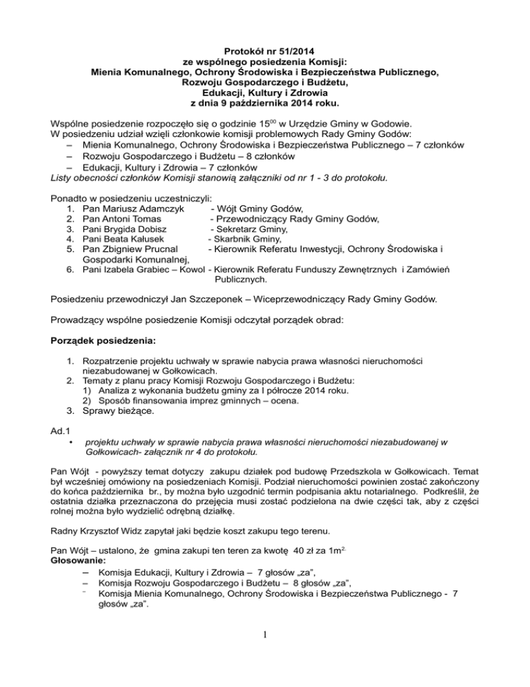 Protokół nr 51/2014 ze wspólnego posiedzenia Komisji: Mienia Komunalnego, Ochrony Środowiska i Bezpieczeństwa Publicznego, Rozwoju Gospodarczego i Budżetu, Edukacji, Kultury i Zdrowia z dnia 9 października 2014 roku. Wspólne posiedzenie rozpoczęło się o godzinie 1500 w Urzędzie Gminy w Godowie. W posiedzeniu udział wzięli członkowie komisji problemowych Rady Gminy Godów: – Mienia Komunalnego, Ochrony Środowiska i Bezpieczeństwa Publicznego – 7 członków – Rozwoju Gospodarczego i Budżetu – 8 członków – Edukacji, Kultury i Zdrowia – 7 członków Listy obecności członków Komisji stanowią załączniki od nr 1 - 3 do protokołu. Ponadto w posiedzeniu uczestniczyli: 1. Pan Mariusz Adamczyk - Wójt Gminy Godów, 2. Pan Antoni Tomas - Przewodniczący Rady Gminy Godów, 3. Pani Brygida Dobisz - Sekretarz Gminy, 4. Pani Beata Kałusek - Skarbnik Gminy, 5. Pan Zbigniew Prucnal - Kierownik Referatu Inwestycji, Ochrony Środowiska i Gospodarki Komunalnej, 6. Pani Izabela Grabiec – Kowol - Kierownik Referatu Funduszy Zewnętrznych i Zamówień Publicznych. Posiedzeniu przewodniczył Jan Szczeponek – Wiceprzewodniczący Rady Gminy Godów. Prowadzący wspólne posiedzenie Komisji odczytał porządek obrad: Porządek posiedzenia: 1. Rozpatrzenie projektu uchwały w sprawie nabycia prawa własności nieruchomości niezabudowanej w Gołkowicach. 2. Tematy z planu pracy Komisji Rozwoju Gospodarczego i Budżetu: 1) Analiza z wykonania budżetu gminy za I półrocze 2014 roku. 2) Sposób finansowania imprez gminnych – ocena. 3. Sprawy bieżące. Ad.1 • projektu uchwały w sprawie nabycia prawa własności nieruchomości niezabudowanej w Gołkowicach- załącznik nr 4 do protokołu. Pan Wójt - powyższy temat dotyczy zakupu działek pod budowę Przedszkola w Gołkowicach. Temat był wcześniej omówiony na posiedzeniach Komisji. Podział nieruchomości powinien zostać zakończony do końca października br., by można było uzgodnić termin podpisania aktu notarialnego. Podkreślił, że ostatnia działka przeznaczona do przejęcia musi zostać podzielona na dwie części tak, aby z części rolnej można było wydzielić odrębną działkę. Radny Krzysztof Widz zapytał jaki będzie koszt zakupu tego terenu. Pan Wójt – ustalono, że gmina zakupi ten teren za kwotę 40 zł za 1m 2. Głosowanie: – Komisja Edukacji, Kultury i Zdrowia – 7 głosów „za”, – Komisja Rozwoju Gospodarczego i Budżetu – 8 głosów „za”, – Komisja Mienia Komunalnego, Ochrony Środowiska i Bezpieczeństwa Publicznego - 7 głosów „za”. 1 Komisje pozytywnie zaopiniowały powyższy projekt uchwały. Ad.2 Tematy z planu pracy Komisji Rozwoju Gospodarczego i Budżetu: 1) sprawozdanie z wykonania budżetu gminy za I półrocze 2014 roku – załącznik nr 5 do protokołu. Prowadzenia komisji przejął Przewodniczący Komisji Rozwoju, Gospodarczego i Budżetu - Stanisław Tatarczyk. Pani Skarbnik powiedział, że Regionalna Izba Obrachunkowa uchwalą z 3 września 29014 r, wydała pozytywną opinię o przedłożonym przez Pana Wójta sprawozdania o przebiegu wykonania budżetu gminy za I półrocze 2014 r. - załącznik nr 6 do protokołu. Pani Skarbnik powiedziała, że w ciągu I półrocza dochody zwiększyły się o ponad 1mln zł w stosunku do założonego planu czyli do wysokości ponad 36 mln złotych w tym dochody majątkowe o około 3 mln zł. Zwiększenia dotyczyły głównie przyjęcia dotacji z budżetu państwa tj. z Urzędu Marszałkowskiego, przyjęcia środków unijnych na realizację projektów szkolnych a także dochodów wypracowanych ponad plan w tym największa ich wartość stanowi zwrot podatku VAT z roku 2009 roku oraz zwrot środków finansowych za zakup działki w Godowie. Natomiast zmniejszenie dochodów dotyczyło obniżenia stawki dotacji na 1 dziecko w przedszkolu oraz środków z subwencji oświatowej. Ponadto zwiększono wydatki do założonego planu o ponad 2.300.000,00 zł i na I półrocze kształtowały się w wysokości 43.000.000,00 zł w tym majątkowe 13.700,000,00 zł, co daje 31,6%. Przewodniczący Komisji otworzył dyskusję w powyższym temacie. Radny Donat Trafiał – ile gminę kosztowała obsługa zaciągniętego na wiosnę tego roku kredytu? Pani Skarbnik - jest to kwota 152.527, 60 zł. Radny Zygmunt Skupień – cyt.” bieżące planowane zadłużenie gminy przewiduje jego spłatę do dnia 31.12.2030 roku”. Pani Skarbnik wyjaśniła, że taki jest załącznik do WPF. Uchwała w tej sprawie została przyjęta przez Radę Gminy. Treść tej uchwały prawie co miesiąc poddawana jest pod głosowanie na sesji Rady Gminy i jest aktualizowana. Radny Bernard Oślizło – rozdział 92605 – dotacja w kwocie 10.000,00 zł dla Stowarzyszenia Forma. W ubiegłym roku Klub Sportowy Inter Krostoszowice otrzymał dotację z budżetu gminy w wysokości 4 tys zł. Środki zostały wykorzystane i pozostały w naszej gminie. W organizowanych imprezach kulturalno – sportowych uczestnicy około 5 -7% mieszkańców z naszej gminy. W Gołkowicach są trzy drużyny młodzieżowe i dwa razy w tygodniu młodzież spotyka się na treningach oraz bierze udział w różnego typu zawodach sportowych, a dotacja z budżetu gminy na prowadzenie działalności wynosi 12 tys zł, więc z tego wynika, że od trzech lat nasza młodzież otrzymuje bardzo mało pieniędzy na działalność sportową. Z informacji jakie posiada w innych w gminnych nikt nie skorzystał z usług Klubu Forma. Zapytał czy prawdą jest, że Klub Forma ma zostać przejęty przez Gminną Radę Sportu? Pan Wójt – został ogłoszony konkurs i tylko Klub Sportowy Forma przystąpił do konkursu. Dotacja przekazana na realizację zadań ujętych w ofercie konkursowej, również pozostaje w naszej gminie, ponieważ wszystkie imprezy były organizowane na terenie gminy. Kluby Sportowe, które prowadzą działalność statutową w naszej gminie oraz otrzymują dotację z budżetu 