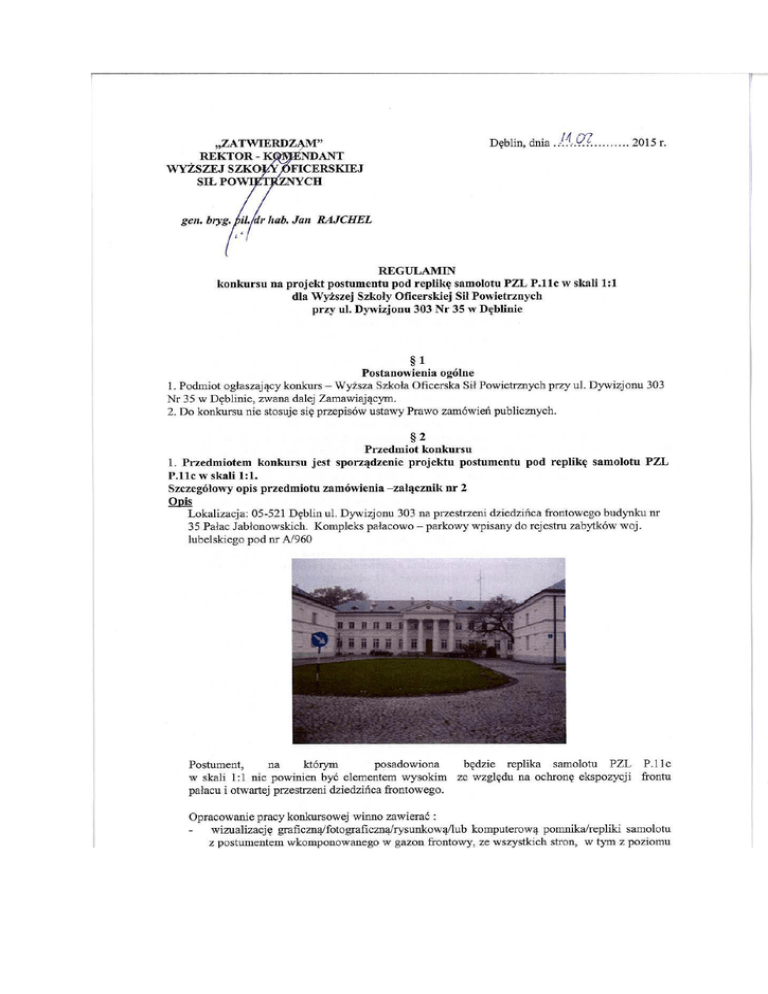 stojącego człowieka przy bramie wjazdowej do Pałacu Jabłonowskich oraz rzutem z góry z podaniem wymiarów w skali; - opis rozwiązań technicznych i zastosowanych materiałów do budowy pomnika/repliki samolotu PZL P.11c i postumentu; - termin wykonania projektu – w miesiącach; - termin wykonania budowy – w miesiącach; - wartość szacunkową wykonania projektu i całości budowy pomnika/repliki ze wstępną kalkulacją. - §3 Warunki udziału 2. Zamawiający żąda złożenia następujących dokumentów: a) wypełnionego i podpisanego formularza ofertowego (załącznik nr 1 do niniejszego regulaminu), b) dokumentacji graficznej/fotograficznej/rysunkowej/lub komputerowej lub rysunku pomnika/repliki samolotu z postumentem wkomponowanego w gazon frontowy, ze wszystkich stron, w tym z poziomu stojącego człowieka przy bramie wjazdowej do Pałacu Jabłonowskich oraz rzutem z góry z podaniem wymiarów w skali; c) opisu rozwiązań technicznych i zastosowanych materiałów do budowy pomnika i postumentu; d) pełnomocnictwo do podpisania oferty (oryginał lub kopia potwierdzona za zgodność z oryginałem przez notariusza) względnie do podpisania innych dokumentów składanych wraz z ofertą, o ile prawo do ich podpisania nie wynika z innych dokumentów złożonych wraz z ofertą; 3. Oferty wraz z wymaganymi dokumentami należy składać w zamkniętej kopercie do dnia 26 lutego 2015 r. do godziny 9.00 w kancelarii jawnej Wyższej Szkoły Oficerskiej Sił Powietrznych w Dęblinie, ul. Dywizjonu 303 Nr 35. Koperta powinna zawierać nazwę i dokładny adres oferenta, telefon kontaktowy oraz dopisek: „Oferta konkursowa na projekt postumentu pod replikę samolotu PZL P.11c w skali 1:1”. 4. Oferta ważna jest 30 dni od dnia otwarcia ofert. §4 Zasady konkursu 1. Konkurs uznaje się za ważny, jeżeli wpłynie co najmniej jedna oferta. 2. Złożone oferty weryfikuje i ocenia komisja konkursowa powołana w tym celu przez Rektora – Komendanta Wyższej Szkoły Oficerskiej Sił Powietrznych w Dęblinie. 3. Komisja konkursowa: a) otwiera oferty, b) przyjmuje dodatkowe oświadczenia i wyjaśnienia oferentów, c) dokonuje analizy ofert i wybiera najkorzystniejszą z nich lub stwierdza, że żadna z ofert nie może zostać przyjęta, d) odrzuca ofertę, jeżeli oferta nie spełnia wymogów formalnych, z zastrzeżeniem pkt e, e) może wystąpić do oferenta z wnioskiem o uzupełnienie brakujących dokumentów, f) sporządza protokół z wyboru oferty wraz z uzasadnieniem, który przedkłada Rektorowi – Komendantowi Wyższej Szkoły Oficerskiej Sił Powietrznych w Dęblinie do zatwierdzenia. 4. Komisja konkursowa dokonując oceny ofert bierze pod uwagę: a) koncepcję projektu - 60% – oferta uzyska maksymalnie 60 pkt, (tj. najwyżej ocenione walory estetyczno-artystyczne projektu), każdy z członków komisji przyzna wg własnej oceny od 0 pkt do 60 pkt, a) termin wykonania projektu- 20% – najkorzystniejsza oferta ( tj. z najkrótszym terminem) uzyska maksymalnie 20 pkt, każdy z członków komisji przyzna wg własnej oceny od 0 pkt do 20 pkt, a) wartość wykonania projektu i budowy - 20% – najkorzystniejsza oferta (tj. z najniższą ceną) uzyska maksymalnie 20 pkt, każdy z członków komisji przyzna wg własnej oceny od 0 pkt do 20 pkt, Za najkorzystniejszą ofertę zostanie uznana oferta o największej liczbie punktów. 5. W razie uzyskania przez dwie lub więcej ofert takiej samej liczby punktów komisja konkursowa podejmuje rozstrzygnięcie w drodze głosowania większością głosów. W razie równej ilości głosów decyduje głos Przewodniczącego komisji. 7. Oferty złożone po terminie określonym w § 3 pkt 3 zostaną zwrócone bez ich otwierania. 1. 2. 3. 4. 5. §5 Prawa autorskie Przekazanie pracy konkursowej jest równoznaczne z oświadczeniem, że projekt nie narusza praw osób trzecich, w szczególności nie narusza majątkowych i osobistych praw autorskich. W przypadku wystąpienia przez osobę trzecią z roszczeniami, wynikającymi z tytułu naruszenia praw określonych powyżej, osoba/podmiot zgłaszający projekt zrekompensuje Zamawiającemu, jako wyłącznie odpowiedzialny, koszty poniesione w związku ze skierowaniem przeciwko niemu roszczeń odszkodowawczych, zwalniając Zamawiającego od wszelkich zobowiązań, jakie powstaną z tego tytułu. Uczestnik konkursu - Autor zwycięskiego projektu przeniesie na Zamawiającego autorskie prawa majątkowe do tej pracy bez żadnych ograniczeń czasowych i terytorialnych. Zamawiający nabędzie prawo rozporządzania autorskimi prawami majątkowymi oraz prawo do wyłącznego korzystania ze zwycięskiej pracy na wszystkich polach eksploatacji, w szczególności prawo do: - publikacji; - publicznego wystawienia pracy konkursowej i wykonanego na jej podstawie projektu pomnika/repliki, - wykonywania reprodukcji; - wykorzystania złożonych materiałów do złożenia wniosku do Konserwatora Zabytków; Całkowite wynagrodzenie za przeniesienie praw autorskich zawarte jest w kwocie nagrody wskazanej w §6 niniejszego regulaminu. Autorowi zwycięskiego projektu nie będzie przysługiwało inne wynagrodzenie oprócz tej nagrody. §6 Postanowienia końcowe W konkursie przewidziano nagrodę pieniężną dla najwyżej ocenionej oferty w wysokości 2000 zł. Zamawiający informuje, iż w uzasadnionych okolicznościach może odstąpić od zrealizowania zwycięskiego projektu. Zamawiający dopuszcza możliwość ewentualnych modyfikacji zwycięskiego projektu przy współpracy z Autorem, z poszanowaniem oryginalnej formy projektu. Zamawiający zastrzega unieważnienie konkursu bez podawania przyczyn. . Załącznik nr 1 FORMULARZ OFERTOWY w konkursie na projekt postumentu pod replikę samolotu PZL P.11c w skali 1:1 dla Wyższej Szkoły Oficerskiej Sił Powietrznych przy ul. Dywizjonu 303 Nr 35 w Dęblinie Ja, niżej podpisany (imię i nazwisko): …….………………..…………………………………………… jako upoważ