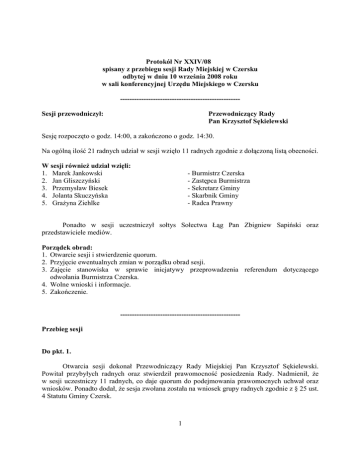Protokół Nr XXIV/08 spisany z przebiegu sesji Rady Miejskiej w Czersku odbytej w dniu 10 września 2008 roku w sali konferencyjnej Urzędu Miejskiego w Czersku --------------------------------------------------Sesji przewodniczył: Przewodniczący Rady Pan Krzysztof Sękielewski Sesję rozpoczęto o godz. 14:00, a zakończono o godz. 14:30. Na ogólną ilość 21 radnych udział w sesji wzięło 11 radnych zgodnie z dołączoną listą obecności. W sesji równieŜ udział wzięli: 1. Marek Jankowski 2. Jan Gliszczyński 3. Przemysław Biesek 4. Jolanta Skuczyńska 5. GraŜyna Ziehlke - Burmistrz Czerska - Zastępca Burmistrza - Sekretarz Gminy - Skarbnik Gminy - Radca Prawny Ponadto w sesji uczestniczył sołtys Sołectwa Łąg Pan Zbigniew Sapiński oraz przedstawiciele mediów. Porządek obrad: 1. Otwarcie sesji i stwierdzenie quorum. 2. Przyjęcie ewentualnych zmian w porządku obrad sesji. 3. Zajęcie stanowiska w sprawie inicjatywy przeprowadzenia referendum dotyczącego odwołania Burmistrza Czerska. 4. Wolne wnioski i informacje. 5. Zakończenie. --------------------------------------------------Przebieg sesji Do pkt. 1. Otwarcia sesji dokonał Przewodniczący Rady Miejskiej Pan Krzysztof Sękielewski. Powitał przybyłych radnych oraz stwierdził prawomocność posiedzenia Rady. Nadmienił, Ŝe w sesji uczestniczy 11 radnych, co daje quorum do podejmowania prawomocnych uchwał oraz wniosków. Ponadto dodał, Ŝe sesja zwołana została na wniosek grupy radnych zgodnie z § 25 ust. 4 Statutu Gminy Czersk. 1 Do pkt. 2. Przewodniczący Rady Pan Krzysztof Sękielewski nadmienił, Ŝe porządek obrad został dostarczony radnym wraz z zawiadomieniem na dzisiejszą sesję Rady, w związku z czym poprosił o zgłaszanie ewentualnych uwag. Do pkt. 3. Przewodniczący Rady Pan Krzysztof Sękielewski – Szanowni Państwo! Krótko na temat tego w jakim celu zwołana została ta sesja. Cele w zasadzie są dwa. Pierwszy cel to konfrontacja na sesji Rady Miejskiej przed radnymi, którzy są reprezentantami społeczności miasta i gminy Czersk wybranymi w wyborach powszechnych i konfrontacja przedstawicieli inicjatorów referendum z Burmistrzem, którego referendum dotyczy. Został zaproszony na dzisiejszą sesję pełnomocnik inicjatorów Pan Sebastian śalikowski. Z przykrością informuję, Ŝe nie widzę Pana śalikowskiego na sesji. RównieŜ nie otrzymałem Ŝadnej informacji jako Przewodniczący Rady, do Biura Rady teŜ nie dotarła taka informacja na temat nieobecności Pana śalikowskiego na sesji. Celem obecności pana pełnomocnika było dookreślenie zarzutów wobec Burmistrza zawartych w uzasadnieniu, ewentualna dyskusja i umoŜliwienie odpowiedzi Burmistrzowi. Szanowni Państwo myślę, Ŝe Państwo teŜ moŜecie zabrać głos w tym punkcie. Jako Przewodniczący Rady Miejskiej powiem tak – uwaŜam, Ŝe jest to lekcewaŜenie radnych Rady Miejskiej w Czersku. LekcewaŜenie, oczywiście róŜne mogą się wydarzyć sytuacje Ŝyciowe ale powinniśmy wiedzieć o tym, Ŝe Pan Sebastian śalikowski z jakiegokolwiek powodu będzie nieobecny. Jest sytuacja, która zawsze ma miejsce, Ŝeby gość zaproszony tym bardziej waŜna osoba, która na tej sesji miała się wypowiadać nie przybyła i nic o tym nie powiedziała. Ja tylko przypomnę Państwu, Ŝe niejednokrotnie na sesjach naszych bywają zaproszeni goście i nawet jeŜeli z jakiś względów nie przybywają to albo dzwonią albo proszą o przełoŜenie. Przypomnę tutaj – sytuacja nie tak dawna z Dyrektorem Szpitala Panem Bonną, który nie mógł być obecny, owszem nie zawsze nas to zadowalało ale mimo to Pan Dyrektor rozumiał jaka jest rola, jakie są funkcję Rady Miejskiej i chociaŜby poprzez zwykły szacunek wobec przedstawicieli społeczności lokalnej wypadałoby zawiadomić. Tutaj nie mamy Ŝadnego zawiadomienia. Jeszcze raz powtórzę jako Przewodniczący Rady Miejskiej uwaŜam, Ŝe Rada Miejska została w ten sposób zlekcewaŜona. Drugim celem zwołania sesji było wypracowanie stanowiska Rady Miejskiej wobec inicjatywy referendum. Jesteśmy wybranymi przedstawicielami. Burmistrz jest jednym z organów władzy samorządowej, mamy prawo a nawet obowiązek wypowiadać się w waŜnych kwestiach szczególnie w tak waŜnej kwestii jak referendum w sprawie odwołania Burmistrza. Jeszcze raz Szanowni Państwo przypomnę w skrócie to co jest treścią uzasadnienia i to co było celem naszym kiedy wnioskowaliśmy o zwoływanie tej sesji. Po pierwsze – w pełni akceptujemy wszystkie demokratyczne prawa obywatelskie, w tym prawo do referendum w sprawie odwołania organu wykonawczego. Respektujemy zasady i procedury demokratyczne. WyraŜamy natomiast swój dystans wobec naduŜywania, tak naleŜy sądzić a nie inaczej. Pełnomocnik inicjatorów miał tutaj moŜliwość aby wykazać właśnie, Ŝe jest inaczej, Ŝe to nie jest naduŜywanie referendum. RównieŜ naszym celem jest obrona ładu demokratycznego, w tym bardzo podstawowym sensie obrona zasady kadencyjności a więc uszanowanie dla wyniku demokratycznych wyborów, uszanowanie dla decyzji wyborców. Jest to bardzo waŜna kwestia, poniewaŜ łamanie tej zasady bez takiego uzasadnienia, o którym sądzimy, Ŝe go nie ma powoduje anarchizację Ŝycia publicznego. Wreszcie u podstaw zwołania tej sesji jest dbałość 2 o poszanowanie dla funkcji Burmistrza ale teŜ dla funkcji Rady Miejskiej, poniewaŜ jak czytaliśmy to co zostało zawarte w uzasadnieniu to nie wszystko z tego odnosi się bezpośrednio do Burmistrza. Część z tych tak zwanych zarzutów odnosi się do Rady. Dbałość o poszanowanie funkcji i wizerunku Burmistrza Czerska, Rady Miejskiej niezaleŜnie od tego kto pełni funkcję Burmistrza i kim są radni Rady Miejskiej, poniewaŜ takie deprecjonowanie funkcji Burmistrza i Rady Miejskiej naprawdę źle wróŜy demokracji lokalnej ale równieŜ i to bardzo wyraźnie trzeba podkreślić – to znalazło się w naszym oświadczeniu jest to obrona dobre