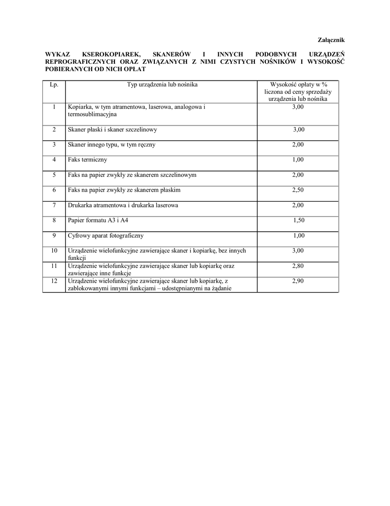Załącznik WYKAZ KSEROKOPIAREK, SKANERÓW I INNYCH PODOBNYCH URZĄDZEŃ REPROGRAFICZNYCH ORAZ ZWIĄZANYCH Z NIMI CZYSTYCH NOŚNIKÓW I WYSOKOŚĆ POBIERANYCH OD NICH OPŁAT Lp. Typ urządzenia lub nośnika Wysokość opłaty w % liczona od ceny sprzedaży urządzenia lub nośnika 3,00 1 Kopiarka, w tym atramentowa, laserowa, analogowa i termosublimacyjna 2 Skaner płaski i skaner szczelinowy 3,00 3 Skaner innego typu, w tym ręczny 2,00 4 Faks termiczny 1,00 5 Faks na papier zwykły ze skanerem szczelinowym 2,00 6 Faks na papier zwykły ze skanerem płaskim 2,50 7 Drukarka atramentowa i drukarka laserowa 2,00 8 Papier formatu A3 i A4 1,50 9 Cyfrowy aparat fotograficzny 1,00 10 Urządzenie wielofunkcyjne zawierające skaner i kopiarkę, bez innych funkcji Urządzenie wielofunkcyjne zawierające skaner lub kopiarkę oraz zawierające inne funkcje Urządzenie wielofunkcyjne zawierające skaner lub kopiarkę, z zablokowanymi innymi funkcjami – udostępnianymi na żądanie 3,00 11 12 2,80 2,90