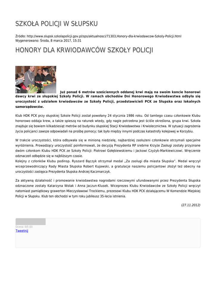 SZKOŁA POLICJI W SŁUPSKU Źródło: http://www.slupsk.szkolapolicji.gov.pl/sps/aktualnosci/71303,Honory-dla-krwiodawcow-Szkoly-Policji.html Wygenerowano: Środa, 8 marca 2017, 15:31 HONORY DLA KRWIODAWCÓW SZKOŁY POLICJI Już ponad 6 metrów sześciennych oddanej krwi mają na swoim koncie honorowi dawcy krwi ze słupskiej Szkoły Policji. W ramach obchodów Dni Honorowego Krwiodawstwa odbyła się uroczystość z udziałem krwiodawców ze Szkoły Policji, przedstawicieli PCK ze Słupska oraz lokalnych samorządowców. Klub HDK PCK przy słupskiej Szkole Policji został powołany 24 stycznia 1986 roku. Od tamtego czasu członkowie Klubu honorowo oddaja krew, a także spieszą na ratunek wtedy, gdy nagle potrzebna jest ściśle określona, grupa krwi. Szkoła znajduje się bowiem kilkadziesiąt metrów od budynku słupskiej Stacji Krwiodawstwa i Krwiolecznictwa. W sytuacji zagrożenia życia policjanci zawsze odpowiadali na prośbę pomocy; tak było między innymi podczas katastrofy kolejowej w Korzybiu. W trakcie uroczystości, która odbywała się w minioną niedzielę, najbardziej zasłużeni członkowie otrzymali specjalne wyróżnienia. Prowadzący uroczystość poinformowali, że decyzją Prezydenta RP srebrne Krzyże Zasługi zostały przyznane dwóm członkom Klubu HDK PCK ze Szkoły Policji: Piotrowi Gołębiewskiemu i Jackowi Czyżyk-Markiewiczowi. Wręczenie odznaczeń odbędzie się w najbliższym czasie. Kolejny z członków Klubu podinsp. Ryszard Bączyk otrzymał medal „Za zasługi dla miasta Słupska”. Medal wręczył wiceprzewodniczący Rady Miasta Słupska Robert Kujawski, a gratulacje naszemu policjantowi złożył też obecny na uroczystości zastępca Prezydenta Słupska Andrzej Kaczmarczyk. Za aktywną działalność i promowanie krwiodawstwa nagrodami rzeczowymi ufundowanymi przez Prezydenta Słupska odznaczone zostały Katarzyna Wolak i Anna Jaczun-Klusek. Wiceprezes Klubu Krwiodawców ze Szkoły Policji wręczył natomiast pamiątkowy grawerton Mieczysławowi Trockiemu, prezesowi Klubu HDK PCK działającemu W Komendzie Miejskiej Policji w Słupsku. Klub ten obchodzi w tym roku jubileusz 35-lecia istnienia. (27.11.2012) Ocena: 0/5 (0) Tweetnij