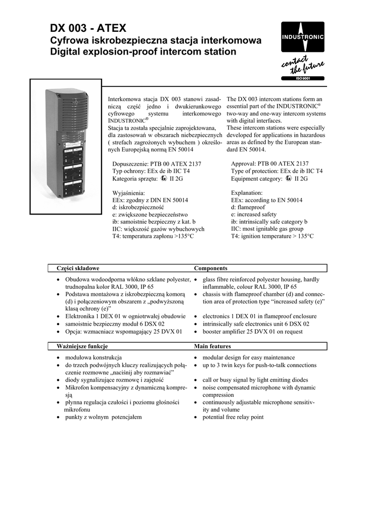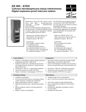 DX 003 - ATEX Cyfrowa iskrobezpieczna stacja interkomowa Digital explosion-proof intercom station Interkomowa stacja DX 003 stanowi zasadniczą część jedno i dwukierunkowego cyfrowego systemu interkomowego INDUSTRONIC® Stacja ta została specjalnie zaprojektowana, dla zastosowań w obszarach niebezpiecznych ( strefach zagrożonych wybuchem ) określonych Europejską normą EN 50014 The DX 003 intercom stations form an essential part of the INDUSTRONIC® two-way and one-way intercom systems with digital interfaces. These intercom stations were especially developed for applications in hazardous areas as defined by the European standard EN 50014. Dopuszczenie: PTB 00 ATEX 2137 Typ ochrony: EEx de ib IIC T4 II 2G Kategoria sprzętu: Approval: PTB 00 ATEX 2137 Type of protection: EEx de ib IIC T4 II 2G Equipment category: Wyjaśnienia: EEx: zgodny z DIN EN 50014 d: iskrobezpieczność e: zwiększone bezpieczeństwo ib: samoistnie bezpieczny z kat. b IIC: większość gazów wybuchowych T4: temperatura zapłonu >135°C Explanation: EEx: according to EN 50014 d: flameproof e: increased safety ib: intrinsically safe category b IIC: most ignitable gas group T4: ignition temperature > 135°C Części składowe Components • Obudowa wodoodporna włókno szklane polyester, trudnopalna kolor RAL 3000, IP 65 • Podstawa montażowa z iskrobezpieczną komorą (d) i połączeniowym obszarem z „podwyższoną klasą ochrony (e)” • Elektronika 1 DEX 01 w ogniotrwałej obudowie • samoistnie bezpieczny moduł 6 DSX 02 • Opcja: wzmacniacz wspomagający 25 DVX 01 • glass fibre reinforced polyester housing, hardly inflammable, colour RAL 3000, IP 65 • chassis with flameproof chamber (d) and connection area of protection type “increased safety (e)” Ważniejsze funkcje Main features • modułowa konstrukcja • do trzech podwójnych kluczy realizujących połączenie rozmowne „naciśnij aby rozmawiać” • diody sygnalizujące rozmowę i zajętość • Mikrofon kompensacyjny z dynamiczną kompresją • płynna regulacja czułości i poziomu głośności mikrofonu • punkty z wolnym potencjałem • modular design for easy maintenance • up to 3 twin keys for push-to-talk connections • electronics 1 DEX 01 in flameproof enclosure • intrinsically safe electronics unit 6 DSX 02 • booster amplifier 25 DVX 01 on request • call or busy signal by light emitting diodes • noise compensated microphone with dynamic compression • continuously adjustable microphone sensitivity and volume • potential free relay point DX 003 - ATEX Cyfrowa iskrobezpieczna stacja interkomowa Digital explosion-proof intercom station Dane mechaniczne / Mechanical data Wysokość*Szerokość*Głębokość / height*width*depth......................................450 mm*134mm*183mm Dławiki kablowe/ cable glands............................................................................................2*M20 + 1*M25 Waga / weight................................................................................................................................. ca. 6,5 kg Dane elektryczne ( stacji interkomowej)/ Electrical data (intercom station) Zakres napięcia roboczego / operating voltage range...........................................................42 V – 72 V DC Spoczynkowy i max. pobór prądu/ quiescent & max. current consumption ......................... 20 mA, 70 mA Poziom ciśnienia akustycznego (odległość 30 cm) / sound pressure level (distance 30 cm) ............ 106 dB Zakres częstotliwości / frequency range................................................................................. 300 – 3400 Hz Głośnik / loudspeaker .............................................................................................................. 15 W / 8 Ohm Zdalny kontakt(przekaźnik) / relay contact .....................................................................1A, 90V DC, 30 W Dane elektryczne (wzmacniacz wspomagający) / Electrical data (booster amplifier) Zakres napięcia roboczego / operating voltage range...........................................................42 V – 72 V DC Spoczynkowy i max. pobór prądu / quiescent & max. current consumption ..................... 20 mA / 850 mA Moc wyjściowa / output power ........................................................................................... 25 W / 400 Ohm Wymagania środowiskowe i standardy/ Environmental requirements and standards Zakres temperatur otoczenia / ambient temperature....................................................................-30 - +55°C Klasa ochronności / degree of protection ............................................................................................. IP 65 EMV-Test (CE-Zeichen) / EMC test (CE sign) ....................................................EN 50081-2, EN 50082-2 Max. poziom hałasu otoczenia / max. ambient noise level................................................................. 100 dB