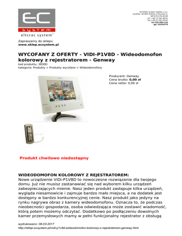 ELTCRAC System Spółka z o.o. siedziba: 30-803 Kraków ul.Ruciana 3, NIP 679-278-49-99 tel: +48 12 292 48 61 fax:+48 12 292 48 62 tel 535-999-116 gg: 35229170 Zapraszamy do sklepu www.sklep.ecsystem.pl WYCOFANY Z OFERTY - VIDI-P1V8D - Wideodomofon kolorowy z rejestratorem - Genway kod produktu: 3830D kategoria: Produkty > Produkty wycofane > Wideodomofony Producent: Genway Cena brutto: 0,00 zł Cena netto: 0,00 zł Produkt chwilowo niedostępny WIDEODOMOFON KOLOROWY Z REJESTRATOREM: Nowe urządzenie ViDi-P1V8D to nowoczesne rozwiązanie dla twojego domu. Już nie musisz zastanawiać się nad wyborem kilku urządzeń zabezpieczających mienie. Nasz jeden produkt zastępuje kilka urządzeń, wygląda niesamowicie i zajmuje bardzo mało miejsca, a na dodatek jest dostępny w bardzo konkurencyjnej cenie. Nasz produkt jako jedyny na rynku nagrywa obraz z kamery wideodomofonu. Oznacza to, że podczas nieobecności gospodarza, osoba odwiedzająca może zostawić wiadomość, którą potem możemy odczytać. Dodatkowo po podłączeniu dowolnych kamer przemysłowych mamy w pełni funkcjonalny rejestrator z obsługą wydrukowano: 08-03-2017 http://sklep-ecsystem.pl/vidi-p1v8d-wideodomofon-kolorowy-z-rejestratorem-genway.html podglądu obrazu przez internet. Do wyboru mamy kilka ustawień nagrywania obrazu, możemy ustawić nagrywanie ciągłe 24 godziny na dobę lub nagrywanie tylko po wykryciu ruchu w zasięgu kamery. W komplecie znajduje się również zbiorczy zasilacz do obsługi 4 kamer CCTV. Urządzenie możemy obsługiwać poprzez pilot lub panel w monitorze. Wandaloodporny panel zewnętrzny wykonany jest z metalu. Kamera w panelu jest ukryta i ma doświetlenie nocne. Panel możemy zamocować natynkowo lub podtynkowo, w komplecie są wszystkie elementy mocujące. Funkcjami rejestratora możemy sterować z przycisków w monitorze jak równiez z pilota załączonego do zestawu. Rejestrator posiada wyjście AVI, oznacza to że obraz z kamer możemy oglądać na dowolnym odbiorniku (np. telewizorze). Kabelek do podłączenia znajduje się w komplecie. Nasze urządzenie ma możliwość wpięcia do sieci LAN. Obraz z kamer możemy oglądać z dowolnego miejsca na świecie. Sposób konfiguracji LAN znajduje się w polskiej instrukcji. Monitor ma również wejścia i wyjścia alarmowe. Możemy podłączyć dowolne czujniki i w razie alarmu uruchomić syrenę lub przekazać informacje do centrali alarmowej. Charekterystyka: - Monitor 8" TFT-LCD o rozdzielczości 800x600 pikseli - Dotykowy panel przycisków nawigacyjnych - Wbudowany rejestrator 4 kanałowy ( system LINUX) - Podgląd 100 kl/s (zapis 50kl/s na 4 kanały MPEG4) - Tryb nagrywania: Zapis ciągły, detekcja, harmonogram, - Automatyczny zapis obrazu z panela zewnętrznego - Odtwarzanie nagrań wg. listy zdarzeń lub czasu - Obsługa 2.5" dysku twardego SATA ( max. 500GB) - Ochrona systemu hasłem dostępu - Obsługa elektrozaczepu - Montaż ścienny lub biurkowy - Wymiary panela: 110x35x20 mm (wysokość x szerokość x grubość) - Wymiary monitora: 250 x 210 x 35 mm (wysokość x szerokość x grubość) - Waga: 3200g W skład zestawu wchodzi: - Panel zewnętrzny z ukrytą kamerą kolorową - Daszek do montażu natynkowego lub podtynkowego - Monitor LCD z wbudowanym rejestratorem na 4 kamery - Przewody do podłączenia kamer CCTV - Kabel AV - Kabel alarmowy - Przewód zasilający monitor - Przewód łączący monitor z panelem zewnętrznym - Uchwyt ścienny - Uchwyt biurkowy wydrukowano: 08-03-2017 http://sklep-ecsystem.pl/vidi-p1v8d-wideodomofon-kolorowy-z-rejestratorem-genway.html - Zasilacz 12V/4,5A Technologia wideodomofonów, jest stosunkowo nowa, co nie zmienia faktu, że jest technologią bardzo rozwiniętą. Firma Genway przygotowała dla państwa bardzo szeroką ofertę wideodomofonów, które pozwolą państwu na spojrzenie na naszego potencjalnego gościa. Pozwala to na uzyskanie znacznie wyższego poziomu bezpieczeństwa niż w przypadku klasycznego, analogowego domofonu. wydrukowano: 08-03-2017 http://sklep-ecsystem.pl/vidi-p1v8d-wideodomofon-kolorowy-z-rejestratorem-genway.html