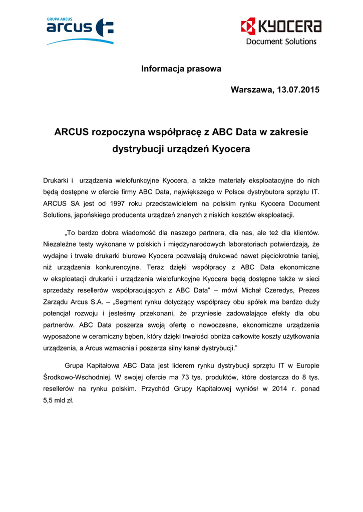 Informacja prasowa Warszawa, 13.07.2015 ARCUS rozpoczyna współpracę z ABC Data w zakresie dystrybucji urządzeń Kyocera Drukarki i urządzenia wielofunkcyjne Kyocera, a także materiały eksploatacyjne do nich będą dostępne w ofercie firmy ABC Data, największego w Polsce dystrybutora sprzętu IT. ARCUS SA jest od 1997 roku przedstawicielem na polskim rynku Kyocera Document Solutions, japońskiego producenta urządzeń znanych z niskich kosztów eksploatacji. „To bardzo dobra wiadomość dla naszego partnera, dla nas, ale też dla klientów. Niezależne testy wykonane w polskich i międzynarodowych laboratoriach potwierdzają, że wydajne i trwałe drukarki biurowe Kyocera pozwalają drukować nawet pięciokrotnie taniej, niż urządzenia konkurencyjne. Teraz dzięki współpracy z ABC Data ekonomiczne w eksploatacji drukarki i urządzenia wielofunkcyjne Kyocera będą dostępne także w sieci sprzedaży resellerów współpracujących z ABC Data” – mówi Michał Czeredys, Prezes Zarządu Arcus S.A. – „Segment rynku dotyczący współpracy obu spółek ma bardzo duży potencjał rozwoju i jesteśmy przekonani, że przyniesie zadowalające efekty dla obu partnerów. ABC Data poszerza swoją ofertę o nowoczesne, ekonomiczne urządzenia wyposażone w ceramiczny bęben, który dzięki trwałości obniża całkowite koszty użytkowania urządzenia, a Arcus wzmacnia i poszerza silny kanał dystrybucji.” Grupa Kapitałowa ABC Data jest liderem rynku dystrybucji sprzętu IT w Europie Środkowo-Wschodniej. W swojej ofercie ma 73 tys. produktów, które dostarcza do 8 tys. resellerów na rynku polskim. Przychód Grupy Kapitałowej wyniósł w 2014 r. ponad 5,5 mld zł. O GRUPIE ARCUS ARCUS SA jest jednym z największych na polskim rynku dostawców zintegrowanych systemów zarządzania dokumentem i korespondencją masową. ARCUS SA jest przedstawicielem Kyocera Document Solutions oraz Pitney Bowes w Polsce. ARCUS SA i spółki zależne: T-matic Systems SA oraz ARCUS Systemy Informatyczne Sp. z o.o. dostarczają również kompleksowe rozwiązania oraz usługi z zakresu telematyki i inteligentnych sieci, a także integracji rozwiązań ICT (technologie informacyjno-telekomunikacyjne). Czwartą spółką wchodzącą w skład GRUPY ARCUS jest DocuSoft Sp. z o.o. produkująca systemy do obiegu informacji. Do największych klientów GRUPY ARCUS należą banki, firmy ubezpieczeniowe, firmy z branży telekomunikacyjnej, operatorzy pocztowi i logistyczni oraz administracja publiczna na szczeblu centralnym i lokalnym. O KYOCERA Document Solutions Europe B.V. KYOCERA Document Solutions jest jednym z wiodących na świecie dostawców rozwiązań z zakresu zarządzaniem dokumentami. Zakres produktów i usług firmy obejmuje drukarki ECOSYS, niezawodne urządzenia wielofunkcyjne, wysokiej jakości materiały eksploatacyjne i szeroki zakres rozwiązań programowych i Managed Services Document (MDS). Oferta KYOCERA Document Solutions zawiera innowacyjne produkty z komponentami o długiej żywotności. Ich użytkownicy korzystają z niskiego całkowitego kosztu posiadania (TCO) rozwiązań oraz wysokiej wydajności w każdym miejscu pracy. Oferta rozwiązań i usługi Managed Document Services umożliwiają klientom zmniejszenie kosztów, pozytywny wpływ na środowisko oraz poprawę efektywności i niezawodności procesów biznesowych w tym samym czasie. Więcej informacji na stronie: www.kyoceradocumentsolutions.pl. KYOCERA Document Solutions Inc. jest spółką zależną Kyocera Corporation, założonej w Kyoto w 1959 roku. Zajmująca 552 miejsce na liście 2000 największych światowych firm notowanych na giełdzie magazynu Forbes, Kyocera jest wiodącym producentem nowoczesnej ceramiki, komponentów elektronicznych, ogniw słonecznych i elektronicznego sprzętu biurowego. Długoterminową strategią wzrostu KYOCERA są działania wspierające sektory telekomunikacji, przetwarzanie informacji, ochrony środowiska oraz poprawy jakości życia. Kontakt dla mediów: Michał Gembal Dyrektor Marketingu ARCUS S.A. tel. (22) 53 60 900 e-mail: [email protected]