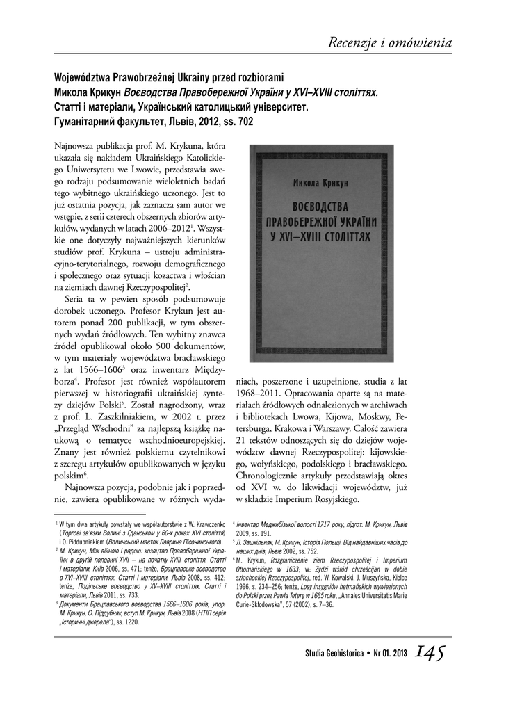 Recenzje i omówienia Województwa Prawobrzeżnej Ukrainy przed rozbiorami Микола Крикун Воєводства Правобережної України у XVI–XVIII століттях. Статті і матеріали, Український католицький університет. Гуманітарний факультет, Львів, 2012, ss. 702 Najnowsza publikacja prof. M. Krykuna, która ukazała się nakładem Ukraińskiego Katolickiego Uniwersytetu we Lwowie, przedstawia swego rodzaju podsumowanie wieloletnich badań tego wybitnego ukraińskiego uczonego. Jest to już ostatnia pozycja, jak zaznacza sam autor we wstępie, z serii czterech obszernych zbiorów artykułów, wydanych w latach 2006–20121. Wszystkie one dotyczyły najważniejszych kierunków studiów prof. Krykuna – ustroju administracyjno-terytorialnego, rozwoju demograficznego i społecznego oraz sytuacji kozactwa i włościan na ziemiach dawnej Rzeczypospolitej2. Seria ta w pewien sposób podsumowuje dorobek uczonego. Profesor Krykun jest autorem ponad 200 publikacji, w tym obszernych wydań źródłowych. Ten wybitny znawca źródeł opublikował około 500 dokumentów, w tym materiały województwa bracławskiego z lat 1566–16063 oraz inwentarz Międzyborza4. Profesor jest również współautorem pierwszej w historiografii ukraińskiej syntezy dziejów Polski5. Został nagrodzony, wraz z prof. L. Zaszkilniakiem, w 2002 r. przez „Przegląd Wschodni” za najlepszą książkę naukową o tematyce wschodnioeuropejskiej. Znany jest również polskiemu czytelnikowi z szeregu artykułów opublikowanych w języku polskim6. Najnowsza pozycja, podobnie jak i poprzednie, zawiera opublikowane w różnych wydaW tym dwa artykuły powstały we współautorstwie z W. Krawczenko (Торгові зв’язки Волині з Ґданськом у 60-х роках XVI століття) i O. Piddubniakiem (Волинський маєток Лаврина Пісочинського). 2 М. Крикун, Між війною і радою: козацтво Правобережної України в другій половині XVII – на початку XVIII століття. Статті і матеріали, Київ 2006, ss. 471; tenże, Брацлавське воєводство в XVI–XVIII століттях. Статті і матеріали, Львів 2008, ss. 412; tenże, Подільське воєводство у XV–XVIII століттях. Статті і матеріали, Львів 2011, ss. 733. 3 Документи Брацлавського воєводства 1566–1606 років, упор. М. Крикун, О. Пiддубняк, вступ М. Крикун, Львів 2008 (НТІП серія „Історичні джерела“), ss. 1220. 1 niach, poszerzone i uzupełnione, studia z lat 1968–2011. Opracowania oparte są na materiałach źródłowych odnalezionych w archiwach i bibliotekach Lwowa, Kijowa, Moskwy, Petersburga, Krakowa i Warszawy. Całość zawiera 21 tekstów odnoszących się do dziejów województw dawnej Rzeczypospolitej: kijowskiego, wołyńskiego, podolskiego i bracławskiego. Chronologicznie artykuły przedstawiają okres od XVI w. do likwidacji województw, już w składzie Imperium Rosyjskiego. Інвентар Меджибізької волості 1717 року, підгот. М. Крикун, Львів 2009, ss. 191. 5 Л. Зашкільняк, М. Крикун, Історія Польщі. Від найдавніших часів до наших днів, Львів 2002, ss. 752. 6 M. Krykun, Rozgraniczenie ziem Rzeczypospolitej i Imperium Ottomańskiego w 1633; w: Żydzi wśród chrześcijan w dobie szlacheckiej Rzeczypospolitej, red. W. Kowalski, J. Muszyńska, Kielce 1996, s. 234–256; tenże, Losy insygniów hetmańskich wywiezionych do Polski przez Pawła Teterę w 1665 roku, „Annales Universitatis Marie Curie-Skłodowska”, 57 (2002), s. 7–36. 4 Studia Geohistorica • Nr 01. 2013 145 Recenzje i omówienia Zbiór otwierają teksty odnoszące się do województwa wołyńskiego. Pierwszy z nich dotyczy administracyjnych granic województwa i podziału na powiaty w XVI–XVIII w. (s. 13–23). Utworzone wraz z kijowskim, w latach 1565–1566, województwo wołyńskie w składzie Wielkiego Księstwa Litewskiego w ciągu kilku wieków zmieniało swe granice. Autor omawia więc zachodzące zmiany w porządku chronologicznym, na podstawie zachowanych źródeł. Analizowane są dwa rodzaje źródeł – mapy oraz dokumenty. Pierwsza kategoria są to mapy województwa z 1629 r., generalna z 1648 r., Guillaume de Beauplan’a z 1650 r., Bazylego Sewerynowskiego z 1788 r., Atlas historyczny A. Jabłonowskiego, mapy rozgraniczające ziemie Rzeczpospolitej i monarchii austriackiej po pierwszym rozbiorze z 1776 r. Druga kategoria źródeł to Списанье поветов и границ z 1565–1566, akt rozgraniczenia w 1680 r. okupowanego przez imperium osmańskie terytorium województwa podolskiego od wołyńskiego i ruskiego, rejestry podymne województwa. Zestawiając ze sobą opisy i mapy prof. Krykun przedstawia różnice i nieścisłości w oznaczeniu granic, zaznaczając, że najczęściej problem dotyczył wschodniej części województwa. Z kolei podział administracyjny na trzy powiaty – włodzimierski, krzemieniecki i łucki – do reform sejmowych 1791 r. pozostawał niezmienny. W wyniku nowego podziału terytorialnego na Wołyniu miało powstać sześć powiatów, jednak konfederacja targowicka przekreśliła pełną realizację tej koncepcji i powrócono do poprzedniego podziału powiatów. Po 1793 r., czyli po kolejnych rozbiorach, transformacje odbywały się znacznie szybciej, by w 1796 r. wyłonić gubernię wołyńską, ale już w składzie nowego organizmu państwowego – Imperium Rosyjskiego. Cennym uzupełnieniem tekstu jest załączona mapa z zarysowanymi, na podstawie omawianych źródeł, g