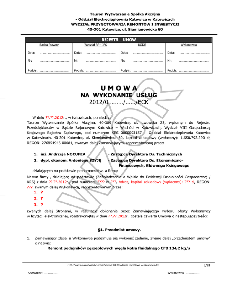 Tauron Wytwarzanie Spółka Akcyjna - Oddział Elektrociepłownia Katowice w Katowicach WYDZIAŁ PRZYGOTOWANIA REMONTÓW I INWESTYCJI 40-301 Katowice, ul. Siemianowicka 60 REJESTR Radca Prawny UMÓW Wydział RP - IFS KODE Wykonawca Data: ……………………………… Data: ……………………………… Data: ……………………………… Data: ……………………………… Nr: ……………………………… Nr: ……………………………… Nr: ……………………………… Nr: ……………………………… Podpis: ……………………………… Podpis: ……………………………… Podpis: ……………………………… Podpis: ……………………………… UMOWA NA WYKONANIE USŁUG 2012/0………/……/ECK W dniu ??.??.2012r., w Katowicach, pomiędzy: Tauron Wytwarzanie Spółka Akcyjna, 40-389 Katowice, ul. Lwowska 23, wpisanym do Rejestru Przedsiębiorców w Sądzie Rejonowym Katowice – Wschód w Katowicach, Wydział VIII Gospodarczy Krajowego Rejestru Sądowego, pod numerem KRS 0000003157 – Oddział Elektrociepłownia Katowice w Katowicach, 40-301 Katowice, ul. Siemianowicka 60, kapitał zakładowy (wpłacony): 1.658.793.390 zł, REGON: 276854946-00081, zwanym dalej Zamawiającym, reprezentowaną przez: 1. inż. Andrzeja NOCUNIA - Zastępcę Dyrektora Ds. Technicznych 2. dypl. ekonom. Antoniego SZYJĘ - Zastępcę Dyrektora Ds. EkonomicznoFinansowych, Głównego Księgowego działających na podstawie pełnomocnictw, a firmą: Nazwa firmy , działającą na podstawie (Zaświadczenie o Wpisie do Ewidencji Działalności Gospodarczej / KRS) z dnia ??.??.2012r., pod numerem ???? w ???, Adres, kapitał zakładowy (wpłacony): ??? zł, REGON: ???, zwanym dalej Wykonawcą, reprezentowanym przez: 1. ? 2. ? 3. ? zwanych dalej Stronami, w rezultacie dokonania przez Zamawiającego wyboru oferty Wykonawcy w licytacji elektronicznej, rozstrzygniętej w dniu ??.??.2012r., została zawarta Umowa o następującej treści: §1. Przedmiot umowy. 1. Zamawiający zleca, a Wykonawca podejmuje się wykonać zadanie, zwane dalej „przedmiotem umowy” o nazwie: Remont podajników zgrzebłowych węgla kotła fluidalnego CFB 134,2 kg/s 1/15 (16) c:\users\mmandera\documents\remont 2012\podajniki zgrzebłowe węgla\umowa.doc Sporządził: ................ Wykonawca: ................ 2. 3. 4. Szczegółowy zakres prac, jakie mają być wykonane w celu realizacji przedmiotu umowy, jest określony w Rzeczowym Zakresie Prac stanowiącym Załącznik nr 1 do niniejszej umowy. Zamawiający może zlecić Wykonawcy wykonanie robót dodatkowych lub zamiennych, jeżeli wykonanie takich robót okaże się konieczne dla prawidłowej realizacji przedmiotu umowy. Roboty, o których mowa wyżej, mogą być wykonywane po sporządzeniu i podpisaniu przez Strony aneksu do umowy, określającego zakres robót oraz szczegółowe warunki ich wykonywania. Wszelkie materiały, urządzenia, narzędzia itp. nie ujęte w Załączniku nr 1 do niniejszej umowy, konieczne do realizacji zleconych prac zapewnia Wykonawca. §2. Podwykonawcy. 1. 2. 3. Wykonawca ma prawo po uzyskaniu pisemnej zgody Zamawiającego, podzlecić innym podmiotom gospodarczym (dalej zwanym „Podwykonawcami”) wykonanie części prac objętych niniejszą umową, z zastrzeżeniem, iż łączna wartość wszystkich podzleconych prac nie przekroczy 25% wartości wynagrodzenia umownego określonego w §7, ust. 1. Podzlecenie przez Wykonawcę wykonania części prac Podwykonawcom nie może prowadzić do podwyższenia wynagrodzenia za wykonanie przedmiotu umowy. Naruszenie przez Wykonawcę warunków określonych w ust. 1÷2 stanowi podstawę do odstąpienia od umowy przez Zamawiającego z przyczyn zależnych od Wykonawcy. §3. Terminy wykonania prac. 1. 2. 3. 4. Termin rozpoczęcia prac ustala się na dzień 19.06.2012r. Termin zakończenia prac ustala się na dzień 13.07.2012r. Terminy określone w ust. 1 i 2 mogą ulec zmianie w przypadkach: a) zlecenia przez Zamawiającego robót dodatkowych, których wykonanie okaże się konieczne dla wykonania przedmiotu umowy, b) zażądania przez Zamawiającego lub zaakceptowania przez niego wnioskowanej przez Wykonawcę zmiany przyjętej technologii wykonywania prac objętych niniejszą umową, c) powstania konieczności wykonania robót dodatkowych niezbędnych dla zapewnienia bezpieczeństwa lub konieczności zapobieżenia awarii, d) wystąpienia nieprzewidzianych przerw w pracach zależnych od Zamawiającego, e) przerw w pracach wynikających z wystąpienia niekorzystnych warunków atmosferycznych, mających wpływ na bezpieczeństwo pracy i zachowanie wymogów technologicznych wykonywania prac, f) wystąpienia Siły Wyższej, mającej wpływ na realizację Umowy, która zdefiniowana została w §10, ust. 6 Umowy. g) innych uzgodnień zaakceptowanych przez Strony w formie pisemnej. W przypadku powstania sytuacji określonych w ust. 3, Strony po przeprowadzeniu negocjacji, ustalą nowy termin wykonania przedmiotu umowy w drodze pisemnego aneksu. §4. Ustalenia formalne. 1. 2. 3. 4. Zamawiający przekaże Wykonawcy front robót od dnia 18.06.2012r. Przekazanie obiektu do prac nastąpi na podstawie wpisu do Dziennika Robót. Zamawiający zapewnia dla Wykonawcy na koszt Zamawiającego źródła poboru wody oraz energii elektrycznej do celów technologicznych. Zamawiający zapewnia odpłatnie korzystanie z zaplecza socjalnego dla pracowników Wykonawcy. Warunki płatności zostaną ujęte w odrębnym porozumieniu. Wykonawca oświadcza, że zna warunki i sposób wykonania prac objętych niniejszą Umową i ponosi z tego tytułu pełną odpowiedzialność, oraz znane mu są obowiązujące przepisy BHP, P.Poż., 2/15 (16) c:\users\mmandera\documents\remont 2012\podajniki zgrzebłowe węgla\umowa.doc Sporządził: ................ Wykonawca: ................ 5. 6. ochrony środowiska, porządkowe i inne wynikające z zakresu wykonywanych prac ora