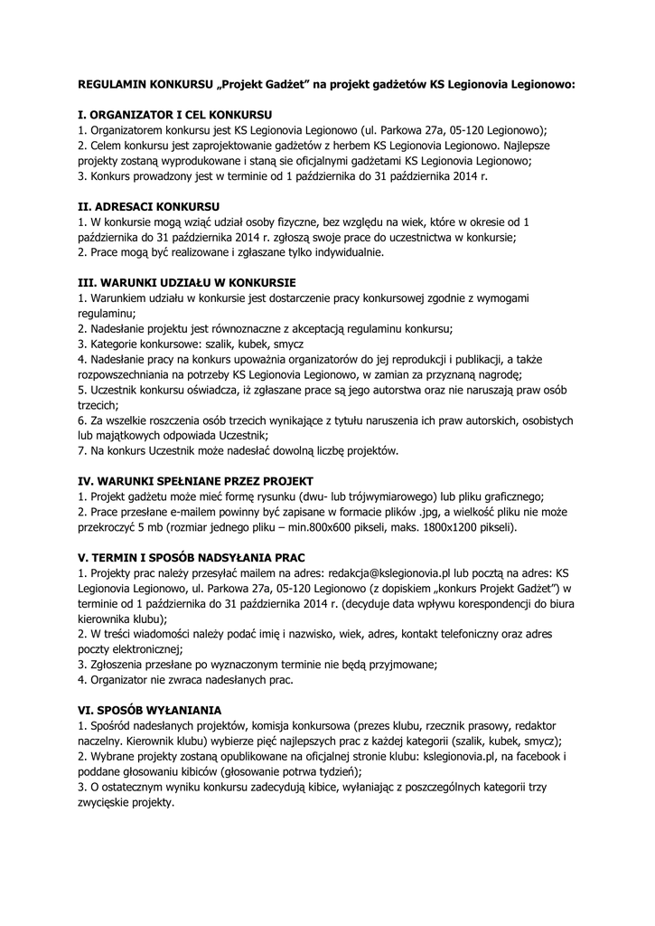 REGULAMIN KONKURSU „Projekt Gadżet” na projekt gadżetów KS Legionovia Legionowo: I. ORGANIZATOR I CEL KONKURSU 1. Organizatorem konkursu jest KS Legionovia Legionowo (ul. Parkowa 27a, 05-120 Legionowo); 2. Celem konkursu jest zaprojektowanie gadżetów z herbem KS Legionovia Legionowo. Najlepsze projekty zostaną wyprodukowane i staną sie oficjalnymi gadżetami KS Legionovia Legionowo; 3. Konkurs prowadzony jest w terminie od 1 października do 31 października 2014 r. II. ADRESACI KONKURSU 1. W konkursie mogą wziąć udział osoby fizyczne, bez względu na wiek, które w okresie od 1 października do 31 października 2014 r. zgłoszą swoje prace do uczestnictwa w konkursie; 2. Prace mogą być realizowane i zgłaszane tylko indywidualnie. III. WARUNKI UDZIAŁU W KONKURSIE 1. Warunkiem udziału w konkursie jest dostarczenie pracy konkursowej zgodnie z wymogami regulaminu; 2. Nadesłanie projektu jest równoznaczne z akceptacją regulaminu konkursu; 3. Kategorie konkursowe: szalik, kubek, smycz 4. Nadesłanie pracy na konkurs upoważnia organizatorów do jej reprodukcji i publikacji, a także rozpowszechniania na potrzeby KS Legionovia Legionowo, w zamian za przyznaną nagrodę; 5. Uczestnik konkursu oświadcza, iż zgłaszane prace są jego autorstwa oraz nie naruszają praw osób trzecich; 6. Za wszelkie roszczenia osób trzecich wynikające z tytułu naruszenia ich praw autorskich, osobistych lub majątkowych odpowiada Uczestnik; 7. Na konkurs Uczestnik może nadesłać dowolną liczbę projektów. IV. WARUNKI SPEŁNIANE PRZEZ PROJEKT 1. Projekt gadżetu może mieć formę rysunku (dwu- lub trójwymiarowego) lub pliku graficznego; 2. Prace przesłane e-mailem powinny być zapisane w formacie plików .jpg, a wielkość pliku nie może przekroczyć 5 mb (rozmiar jednego pliku – min.800x600 pikseli, maks. 1800x1200 pikseli). V. TERMIN I SPOSÓB NADSYŁANIA PRAC 1. Projekty prac należy przesyłać mailem na adres: [email protected] lub pocztą na adres: KS Legionovia Legionowo, ul. Parkowa 27a, 05-120 Legionowo (z dopiskiem „konkurs Projekt Gadżet”) w terminie od 1 października do 31 października 2014 r. (decyduje data wpływu korespondencji do biura kierownika klubu); 2. W treści wiadomości należy podać imię i nazwisko, wiek, adres, kontakt telefoniczny oraz adres poczty elektronicznej; 3. Zgłoszenia przesłane po wyznaczonym terminie nie będą przyjmowane; 4. Organizator nie zwraca nadesłanych prac. VI. SPOSÓB WYŁANIANIA 1. Spośród nadesłanych projektów, komisja konkursowa (prezes klubu, rzecznik prasowy, redaktor naczelny. Kierownik klubu) wybierze pięć najlepszych prac z każdej kategorii (szalik, kubek, smycz); 2. Wybrane projekty zostaną opublikowane na oficjalnej stronie klubu: kslegionovia.pl, na facebook i poddane głosowaniu kibiców (głosowanie potrwa tydzień); 3. O ostatecznym wyniku konkursu zadecydują kibice, wyłaniając z poszczególnych kategorii trzy zwycięskie projekty. VII. NAGRODY 1. Najlepsze trzy prace w każdej kategorii zostaną nagrodzone: Nagrody za pierwsze miejsca: – karnet na rundę wiosenną na trybunę krytą plus zaprojektowany przez zwycięzcę gadżet; Nagrody za drugie miejsca: – karnet na rundę wiosenną na trybunę otwartą; Nagrody za trzecie miejsca: – bilet VIP na spotkanie przypadające po rozstrzygnięciu konkursu; 2. Nagrody zwycięzcom wręczą piłkarze Legionovii. 3. Przyjmując nagrody, laureaci zobowiązują się do podpisania umowy o przeniesienie majątkowych praw autorskich do dzieła. Postanowienia niniejszego Regulaminu stanowią jedyne źródło praw i obowiązków między uczestnikami Konkursu, a Organizatorem. Pytania związane z konkursem prosimy kierować wyłącznie drogą mailową na adres: [email protected].
