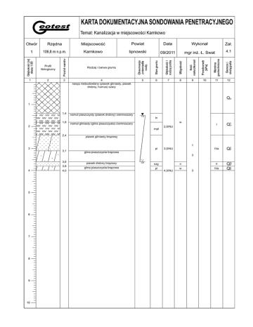 KARTA DOKUMENTACYJNA SONDOWANIA PENETRACYJNEGO Temat: Kanalizacja w miejscowości Karnkowo Otwór Rzędna Miejscowość Powiat Data Wykonał Zał. 1 106,8 m n.p.m. Karnkowo lipnowski 09/2011 mgr inż. Ł. Swat 4.1 Profil litologiczny 1 2 Rodzaj i barwa gruntu 3 4 nasyp niebudowlany (piasek gliniasty, piasek drobny, humus) szary 5 6 7 8 9 10 11 12 QH 1 1,4 1,8 namuł piaszczysty (piasek drobny) ciemnoszary 1,5 ln w namuł gliniasty (glina piaszczysta) ciemnoszary 2 mpl 2,4 2,0/NU I QbH IVa QgP II QfgP QgP piasek gliniasty brązowy 1 3 3,1 pl 3,0/NU glina piaszczysta brązowa 3 4 5 6 7 8 9 10 3,6 piasek drobny brązowy 3,8 glina piaszczysta brązowa 4,0 3,6 szg pl n 4,0/NU w 3 IVa KARTA DOKUMENTACYJNA SONDOWANIA PENETRACYJNEGO Temat: Kanalizacja w miejscowości Karnkowo Otwór Rzędna Miejscowość Powiat Data Wykonał Zał. 2 108,2 m n.p.m. Karnkowo lipnowski 09/2011 mgr inż. Ł. Swat 4.2 Profil litologiczny 1 2 Rodzaj i barwa gruntu 3 0,4 4 nasyp niebudowlany (piasek drobny, humus) ciemnoszary 5 7 8 9 10 11 12 QH w piasek drobny brązowy 0,9 1 1,3 6 szg 1,0/NU II QfgP IVa QgP n glina piaszczysta brązowa 3 2 2,0/NU 3 2,7 3 glina piaszczysta szara pl w 3,0/NU 3 4 5 6 7 8 9 10 4,0 4,0/NU KARTA DOKUMENTACYJNA SONDOWANIA PENETRACYJNEGO Temat: Kanalizacja w miejscowości Karnkowo Otwór Rzędna Miejscowość Powiat Data Wykonał Zał. 3 111,3 m n.p.m. Karnkowo lipnowski 09/2011 mgr inż. Ł. Swat 4.3 Profil litologiczny 1 2 Rodzaj i barwa gruntu 3 0,3 4 nasyp niebudowlany (piasek drobny, humus) szarobrązowy piasek gliniasty brązowy 5 6 0,9 piasek drobny brązowy 0,5/NU w 1,2/NU n pl 2 w 3 glina pylasta zwięzła ciemnobrązowa 3,5/NU 4 5 6 7 8 9 10 4,0 11 12 IVa QgP II QfgP IVa QgP 3 2,0/NU 3,0 10 glina piaszczysta brązowa 2 3 9 0,9 szg 1,4 8 QH pl 1 7 4/5 KARTA DOKUMENTACYJNA SONDOWANIA PENETRACYJNEGO Temat: Kanalizacja w miejscowości Karnkowo Otwór Rzędna Miejscowość Powiat Data Wykonał Zał. 4 103,5 m n.p.m. Karnkowo lipnowski 09/2011 mgr inż. Ł. Swat 4.4 Profil litologiczny 1 2 Rodzaj i barwa gruntu 3 4 nasyp niebudowlany (piasek drobny, humus) ciemnoszary 5 6 7 8 9 10 11 12 QH w 1 1,5 1,8 1,5/NU namuł gliniasty (piasek gliniasty) ciemnoszary namuł piaszczysty (piasek drobny) ciemnoszary 2 mpl 1,8 ln 2,4 2,5/NU 6 7 8 9 10 III QfgP IVa QgP 1 pl 5 QbH piasek gliniasty brązowy 3 4 I n pospółka brązowa szg 2,8 2,0/NU 4,0 3,5/NU w 1 KARTA DOKUMENTACYJNA SONDOWANIA PENETRACYJNEGO Temat: Kanalizacja w miejscowości Karnkowo Otwór Rzędna Miejscowość Powiat Data Wykonał Zał. 5 111,5 m n.p.m. Karnkowo lipnowski 09/2011 mgr inż. Ł. Swat 4.5 Profil litologiczny 1 2 Rodzaj i barwa gruntu 3 0,5 1 0,9 4 nasyp niebudowlany (piasek gliniasty, piasek drobny, humus) brązowoszary 5 6 7 8 9 10 11 12 QH 0,5/NU piasek gliniasty brązowy 1 glina piaszczysta brązowa 2 pl 2 IVa 2,0/NU w QgP 4 2,7 3 3,0/NU mpl IVb 4 4 5 6 7 8 9 10 4,0 KARTA DOKUMENTACYJNA SONDOWANIA PENETRACYJNEGO Temat: Kanalizacja w miejscowości Karnkowo Otwór Rzędna Miejscowość Powiat Data Wykonał Zał. 6 112,9 m n.p.m. Karnkowo lipnowski 09/2011 mgr inż. Ł. Swat 4.6 Profil litologiczny 1 2 Rodzaj i barwa gruntu 3 0,5 4 nasyp niebudowlany (pasek gliniasty, piasek drobny, humus) szarobrązowy 5 6 7 8 9 10 11 12 QH glina piaszczysta brązowa 1 1,0/NU 2/3 pl 2 IVa 2,0/NU w 3 QgP 3 3,0/NU 4 mpl 4 5 6 7 8 9 10 4,0 IVb 4,0/NU 4