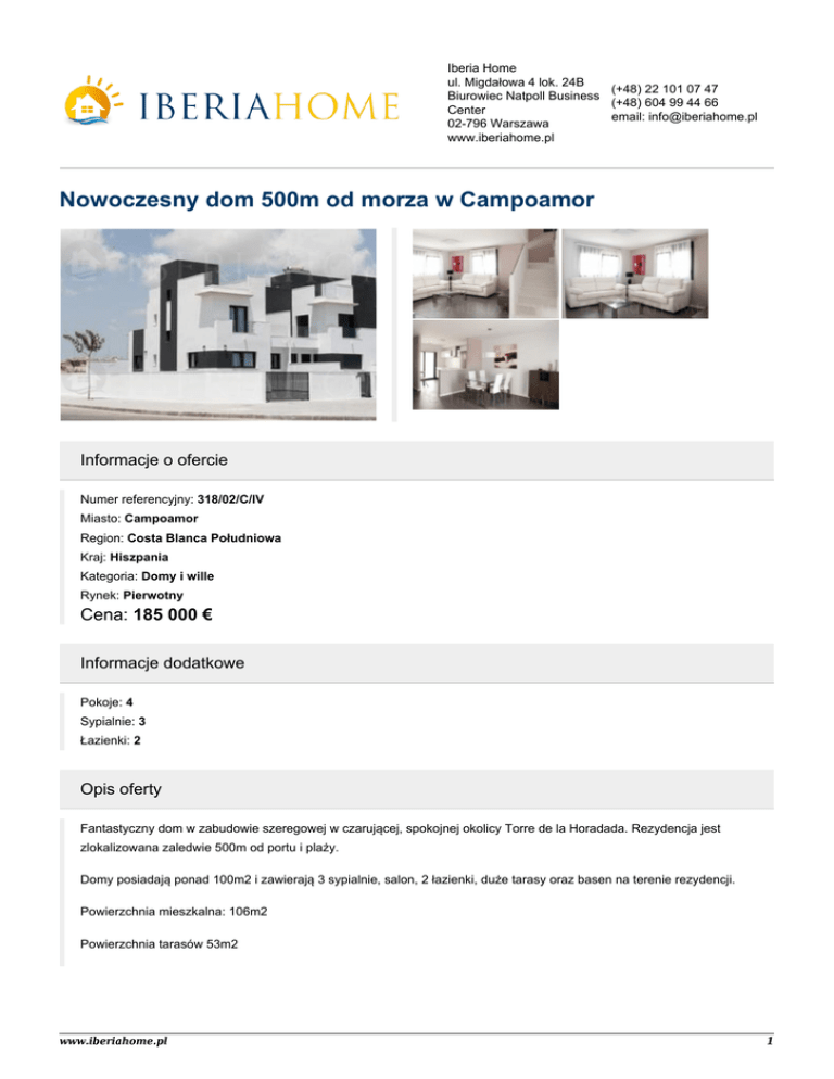 Iberia Home ul. Migdałowa 4 lok. 24B (+48) 22 101 07 47 Biurowiec Natpoll Business (+48) 604 99 44 66 Center email: [email protected] 02-796 Warszawa www.iberiahome.pl Nowoczesny dom 500m od morza w Campoamor Informacje o ofercie Numer referencyjny: 318/02/C/IV Miasto: Campoamor Region: Costa Blanca Południowa Kraj: Hiszpania Kategoria: Domy i wille Rynek: Pierwotny Cena: 185 000 € Informacje dodatkowe Pokoje: 4 Sypialnie: 3 Łazienki: 2 Opis oferty Fantastyczny dom w zabudowie szeregowej w czarującej, spokojnej okolicy Torre de la Horadada. Rezydencja jest zlokalizowana zaledwie 500m od portu i plaży. Domy posiadają ponad 100m2 i zawierają 3 sypialnie, salon, 2 łazienki, duże tarasy oraz basen na terenie rezydencji. Powierzchnia mieszkalna: 106m2 Powierzchnia tarasów 53m2 www.iberiahome.pl 1 Udogodnienia ● Basen wspólnoty ● Taras ● Klimatyzacja ● Ogródek www.iberiahome.pl 2