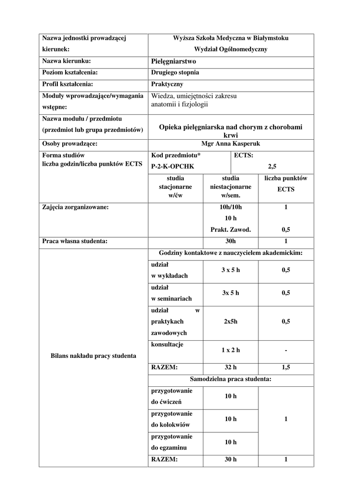 Nazwa jednostki prowadzącej Wyższa Szkoła Medyczna w Białymstoku kierunek: Wydział Ogólnomedyczny Nazwa kierunku: Pielęgniarstwo Poziom kształcenia: Drugiego stopnia Profil kształcenia: Praktyczny Moduły wprowadzające/wymagania Wiedza, umiejętności zakresu anatomii i fizjologii wstępne: Nazwa modułu / przedmiotu (przedmiot lub grupa przedmiotów) Opieka pielęgniarska nad chorym z chorobami krwi Osoby prowadzące: Forma studiów liczba godzin/liczba punktów ECTS Mgr Anna Kasperuk Kod przedmiotu* ECTS: P-2-K-OPCHK 2,5 studia stacjonarne w/ćw Zajęcia zorganizowane: studia niestacjonarne w/sem. liczba punktów 10h/10h 1 ECTS 10 h Praca własna studenta: Prakt. Zawod. 0,5 30h 1 Godziny kontaktowe z nauczycielem akademickim: udział w wykładach udział w seminariach udział 3x5h 0,5 3x 5 h 0,5 2x5h 0,5 1x2h - 32 h 1,5 w praktykach zawodowych konsultacje Bilans nakładu pracy studenta RAZEM: Samodzielna praca studenta: przygotowanie do ćwiczeń przygotowanie do kolokwiów przygotowanie do egzaminu RAZEM: 10 h 10 h 1 10 h 30 h 1 Cele modułu: • Przekazanie studentom wiedzy dotyczącej zasad opieki pielęgniarskiej nad chorym z chorobami krwi. Efekty kształcenia: Odniesienie do Przedmiotowy efekt kierunkowych Efekty kształcenia kształcenia efektów kształcenia Wiedza EKP_W01. EKP_W02. EKP_W03. omawia rodzaje, wskazania i użyteczność B.W1 nowoczesnych technik diagnostycznych; charakteryzuje profesjonalną opiekę B.W18. pielęgniarską nad chorym z chorobami krwi; zna procedury przeszczepu szpiku kostnego B.W20. Umiejętności EKP_U01. EKP_U02. EKP_K01. EKP_K02. prowadzi edukację zdrowotną pacjenta z chorobami krwi i jego rodziny; współuczestniczy w procedurze przeszczepu szpiku kostnego; Kompetencje społeczne B.U17. B.U18. ponosi odpowiedzialność za udział w B.K1. podejmowaniu decyzji zawodowych; przestrzega zasad etyki zawodowej w relacji B.K6 z pacjentem i zespołem terapeutycznym oraz w pracy badawczej; Forma zajęć/metody dydaktyczne: Wykłady - metody podające: wykład informacyjny, pogadanka, opis, objaśnienie lub wyjaśnienie; Seminaria - metody aktywizujące: metoda problemowa problemowa. Metody weryfikacji efektu kształcenia: Nr efektu kształcenia Metody weryfikacji efektu kształcenia formujące podsumowujące B.W1. Egzamin teoretyczny B.W18. Egzamin teoretyczny B.W20. Egzamin teoretyczny B.U17. Egzamin teoretyczny B.U18. B.K1. Obserwacje i ocena umiejętności praktycznych studenta Zadania wykonane indywidualnie Zadania wykonane indywidualnie B.K6 Treści programowe: Wykłady – 10 godz. 1. Pielęgnowanie chorych z chorobami rozrostowymi układu białokrwinkowego 2. Pielęgnowanie chorych z ziarnicą złośliwą oraz chłoniakami nieziarniczymi 3. Pielęgnowanie pacjentów z niedokrwistością 4. Pielęgnowanie pacjentów z nadkrwistością Seminaria – 10 godz. 1. Pielęgnowanie pacjentów ze skazami krwotocznymi 2. Edukacja pacjentów ze schorzeniami układu krwiotwórczego. Tematyka zajęć praktycznych: Procedury przeszczepu szpiku kostnego. Wskazówki edukacyjne dla chorych po przeszczepie szpiku kostnego.. Zadania do samodzielnej pracy studenta: Samodzielne studiowanie literatury z tematu podanego przez nauczyciela zgodnie z efektami kształcenia. Literatura podstawowa: 1. Talarska D., Zozulińska-Ziółkiewicz D (red.), Pielęgniarstwo internistyczne. Podręcznik dla studiów medycznych, PZWL, Warszawa 2009. 2. Daniluk J., Jurgowska G. (red).: Zarys chorób wewnętrznych dla studentów pielęgniarstwa, Czelej, Lublin 2005. 3. Jędrzejczak W. W., Podolak-Dawidziak M., Standardy w hematologii, Volumed i Polskie Towarzystwo Hematologów i Transfuzjologów, Wrocław 2001. Literatura uzupełniająca: 1. Pączek L., Mucha K., Foroncewicz B.(red.): Choroby wewnętrzne. Podręcznik dla studentów pielęgniarstwa i położnictwa. PZWL, Warszawa 2004. 2. Moszyńska A., Robak T. (red.), Podstawy hematologii, Czelej, Lublin 2003. 3. Indyga J., Skazy krwotoczne, PZWL, Warszawa 2006. 4. Sułek K., Wąsak-Szulkowska E, Hematologia w praktyce, PZWL, Warszawa 2007.