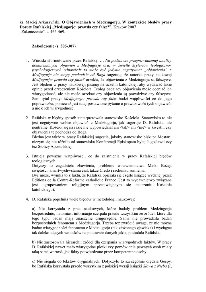 ks. Maciej Arkuszyński, O Objawieniach w Medziugorju. W kontekście błędów pracy Doroty Rafalskiej „Medjugorje: prawda czy fałsz?”, Kraków 2007 „Zakończenie”, s. 466-469. Zakończenie (s. 305-307) 1. Wnioski sformułowane przez Rafalską: … Na podstawie przeprowadzonej analizy domniemanych objawień z Medjugorje oraz w świetle kryteriów teologicznopsychologicznych odpowiedź ta może być jedynie negatywna: „objawienia” z Medjugorje nie mogą pochodzić od Boga sugerują, że autorka pracy naukowej Medjugorje: prawda czy fałsz? orzekła, że objawienia z Medziugorja są fałszywe. Jest błędem w pracy naukowej, pisanej na uczelni katolickiej, aby wydawać takie opinie przed orzeczeniem Kościoła. Teolog badający objawienia może oceniać ich wiarygodność, ale nie może orzekać czy objawienia są prawdziwe czy fałszywe. Sam tytuł pracy: Medjugorje: prawda czy fałsz budzi wątpliwości co do jego poprawności, ponieważ jest tutaj postawione pytanie o prawdziwość tych objawień, a nie o ich wiarygodność. 2. Rafalska w błędny sposób zinterpretowała stanowisko Kościoła. Stanowisko to nie jest negatywne wobec objawień z Medziugorja, jak sugeruje D. Rafalska, ale neutralne. Kościół się na razie nie wypowiedział ani <tak> ani <nie> w kwestii: czy objawienia te pochodzą od Boga. Błędna jest także w pracy Rafalskiej sugestia, jakoby stanowisko biskupa Mostaru niczym się nie różniło od stanowiska Konferencji Episkopatu byłej Jugosławii czy też Stolicy Apostolskiej. 3. Istnieją poważne wątpliwości, co do zaistnienia w pracy Rafalskiej błędów teologicznych. Dotyczy to zagadnień: zbawienia, problemu wstawiennictwa Matki Bożej, świętości, zmartwychwstania ciał, także Credo i rachunku sumienia. Być może, wynika to z faktu, że Rafalska opierała się często książce wydanej przez Editions de la Contre-Reforme catholique France (Jest to wydawnictwo związane jest ugrupowaniem religijnym sprzeciwiającym się nauczaniu Kościoła katolickiego). 4. D. Rafalska popełniła wiele błędów w metodologii naukowej: a) Nie korzystała z prac naukowych, które badały problem Medziugorja bezpośrednio, natomiast informacje czerpała przede wszystkim ze źródeł, które dla tego typu badań mają znaczenie drugorzędne. Sama nie prowadziła badań bezpośrednich fenomenu z Medziugorja. Trzeba też zwrócić uwagę, że nie można badać wiarygodności fenomenu z Medziugorja (tak złożonego zjawiska) i wyciągać tak daleko idących wniosków na podstawie danych jakie, posiadała Rafalska. b) Nie zastosowała hierarchii źródeł dla czerpania wiarygodnych faktów. W pracy D. Rafalskiej nawet mało wiarygodne plotki czy pomówienia pewnych osób miały taką samą wartość, jak fakty potwierdzone przez kompetentne osoby. c) Nie sięgała do tekstów oryginalnych. Dotyczyło to szczególnie orędzia Gospy, bo Rafalska korzystała przede wszystkim z polskiej wersji książki Słowa z Nieba (I, II, IV część tej książki była przekładem z języka francuskiego. IV część nadto wcześniej była przekładana z j. angielskiego na j. francuski) ani nawet do tych tekstów, z których dokonywano przekładów na język polski. D. Rafalska czasami zarzucała jakieś błędy orędziu z Medziugorja, a tymczasem był „błąd” polskiego przekładu. d) Nie prowadziła analizy porównawczej orędzi Matki Bożej. Orędzia, w których znajdowała błędy pochodziły jedynie z przekładu polskiego książki Słowa z Nieba. e) Nie dokonała właściwej klasyfikacji tych orędzi, która by miała znaczenie w prawidłowej ich interpretacji. Taka klasyfikacja jest konieczna, ponieważ nie wszystkie spisane przesłania Gospy mają taką samą wiarygodność (lub są dosłownym przekazem orędzia z Medziugorja). f) Metoda prowadzenia badań przez Rafalską polegała często na tym, że wychwytywała ona z różnych źródeł fakty (często te fakty można określić mianem zasłyszanych plotek), które służyły później jako podstawa do deprecjonowania objawień z Medziugorja. Czytający pracę D. Rafalskiej ma wrażenie, że wszystko co zdarzyło się w związku z tymi objawieniami ma wydźwięk negatywny. g) Nie uwzględniała w interpretacji orędzia specyficznego języka przesłań Gospy. Nie tylko, że nie uwzględniła formy literackiej badanego tekstu, ale wymagała, aby w tym prostym przekazie prorockim były używane bardzo precyzyjne określenia teologiczne. h) Na podstawie pojedynczych słów czy zwrotów, niepewnego tekstu, dowodziła zaistnienia błędów teologicznych w wypowiedziach Gospy. Nie badała tych orędzi (którym zarzuciła jakieś błędy) w kontekście całości przesłania z Medziugorja. Np. orędzie miało podany tylko rok, nie było zamieszczone w źródłach porównawczych, a pojedyncze słowo stawało się podstawą do wyciągnięcia jednoznacznych wniosków co do zaistnienia błędu teologicznego. i) Błędnie łączyła ze sobą w analizie naukowej odrębne fenomeny (chodzi o ukazywania się Matki Bożej sześciorgu widzącym i tzw. lokucje Jeleny czy Marijany). Wnioski D. Rafalska wyciągała odnośnie do orędzia z Medziugorja (zarzucając też błędy teologiczne). Tym sposobem każdy kto przyjedzie do Medziugorja i powie, że ukazuje mu się Matka Boża może być włączony do takiej analizy naukowej, jaką prowadziła Rafalska. j) Pisząc o wskazaniach Gospy, czasami łączyła ze sobą zalecenia przeznaczone dla różnych osób, grup modlitewnych oraz słowa wypowiedziane w różnym czasie. Nieuwzględnienie kontekstu (do kogo zostały skierowane słowa Gospy), tworzyło czasami dziwny (a nawet sprzeczny w swej treści) wizerunek przekazu Gospy (To podobnie jak gdyby ktoś chciał łączyć w jedną całość zalecenia dawane przez Jezusa św. Teresie z Avila i św. Faustynie Kowalskiej. A przecież każda z nich miała inne zadanie do spełnienia w Kościele.) k) Rafalska korzystała czasami z wypowiedzi 