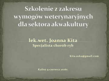lek.wet. Joanna Kita Specjalista chorób ryb [email protected] Kalisz 9 czerwca 2016r. Rybołówstwo – pozyskiwanie ryb i innych organizmów wodnych z zasobów naturalnych morskie (dla celów konsumpcyjnych i paszowych) śródlądowe (dla celów konsumpcyjnych) Akwakultura – chów i hodowla ryb i innych organizmów wodnych (skorupiaki, mięczaki, glony spożywcze etc.) chów – produkcja biomasy ryb i innych organizmów wodnych (dla celów konsumpcyjnych i zarybieniowych) hodowla – działania związane z doskonaleniem cech, selekcją akwakultura – chów lub hodowlę zwierząt akwakultury przy użyciu technik stosowanych w celu zwiększenia produkcji tych zwierząt powyżej parametrów możliwych do osiągnięcia w naturalnym środowisku, przy czym zwierzęta te na etapie chowu lub hodowli wraz z odłowem lub zbiorem stanowią przedmiot własności osób fizycznych, osób prawnych lub jednostek organizacyjnych nieposiadających osobowości prawnej; zwierzęta akwakultury – zwierzęta wodne będące w jakimkolwiek stadium rozwoju, w tym jaja, oraz nasienie lub gamety, hodowane w danym gospodarstwie lub na obszarach hodowli mięczaków, a także dzikie zwierzęta wodne przeznaczone do hodowli w danym gospodarstwie lub na obszarze hodowli mięczaków; zwierzęta wodne – ryby należące do nadgromady bezżuchwowców (Agnatha) oraz do gromad ryb chrzęstnych (Chondrichthytes) i ryb kostnych (Osteichthyes), a także mięczaki należące do typu Mollusca oraz skorupiaki należące do podtypu Crustacea; ozdobne zwierzęta wodne – zwierzęta wodne hodowane, utrzymywane lub umieszczane na rynku w celach ozdobnych; dzikie zwierzęta wodne – zwierzęta wodne inne niż zwierzęta akwakultury; podwyższona śmiertelność – niewyjaśnione przypadki śmiertelności u zwierząt akwakultury znacznie przekraczające poziom ustalony między podmiotem prowadzącym działalność w danym gospodarstwie lub na danym obszarze hodowli mięczaków a powiatowym lekarzem weterynarii dla tego gospodarstwa lub obszaru w danych warunkach; wektor – zwierzę z gatunku niewrażliwego na chorobę, za pośrednictwem którego może być przenoszony czynnik chorobotwórczy z jednego zwierzęcia z gatunku wrażliwego na drugie zwierzę; enklawa – gospodarstwo lub gospodarstwa, w których utrzymuje się populacje zwierząt wodnych o ustalonym statusie zdrowotnym w odniesieniu do określonej choroby zakaźnej, z tym że w przypadku kilku gospodarstw za enklawę uważa się gospodarstwa objęte wspólnym systemem bezpieczeństwa biologicznego, na który składają się takie same środki nadzoru stanu zdrowia zwierząt wodnych, zapobiegania chorobom zakaźnym tych zwierząt oraz zwalczania tych chorób; Powierzchnia stawów w poszczególnych województwach [ha] 11443 8689 5936 3183 430 Za: A. Lirski, IRS Karp (Cyprinus carpio) Amur biały (Ctenopharyngodon idella) Tołpyga biała (Hypophyhalmichthys molitrix) Tołpyga pstra (Aristichthys nobilis) Karaś (Carassius carassius Karaś srebrzysty (Carassius auratus) Lin (Tinca tinca) Szczupak (Esox lucius) Sandacz (Sander lucioperca) Sum europejski (Silurus glanis) W obwodzie rybackim (dla każdego jeziora, zbiornika, kanału, cieku) Protokół zarybień Protokół połowu ryb i raków Księga gospodarcza Zestawienie roczne W obrębie hodowlanym Księga stawowa RRW-22 (chów i hodowla) RRW-23 (obwody rybackie) RRW-19 (statki rybackie) RRW-20 (zakład przetwórczy) OS-4 (pobór wody, dot. obiektów o pow. większej aniżeli 10 ha) Zestawienie informacji o zakresie korzystania ze środowiska oraz wysokości należnych opłat OS-6R (odpady) Dziennik gospodarowania wodą (budowle piętrzące) nazwę lub numer stawu oraz jego powierzchnię ewidencyjną i użytkową lub objętość; dane dotyczące obsady, w tym datę obsady, gatunek ryb, stadium rozwojowe ryb, liczbę i masę wpuszczonych ryb oraz pochodzenie obsady; dane dotyczące odłowu, w tym datę odłowu, gatunek ryb, stadium rozwojowe ryb, liczbę i masę odłowionych ryb, informację, gdzie obsada została przeniesiona (nazwa lub numer stawu lub informacja, że obsada została sprzedana); rodzaje i ilość wykorzystanych pasz; wyliczony przyrost jednostkowy; wielkość powierzchni, którą nawieziono nawozami organicznymi, i ilość nawozu, jaka została zużyta; wielkość powierzchni, którą nawieziono NPK (azotem, fosforem, potasem), i ilość czystego składnika, jaka została zużyta; ilość zastosowanego wapna, soli potasowej lub innych substancji o podobnym działaniu (sumarycznie dla każdej z substancji); informacje o występowaniu w obiekcie stawowym gatunków niedocelowych w rozumieniu art. 3 pkt 8 rozporządzenia Rady (WE) nr 708/2007 z dnia 11 czerwca 2007 r. w sprawie wykorzystania w akwakulturze gatunków obcych i niewystępujących miejscowo (Dz. Urz. UE L 168 z 28.06.2007, str. 1, z późn. zm.), przy czym w przypadku stwierdzenia wystąpienia ryb z takich gatunków – również informacje o podjętych działaniach ograniczających ich liczebność oraz uniemożliwiających ich wydostanie się do powierzchniowych wód śródlądowych. Księga gospodarcza – nie później niż do 15 kwietnia roku następnego Księga stawowa – nie później niż do 15 marca roku następnego Ustawy z dnia 11 marca 2004 r. o ochronie zdrowia zwierząt oraz zwalczaniu chorób zakaźnych zwierząt (t.j. Dz.U. 2014 nr 0 poz. 1539, z późn. zm.); Rozporządzenie Ministra Rolnictwa i Rozwoju Wsi z dnia 16 października 2008r. w sprawie sposobu ustalania numeru weterynaryjnego Rozporządzenia Ministra Rolnictwa i Rozwoju Wsi z dnia 14 października 2008 r. w sprawie szczegółowych wymagań weterynaryjnych dla prowadzenia działalności w zakresie sektora akwakultury (Dz. U. z 2008 r. Nr 190, poz. 1167). Rozporządzenie Ministra Rolnictwa i Rozwoju Wsi z dnia 6 lutego 2009r. w sprawie zwalczania chorób zakaźnych zwierząt akwakultury Dyrektywa Rady 2006/88/WE (Dz. Urz. UE L328 z 24.11.2006, str 14 z późn.zm