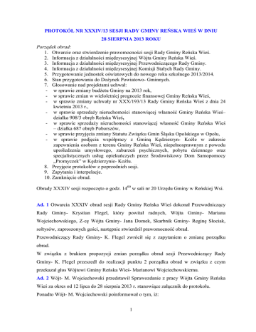 PROTOKÓŁ NR XXXIV/13 SESJI RADY GMINY REŃSKA WIEŚ W DNIU 28 SIERPNIA 2013 ROKU Porządek obrad: 1. Otwarcie oraz stwierdzenie prawomocności sesji Rady Gminy Reńska Wieś. 2. Informacja z działalności międzysesyjnej Wójta Gminy Reńska Wieś. 3. Informacja z działalności międzysesyjnej Przewodniczącego Rady Gminy. 4. Informacja z działalności międzysesyjnej Komisji Stałych Rady Gminy. 5. Przygotowanie jednostek oświatowych do nowego roku szkolnego 2013/2014. 6. Stan przygotowania do Dożynek Powiatowo- Gminnych. 7. Głosowanie nad projektami uchwał: - w sprawie zmiany budżetu Gminy na 2013 rok, - w sprawie zmian w wieloletniej prognozie finansowej Gminy Reńska Wieś, - w sprawie zmiany uchwały nr XXX/193/13 Rady Gminy Reńska Wieś z dnia 24 kwietnia 2013 r., - w sprawie sprzedaży nieruchomości stanowiącej własność Gminy Reńska Wieś– działka 908/3 obręb Reńska Wieś, - w sprawie sprzedaży nieruchomości stanowiącej własność Gminy Reńska Wieś – działka 687 obręb Poborszów, - w sprawie przyjęcia zmiany Statutu Związku Gmin Śląska Opolskiego w Opolu, - w sprawie podjęcia współpracy z Gminą Kędzierzyn- Koźle w zakresie zapewnienia osobom z terenu Gminy Reńska Wieś, niepełnosprawnym z powodu upośledzenia umysłowego, zaburzeń psychicznych, pobytu dziennego oraz specjalistycznych usług opiekuńczych przez Środowiskowy Dom Samopomocy „Promyczek” w Kędzierzynie- Koźlu. 8. Przyjęcie protokołów z poprzednich sesji. 9. Zapytania i interpelacje. 10. Zamknięcie obrad. Obrady XXXIV sesji rozpoczęto o godz. 1400 w sali nr 20 Urzędu Gminy w Reńskiej Wsi. Ad. 1 Otwarcia XXXIV obrad sesji Rady Gminy Reńska Wieś dokonał Przewodniczący Rady Gminy- Krystian Flegel, który powitał radnych, Wójta Gminy- Mariana Wojciechowskiego, Z-cę Wójta Gminy- Jana Domek, Skarbnik Gminy- Reginę Słociak, sołtysów, zaproszonych gości, następnie stwierdził prawomocność obrad. Przewodniczący Rady Gminy- K. Flegel zwrócił się z zapytaniem o zmianę porządku obrad. W związku z brakiem propozycji zmian porządku obrad sesji Przewodniczący Rady Gminy- K. Flegel przeszedł do realizacji punktu 2 porządku obrad w związku z czym przekazał głos Wójtowi Gminy Reńska Wieś- Marianowi Wojciechowskiemu. Ad. 2 Wójt- M. Wojciechowski przedstawił Sprawozdanie z pracy Wójta Gminy Reńska Wieś za okres od 12 lipca do 28 sierpnia 2013 r. stanowiące załącznik do protokołu. Ponadto Wójt- M. Wojciechowski poinformował o tym, iż: 1 - Wpłynęło pismo Marszałka Województwa w sprawie darowizny na rzecz województwa naszych terenów inwestycyjnych. Pan Marszałek, chciałby się w tej sprawie spotkać z radnymi. Jest pomysł w województwie, żeby włączyć się do którejś strefy ekonomicznej. Nasze województwo jest jedynym województwem, które nie posiada własnej strefy ekonomicznej. Część naszych terenów inwestycyjnych należy do śląskiej, czy do gliwickiej strefy, część do wałbrzyskiej, natomiast my, jako za małe województwo tej strefy nie mamy. Teraz w Urzędzie Marszałkowskim wymyślono, żeby przystąpić do strefy wałbrzyskiej i to z takim wkładem, który by dawał prawo głosu. Właścicielem stref ekonomicznych jest Skarb Państwa. Natomiast przedstawiciel tej gminy, czy instytucji, która ma w tej strefie największy wkład finansowy ma prawo głosu. Nasz Urząd Marszałkowski wymyślił, że jakby zebrał od gmin na terenie naszego województwa tereny, które te gminy mają do dyspozycji i oczywiście te gminy, te tereny by przekazały samorządowi województwa w formie darowizny to oni by je wycenili i aportem wnieśli do tej strefy wałbrzyskiej i w ten sposób przebiliby Wałbrzych, który ma 14,5 miliona. Mam poważne wątpliwości co do takiego zamiaru, bo my jeżeli zrealizujemy projekt, który jest w tej chwili realizowany, związany z budową dróg to z budżetu gminy do tego terenu, lekko szacując dołożyliśmy między 2 a 2,5 mln złotych, łącznie z zakupem. Teraz w formie darowizny mamy to przekazać samorządowi województwa i tak właściwie przestać mieć wpływ na to co się tam będzie działo. Myślę, że to nie jest specjalnie dobre rozwiązanie, jak Marszałek chce się spotkać to nie odmówię. Myślę, że takie spotkanie zorganizujemy i o terminie powiadomimy. - Dostaliśmy całe mienie z PKP. PKP miało to w użytkowaniu wieczystym. Z użytkowaniem wieczystym związane jest to, że trzeba, co roku płacić opłatę za użytkownie wieczyste. Opłaty nie są ogromne, ale są, w związku z tym wróciliśmy się do Starostwa z prośbą o akt darowizny, żeby uzyskać prawo własności tych terenów. Starostwo wysłało pismo do Wojewody, samo nie chciało podjąć decyzji. Wojewoda w imieniu Skarbu Państwa wyraził zgodę na podarowanie nam tego użytkowania wieczystego. W związku z tym spisaliśmy akt notarialny i od tego czasu jesteśmy, nie użytkownikiem, a właścicielem tych terenów i z tego tytułu żadnych kosztów związanych z opłatami nie mamy. Wójt Gminy Reńska Wieś przedstawił zarządzenia podpisane w okresie międzysesyjnym, których zestawienie stanowi załącznik do protokołu. Ad. 3 Sprawozdanie z pracy Przewodniczącego Rady Gminy- K. Flegel w okresie od 12 lipca do 28 sierpnia 2013 r. zawiera następujące punkty: 20.07- Udział w pogrzebie Wójta Gołębowskiego, 2 27.07- Jubileusz OSP Mechnica- Kamionka 25.08- Sikawki Konne w Pokrzywnicy 26.08- Udział w posiedzeniu Komisji Społeczno- Oświatowej. W poczcie wpłynęły pisma: - Informacja Wójta Gminy Reńska Wieś z wykonania budżetu za I półrocze 2013 roku, - Wydział Leśny Katedry Ochrony Lasu i Ekologii Szkoły Głównej Gospodarstwa Wiejskiego w Warszawie przysłał ankietę do wypełnienia, dotyczy to głównie lasów, parków krajobrazowych, - Urząd Skarbowy przysłał informację o naszych oświadczeniach majątkowych. Ad. 4 Przewodniczący Rady- K. Flegel przekazał głos kolejno Prz