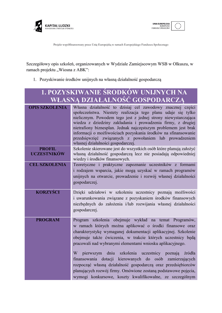 Projekt współfinansowany przez Unię Europejską w ramach Europejskiego Funduszu Społecznego Szczegółowy opis szkoleń, organizowanych w Wydziale Zamiejscowym WSB w Olkuszu, w ramach projektu „Wiosna z ABK”: 1. Pozyskiwanie środków unijnych na własną działalność gospodarczą 1. POZYSKIWANIE ŚRODKÓW UNIJNYCH NA WŁASNĄ DZIAŁALNOŚĆ GOSPODARCZĄ OPIS SZKOLENIA PROFIL UCZESTNIKÓW CEL SZKOLENIA Własna działalność to dzisiaj cel zawodowy znacznej części społeczeństwa. Niestety realizacja tego planu udaje się tylko nielicznym. Powodem tego jest z jednej strony niewystarczająca wiedza z dziedziny zakładania i prowadzenia firmy, z drugiej nietrafiony biznesplan. Jednak najczęstszym problemem jest brak informacji o możliwościach pozyskania środków na sfinansowanie przedsięwzięć związanych z powołaniem lub prowadzeniem własnej działalności gospodarczej. Szkolenie skierowane jest do wszystkich osób które planują założyć własną działalność gospodarczą lecz nie posiadają odpowiedniej wiedzy i środków finansowych. Teoretyczne i praktyczne zapoznanie uczestników z formami i rodzajem wsparcia, jakie mogą uzyskać w ramach programów unijnych na otwarcie, prowadzenie i rozwój własnej działalności gospodarczej. KORZYŚCI Dzięki udziałowi w szkoleniu uczestnicy poznają możliwości i uwarunkowania związane z pozyskaniem środków finansowych niezbędnych do założenia i/lub rozwijania własnej działalności gospodarczej. PROGRAM Program szkolenia obejmuje wykład na temat Programów, w ramach których można aplikować o środki finansowe oraz charakterystykę wymaganej dokumentacji aplikacyjnej. Szkolenie obejmuje także ćwiczenia, w trakcie których uczestnicy będą pracowali nad wybranymi elementami wniosku aplikacyjnego. W pierwszym dniu szkolenia uczestnicy poznają źródła finansowania dotacji kierowanych do osób zamierzających rozpocząć własną działalność gospodarczą oraz przedsiębiorców planujących rozwój firmy. Omówione zostaną podstawowe pojęcia, wymogi konkursowe, koszty kwalifikowalne, ze szczególnym Projekt współfinansowany przez Unię Europejską w ramach Europejskiego Funduszu Społecznego wskazaniem na konkursy planowane w 2013 roku. W drugim dniu szkolenia omówione zostaną przykładowe wnioski aplikacyjne. W trakcie ćwiczeń uczestnicy szkolenia będą pracować nad wybranymi wnioskami. METODOLOGIA Szkolenie prowadzone jest metodą interaktywną. Część warsztatowa obejmuje: ćwiczenia w małych grupach, ćwiczenia indywidualne, dyskusję moderowaną, wymianę doświadczeń uczestników, odgrywanie ról. CZAS TRWANIA 2 dni (16 h dydaktycznych) MATERIAŁY Każdy uczestnik otrzymuje własny skrypt zawierający całość informacji przekazywanych w trakcie szkolenia. PROWADZĄCY mgr Janina Skarbek - od 7 lat prowadzi szkolenia i doradztwo w zakresie: spółdzielczość socjalna, tworzenie i prowadzenie firmy, budowa biznes planu, budowa studium wykonalności, dokumentacja wewnętrzna firmy, przygotowanie projektów, finansowanie działalności firmy, pozyskiwanie funduszy unijnych przez osoby fizyczne, MŚP, JST, uczelnie oraz rozliczanie funduszy unijnych. Ekonomista i finansista z wykształcenia, jak również z doświadczenia zawodowego.