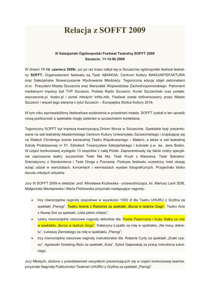 Relacja z SOFFT 2009 III Salezjański Ogólnopolski Festiwal Teatralny SOFFT 2009 Szczecin, 11-14.06.2009 W dniach 11-14. czerwca 2009r. już po raz trzeci odbył się w Szczecinie ogólnopolski festiwal teatralny SOFFT. Organizatorami festiwalu są Teatr ABANOIA, Centrum Kultury MANUARTEFAKTURA oraz Salezjańskie Stowarzyszenie Wychowania Młodzieży. Tegoroczną edycję objęli patronatami m.in. Prezydent Miasta Szczecina oraz Marszałek Województwa Zachodniopomorskiego. Patronami medialnymi imprezy byli TVP Szczecin, Polskie Radio Szczecin, Kurier Szczeciński oraz portale: wszczecinie.pl, bosko.pl i portal młodych Ichtis.info. Festiwal został dofinansowany przez Miasto Szczecin i wsparł jego starania o tytuł Szczecin – Europejska Stolica Kultury 2016. W tym roku wprowadziliśmy festiwalowe wydarzenia w przestrzeń miasta. SOFFT zyskał w ten sposób nową publiczność a spektakle mogły zaistnieć w szczecińskim kontekście. Tegoroczny SOFFT był imprezą towarzyszącą Dniom Morza w Szczecinie. Spektakle były prezentowane na sali teatralnej Akademickiego Centrum Kultury Uniwersytetu Szczecińskiego i znajdującej się na Wałach Chrobrego scenie kameralnej Teatru Współczesnego – Malarni, a także w sali teatralnej Szkoły Podstawowej nr 51, Szkołach Towarzystwa Salezjańskiego i kościele p.w. św. Jana Bosko. W części konkursowej wystąpiło 13 zespołów z całej Polski. Zaprezentowały się także cztery specjalnie zaproszone teatry: szczeciński Teatr Nie Ma, Teatr Krzyk z Maszewa, Teatr SakralnoDramatyczny z Sandomierza i Teatr Droga z Poznania. Podczas festiwalu uczestnicy mieli okazję wziąć udział w warsztatach, koncertach i wernisażach wystaw fotograficznych. Przyjechało blisko dwustu młodych artystów. Jury III SOFFT 2009 w składzie: prof. Mirosława Kozłowska - przewodnicząca, ks. Mariusz Lach SDB, Małgorzata Maciejewska i Maria Piórkowska przyznało następujące nagrody: • trzy równorzędne nagrody zespołowe w wysokości 1000 zł dla Teatru UHURU z Gryfina za spektakl „Pierogi”, Teatru Scene z Radomia za spektakl „Burza w teatrze Gogo”, Teatru Avis z Nowej Soli za spektakl „Usta pełne chleba”; • cztery równorzędne rzeczowe nagrody aktorskie dla: Pawła Petermana i Kuby Sałka za role w spektaklu „Burza w teatrze Gogo”, Katarzyny Łopatki za rolę w spektaklu „Na mocy dekretu”, Łukasza Ziemskiego za rolę w spektaklu „Pierogi”; • trzy równorzędne rzeczowe nagrody instruktorskie dla: Roberta Cyrty za spektakl „Znaki czasu”, Agnieszki Grewling-Stolc za spektakl „Kula”, Sylwii Gajewskiej za pracę instruktora szkolnego. Jury Młodych, złożone z przedstawicieli wszystkich prezentujących się w części konkursowej teatrów, przyznało Nagrodę Publiczności Teatrowi UHURU z Gryfina za spektakl „Pierogi”. Nagrodę Inspektora Inspektorii Pilskiej Towarzystwa Salezjańskiego przyznano teatrowi Grupa Litki z Piły za spektakl „Przystanek”. Fotoreporterzy akredytowani przy III SOFFT 2009, reprezentowani przez fotografików skupionych w grupie FotoManu, przyznali swoje nagrody Teatrowi Scene z Radomia oraz Teatrowi Bezpośrednikuff z Gdańska. Tegoroczny SOFFT cieszył się ogromnym zainteresowaniem widzów. W Malarni zabrakło miejsca dla wszystkich zainteresowanych wydarzeniami festiwalowymi, a Sala Admiralska Akademickiego Centrum Kultury pękała w szwach. Różnorodność tematyki, form i języka scenicznych wypowiedzi dała każdemu z widzów szansę na doświadczenie tego, co go w teatrze najbardziej porusza i interesuje. Młodzi artyści rozmawiali z publicznością o istotnych dla nich sprawach, posługując się własnym, oryginalnym językiem artystycznego przekazu. Nie unikali trudnych tematów, mówili często od siebie, czyniąc spektakl bardzo osobistym. Posługiwali się własną estetyką, czerpiąc inspirację z teatru słowa, poezji, muzyki i otaczającej ich rzeczywistości. Ta ogromna różnorodność tematyki i formy, różnice w poziomie artystycznej dojrzałości i biegłości warsztatowej oraz atmosfera spotkania i dialogu stanowiły największe bogactwo tegorocznego SOFFT. Stanowią one także punkt wyjścia do dyskusji o artystycznym kierunku rozwoju szybko dojrzewającego festiwalu, który swoją otwartością przekonuje do siebie coraz ciekawsze młode teatry z całej Polski. Organizatorzy dziękują za pomoc w organizacji festiwalu p. Mirosławowi Gawędzie – Dyrektorowi Teatru Współczesnego w Szczecinie, p. Piotrowi Klimkowi – Dyrektorowi Akademickiego Centrum Kultury, p. Irenie Lewandowskiej – Dyrektorce Szkoły Podstawowej nr 51, ks. Zbigniewowi Hulowi SDB – Proboszczowi parafii p.w. św. Jana Bosko, ks. Markowi Zaborowskiemu SDB – Dyrektorowi Liceum Ogólnokształcącego Towarzystwa Salezjańskiego, ks. Mariuszowi Słomińskiemu SDB – Dyrektorowi Bursy Towarzystwa Salezjańskiego, firmie TAST Jana Tabińskiego, zespołowi BADFOLK, Jurorom, instruktorom prowadzącym warsztaty, akredytowanym przy festiwalu dziennikarzom i fotoreporterom, przedstawicielom Salezjańskiej Grupy Medialnej „Art. 43” oraz wszystkim Wolontariuszom. dyrektor artystyczny III SOFFT 2009 Konrad Pachciarek Za: www.soft.eu