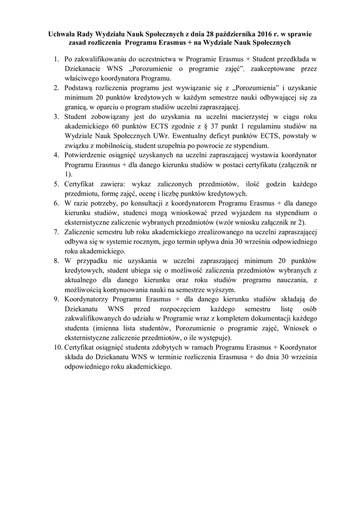 Uchwała Rady Wydziału Nauk Społecznych z dnia 28 października 2016 r. w sprawie zasad rozliczenia Programu Erasmus + na Wydziale Nauk Społecznych 1. Po zakwalifikowaniu do uczestnictwa w Programie Erasmus + Student przedkłada w Dziekanacie WNS „Porozumienie o programie zajęć”, zaakceptowane przez właściwego koordynatora Programu. 2. Podstawą rozliczenia programu jest wywiązanie się z „Porozumienia” i uzyskanie minimum 20 punktów kredytowych w każdym semestrze nauki odbywającej się za granicą, w oparciu o program studiów uczelni zapraszającej. 3. Student zobowiązany jest do uzyskania na uczelni macierzystej w ciągu roku akademickiego 60 punktów ECTS zgodnie z § 37 punkt 1 regulaminu studiów na Wydziale Nauk Społecznych UWr. Ewentualny deficyt punktów ECTS, powstały w związku z mobilnością, student uzupełnia po powrocie ze stypendium. 4. Potwierdzenie osiągnięć uzyskanych na uczelni zapraszającej wystawia koordynator Programu Erasmus + dla danego kierunku studiów w postaci certyfikatu (załącznik nr 1). 5. Certyfikat zawiera: wykaz zaliczonych przedmiotów, ilość godzin każdego przedmiotu, formę zajęć, ocenę i liczbę punktów kredytowych. 6. W razie potrzeby, po konsultacji z koordynatorem Programu Erasmus + dla danego kierunku studiów, studenci mogą wnioskować przed wyjazdem na stypendium o eksternistyczne zaliczenie wybranych przedmiotów (wzór wniosku załącznik nr 2). 7. Zaliczenie semestru lub roku akademickiego zrealizowanego na uczelni zapraszającej odbywa się w systemie rocznym, jego termin upływa dnia 30 września odpowiedniego roku akademickiego. 8. W przypadku nie uzyskania w uczelni zapraszającej minimum 20 punktów kredytowych, student ubiega się o możliwość zaliczenia przedmiotów wybranych z aktualnego dla danego kierunku oraz roku studiów programu nauczania, z możliwością kontynuowania nauki na semestrze wyższym. 9. Koordynatorzy Programu Erasmus + dla danego kierunku studiów składają do Dziekanatu WNS przed rozpoczęciem każdego semestru listę osób zakwalifikowanych do udziału w Programie wraz z kompletem dokumentacji każdego studenta (imienna lista studentów, Porozumienie o programie zajęć, Wniosek o eksternistyczne zaliczenie przedmiotów, o ile występuje). 10. Certyfikat osiągnięć studenta zdobytych w ramach Programu Erasmus + Koordynator składa do Dziekanatu WNS w terminie rozliczenia Erasmusa + do dnia 30 września odpowiedniego roku akademickiego. Załącznik nr 1 Wrocław, dnia ………………. Certyfikat osiągnięć studenta zdobytych w ramach programu ERASMUS + Pan/i ………………………………… student/ka ………. roku studiów nie/stacjonarnych na kierunku …………………………………, w ramach programu ERASMUS + zaliczyła …….. semestr studiów. Na ………………………………………………. (nazwa uczelni) student/ka zaliczył/a przedmioty wynikające z zatwierdzonego przez uczelnię „Porozumienia o programie zajęć”, zdobywając wymagane minimum 20 punktów ECTS. Nazwa przedmiotu Ilość ECTS * - skala stosowana w uczelni przyjmującej ** - skala polska ………………………………………. Pieczęć i podpis koordynatora Ilość godzin Forma zajęć Ocena * Ocena ** Załącznik nr 2 Wniosek o eksternistyczne zaliczenie przedmiotu w trakcie uczestnictwa w Programie ERASMUS + .............................................................. Wrocław, dnia .…………… (imię i nazwisko) .............................................................. (kierunek studiów, semestr studiów) ............................................................... (Tryb: stacjonarne/niestacjonarne) ............................................................... (Rodzaj: I stopnia/ II stopnia) Prodziekan ds. Kształcenia Dr hab. Jacek Zieliński Zwracam się z prośbą o możliwość eksternistycznego realizowania następujących przedmiotów z semestru ...... w trakcie pobytu na uczelni ........................................................................................................... w ramach programu ERASMUS + Lp. Nazwa przedmiotu Liczba Wykład / godzin ćwiczenia Ilość punktów ECTS 1. 2. 3. 4. 5. Przedmioty z semestrów zimowego i letniego należy rozliczyć do 30 września odpowiedniego roku akademickiego ………………………………………. Podpis studenta / studentki Opinia koordynatora: ………………………………………….... ………………………………………. Data, pieczęć i podpis koordynatora