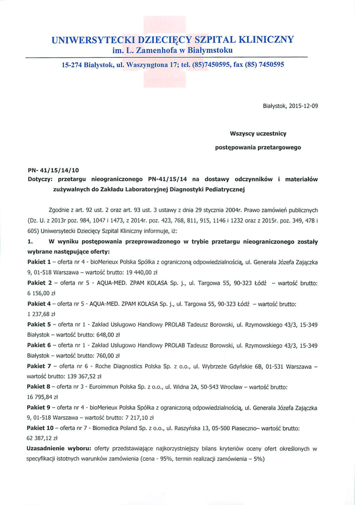 Pakiet 10 - oferta nr 7 - Biomedica Poland Sp. z 0.0., ul. Raszyriska 13, 05-500 Piaseczno- wartosc brutto: