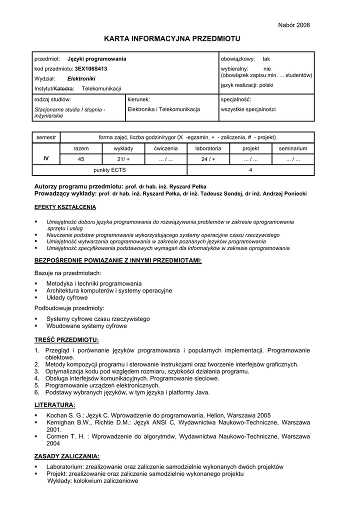 Nabór 2008 KARTA INFORMACYJNA PRZEDMIOTU przedmiot: Języki programowania obowiązkowy: kod przedmiotu: 3EX106S413 Wydział: wybieralny: nie (obowiązek zapisu min. ... studentów) Elektroniki Instytut/Katedra: tak język realizacji: polski Telekomunikacji rodzaj studiów: kierunek: specjalność: Stacjonarne studia I stopnia inżynierskie Elektronika i Telekomunikacja wszystkie specjalności semestr forma zajęć, liczba godzin/rygor (X -egzamin, + - zaliczenia, # - projekt) razem wykłady ćwiczenia laboratoria projekt seminarium 45 21/ + ... / ... 24 / + ... / ... ... / ... IV punkty ECTS 4 Autorzy programu przedmiotu: prof. dr hab. inż. Ryszard Pełka Prowadzący wykłady: prof. dr hab. inż. Ryszard Pełka, dr inż. Tadeusz Sondej, dr inż. Andrzej Poniecki EFEKTY KSZTAŁCENIA Umiejętność doboru języka programowania do rozwiązywania problemów w zakresie oprogramowania sprzętu i usług Nauczenie podstaw programowania wykorzystującego systemy operacyjne czasu rzeczywistego Umiejętność wytwarzania oprogramowania w zakresie poznanych języków programowania Umiejętność specyfikowania podstawowych wymagań dla informatyków w zakresie oprogramowania BEZPOŚREDNIE POWIĄZANIE Z INNYMI PRZEDMIOTAMI: Bazuje na przedmiotach: Metodyka i techniki programowania Architektura komputerów i systemy operacyjne Układy cyfrowe Podbudowuje przedmioty: Systemy cyfrowe czasu rzeczywistego Wbudowane systemy cyfrowe TREŚĆ PRZEDMIOTU: 1. Przegląd i porównanie języków programowania i popularnych implementacji. Programowanie obiektowe. 2. Metody kompozycji programu i sterowanie instrukcjami oraz tworzenie interfejsów graficznych. 3. Optymalizacja kodu pod względem rozmiaru, szybkości działania programu. 4. Obsługa interfejsów komunikacyjnych. Programowanie sieciowe. 5. Programowanie urządzeń elektronicznych. 6. Podstawy wybranych języków, w tym języka i platformy Java. LITERATURA: Kochan S. G.: Język C. Wprowadzenie do programowania, Helion, Warszawa 2005 Kernighan B.W., Richtie D.M.: Język ANSI C, Wydawnictwa Naukowo-Techniczne, Warszawa 2001. Cormen T. H. : Wprowadzenie do algorytmów, Wydawnictwa Naukowo-Techniczne, Warszawa 2004 ZASADY ZALICZANIA: Laboratorium: zrealizowanie oraz zaliczenie samodzielnie wykonanych dwóch projektów Projekt: zrealizowanie oraz zaliczenie samodzielnie wykonanego projektu Wykłady: kolokwium zaliczeniowe