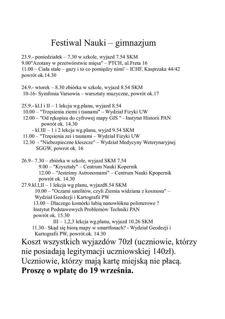 Festiwal Nauki – gimnazjum 23.9.- poniedziałek – 7.30 w szkole, wyjazd 7.54 SKM 9.00"Azotany w przetwórstwie mięsa" – PTCH, ul.Freta 16 11.00 – Ciała stałe – gazy i to co pomiędzy nimi' – ICHF, Kasprzaka 44/42 powrót ok.14.30 24.9.- wtorek – 8.30 zbiórka w szkole, wyjazd 8.54 SKM 10-16- Symfonia Varsowia – warsztaty muzyczne, powrót ok.17 25.9.- kl.I i II – 1 lekcja wg.planu, wyjazd 8.54 10.00 – "Trzęsienia ziemi i tsunami" – Wydział Fizyki UW 12.00 – "Od rękopisu do cyfrowej mapy GIS " - Instytut Historii PAN powrót ok. 14.30 - kl.III – 1 i 2 lekcja wg.planu, wyjzd 9.54 SKM 11.00 – "Trzęsienia zei i tsunami – Wydział Fizyki UW 12.30 - "Niebezpieczne kleszcze" – Wydział Medycyny Weterynaryjnej SGGW, powrot ok. 16 26.9– 7.30 – zbiórka w szkole, wyjazd SKM 7.54 9.00 – "Kryształy" – Centrum Nauki Kopernik 12.00 – "Jesteśmy Astronomami" – Centrum Nauki Kpopernik powrót ok. 14.30 27.9.kl.I,II – 1 lekcja wg planu, wyjazd8.54 SKM 10.00 – "Oczami satelitów, czyli Ziemia widziana z kosmosu" – Wydział Geodezji i Kartografii PW 13.00 – Dlaczego komórki lubią nanowłókna polimerowe ? Instytut Podstawowych Problemów Techniki PAN powrót ok. 15.30 III – 1,2,3 lekcja wg.planu, wyjazd 10.26 SKM 11.30– Skąd się biorą mapy w smartfonach? - Wydział Geodezji i Kartografii PW, powrót.ok. 14.30 Koszt wszystkich wyjazdów 70zł (uczniowie, którzy nie posiadają legitymacji uczniowskiej 140zł). Uczniowie, którzy mają kartę miejską nie płacą. Proszę o wpłatę do 19 września. Festiwal Nauki-szkoła podstawowa 26.9 – kl.IV – „Jak liczyli Rzymianie: rzymski sposób zapisywania liczb. Zbiórka w szkole 8.00 - wyjazd 8.24 SKM 10.00 –lekcja festiwalowa na Zamku Królewskim, powrót.ok. godz. 12.30 , lekcja 6,7 wg planu Kl.V i VI – „Rzeźbienie rzeczywistości laserem“ – Wydział Geodezji i Kartografii PW. Zbiórka w szkole 8.00, wyjazd 8.24 SKM, powrót ok.12.30 6 lekcja wg planu. Koszt wyjazdu 12zł (uczniowie bez legitymacji 24zł). Uczniowie, którzy posiadają kartę miejską nie płacą.