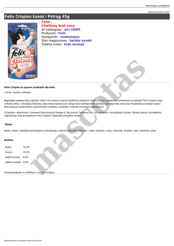 Informacje o produkcie Utworzono 08-03-2017 Felix Crispies Łosoś i Pstrąg 45g Cena : Chwilowy brak ceny Felix Crispies to pyszne przekąski dla kota. ● Smak łososia i pstrąga co ta s Nr katalogowy : mls-10005 Producent : Felix Dostępność : niedostępny Stan magazynowy : bardzo wysoki Średnia ocena : brak recenzji Nagradzaj swojego kota częściej i dziel z nim jeszcze więcej wspólnych psotnych chwil! Kusząco wypełnione powietrzem przekąski Felix Crispies mają unikalną lekką i chrupiącą teksturę, abyś mógł rozpieszczać swego kota każdego dnia. Zaskocz swojego kota smaczną chrupkością w każdym kęsie i ekscytującym połączeniem wyśmienitych smaków, kształtów i kolorów w każdym opakowaniu! Z białkiem, witaminami i kwasami tłuszczowymi Omega 6, aby pomóc Twojemu kotu żyć zdrowym i szczęśliwym życiem. Możesz poczuć się świetnie, nagradzając kota przekąskami Felix Crispies! Wypróbuj wszystkie smaki! Skład: m as zboża, mięso i produkty pochodzenia zwierzęcego, roślinne ekstrakty białkowe , oleje i tłuszcze, cukry, minerały, drożdże, ryby i produkty rybne Analiza: białko 31,5% tłuszcz 15,5% popiół surowy 8,5% włókno surowe 0,5%. Przechowywanie: w chłodnym i suchym miejscu. Wygenerowano w programie www.oscGold.com